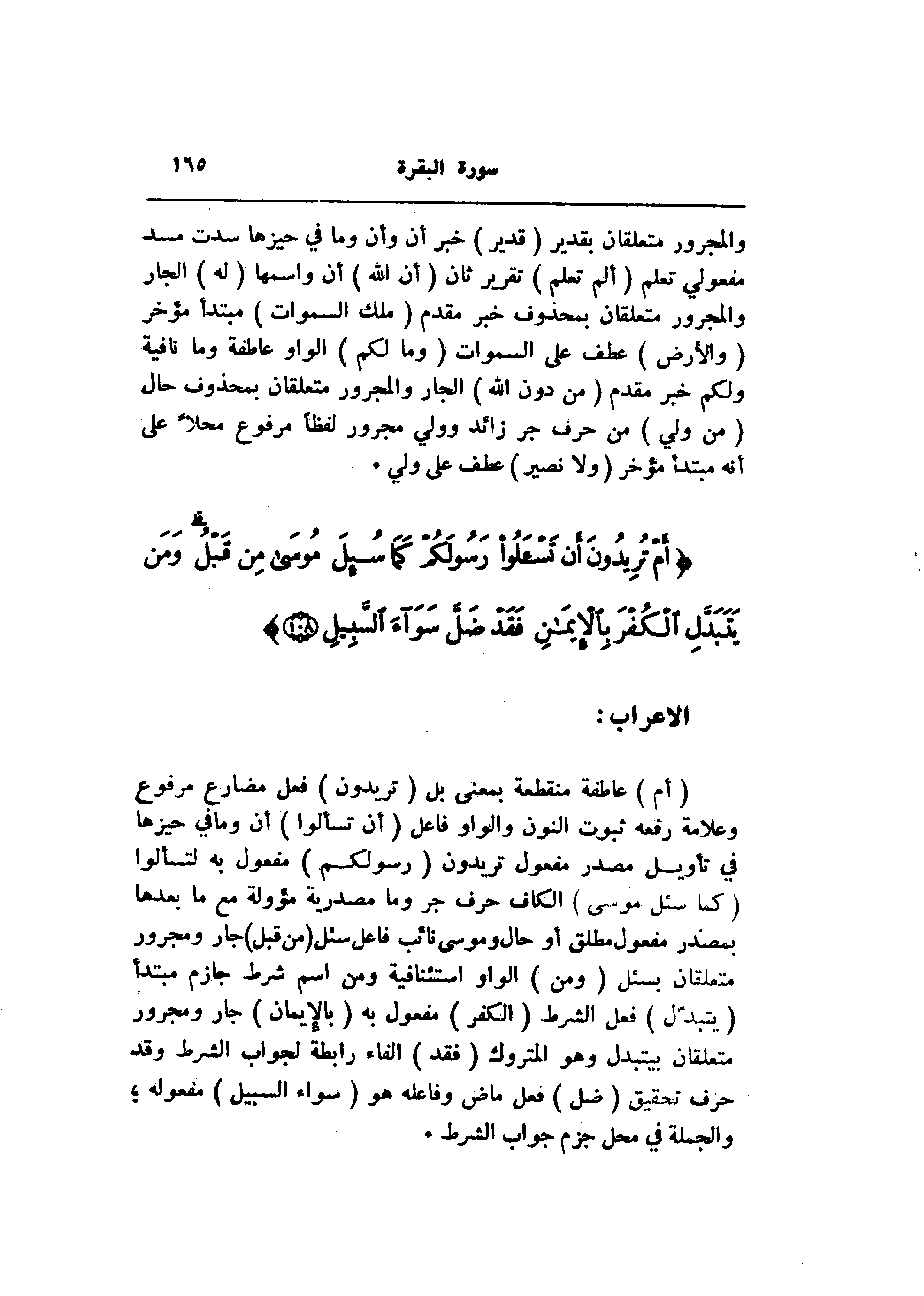 (أَمْ) عاطفة منقطعة بمعنى بل (تُرِيدُونَ) فعل مضارع مرفوع وعلامة رفعه ثبوت النون والواو فاعل (أَنْ تَسْئَلُوا) أن وما في حيزها في تأويل مصدر مفعول تريدون (رَسُولَكُمْ) مفعول به لتسألوا (كَما سُئِلَ مُوسى) الكاف حرف جر وما مصدرية مؤولة مع ما بعدها بمصدر مفعول مطلق أو حال وموسى نائب فاعل سئل (مِنْ قَبْلُ) جار ومجرور متعلقان بسئل (وَمَنْ) الواو استئنافية ومن اسم شرط جازم مبتدأ (يَتَبَدَّلِ) فعل الشرط (الْكُفْرَ) مفعول به (بِالْإِيمانِ) جار ومجرور متعلقان بيتبدل وهو المتروك (فَقَدْ) الفاء رابطة لجواب الشرط وقد حرف تحقيق (ضَلَّ) فعل ماض وفاعله هو (سَواءَ السَّبِيلِ) مفعوله والجملة في محل جزم جواب الشرط.