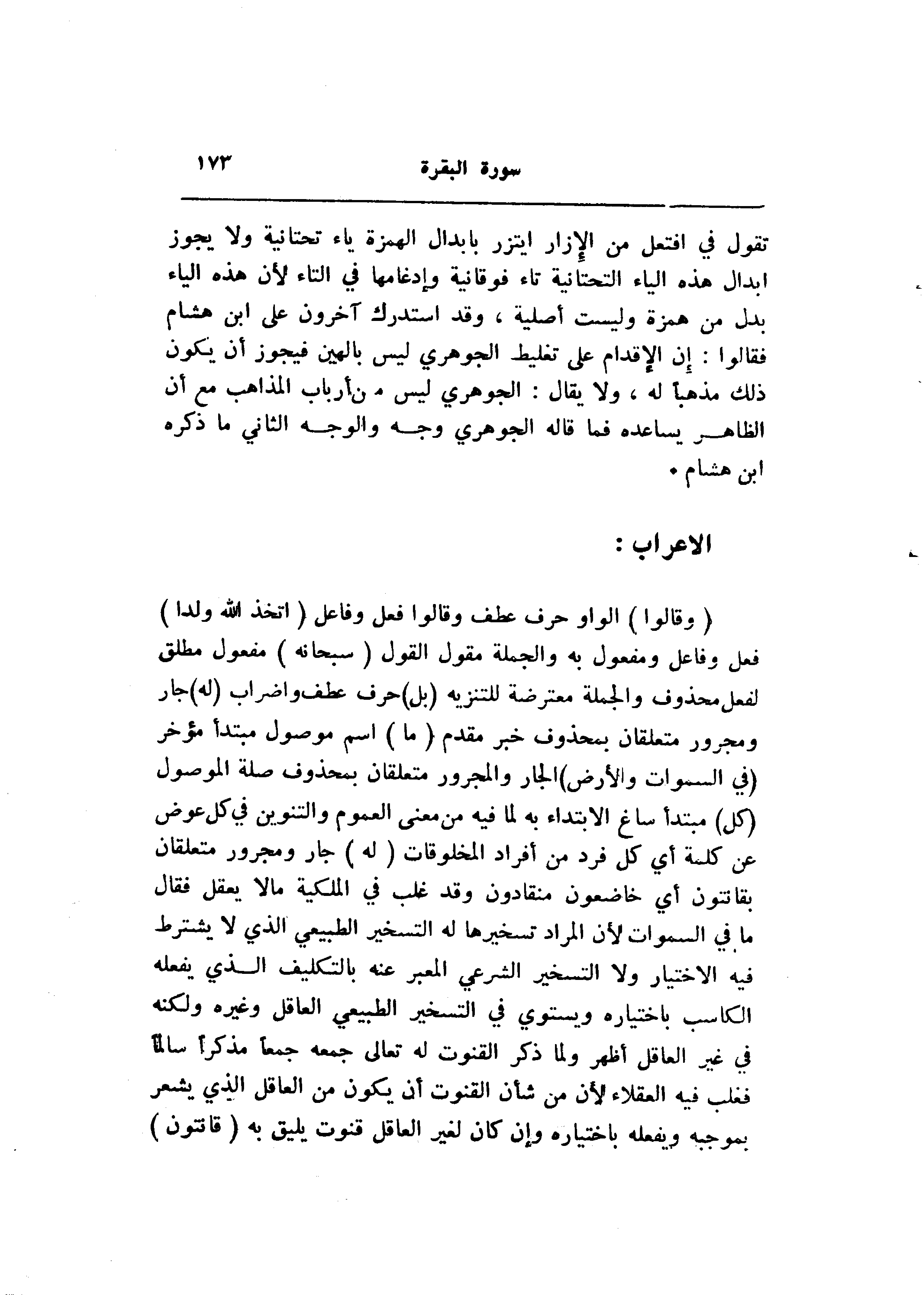 (وَقالُوا) الواو حرف عطف وقالوا فعل وفاعل (اتَّخَذَ اللَّهُ وَلَداً) فعل وفاعل ومفعول به والجملة مقول القول (سُبْحانَهُ) مفعول مطلق لفعل محذوف والجملة معترضة للتنزيه (بَلْ) حرف عطف وإضراب (لَهُ) جار ومجرور متعلقان بمحذوف خبر مقدم (ما) اسم موصول مبتدأ مؤخر (فِي السَّماواتِ وَالْأَرْضِ) الجار والمجرور متعلقان بمحذوف صلة الموصول (كُلٌّ) مبتدأ ساغ الابتداء به لما فيه من معنى العموم والتنوين في كل عوض عن كلمة أي كل فرد من أفراد المخلوقات (لَهُ) جار ومجرور متعلقان بقانتون أي خاضعون منقادون وقد غلب في الملكية ما لا يعقل فقال ما في السموات لأن المراد تسخيرها له التسخير الطبيعي الذي لا يشترط فيه الاختيار ولا التسخير الشرعي المعبر عنه بالتكليف الذي يفعله الكاسب باختياره ويستوي في التسخير الطبيعي العاقل وغيره ولكنه في غير العاقل أظهر ولما ذكر القنوت له تعالى جمعه جمعا مذكرا سالما فغلب فيه العقلاء لأن من شأن القنوت أن يكون من العاقل الذي يشعر بموجبه ويفعله باختياره وإن كان لغير العاقل قنوت يليق به (قانِتُونَ)