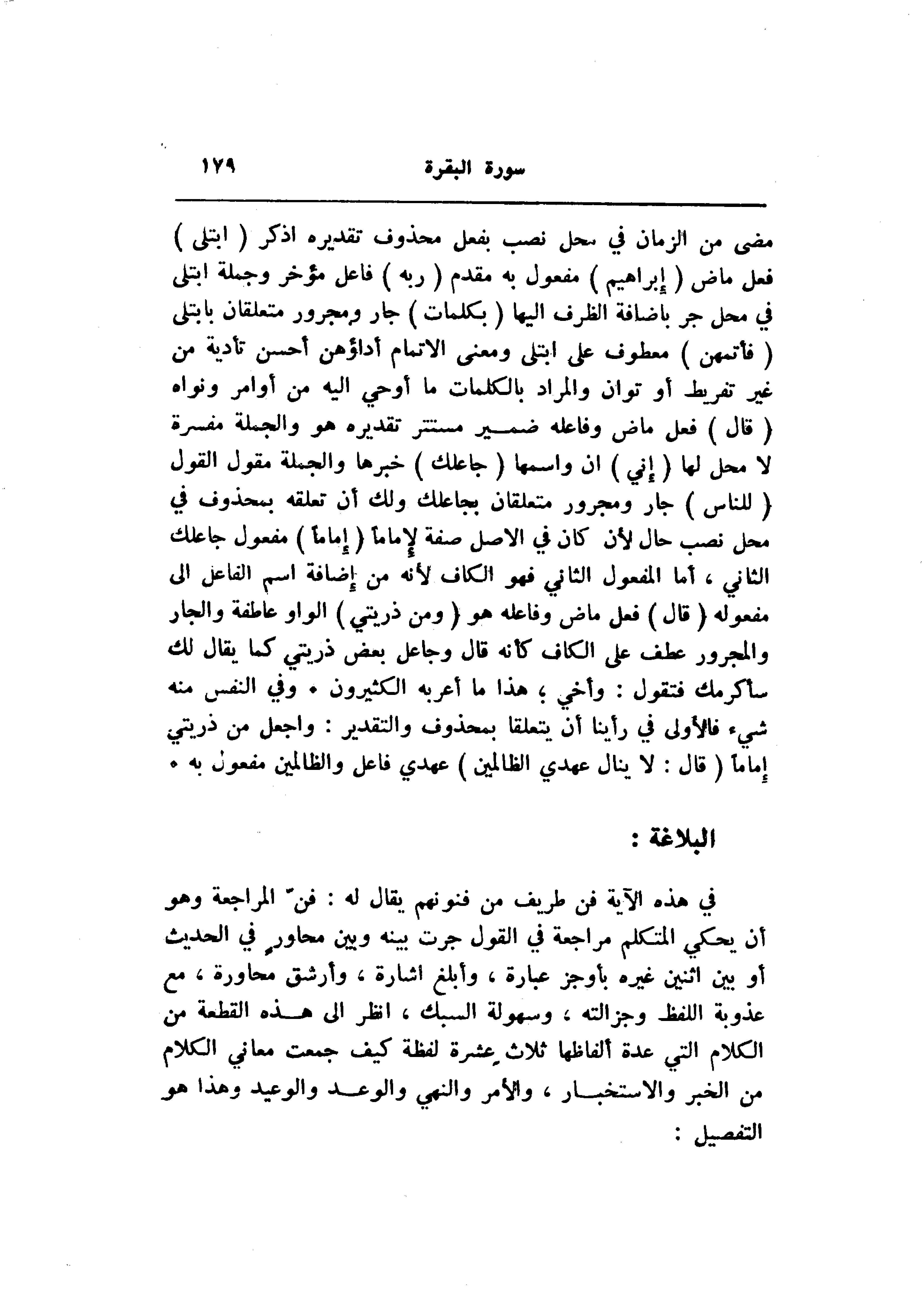 مضى من الزمان في محل نصب بفعل محذوف تقديره اذكر (ابْتَلى) فعل ماض (إِبْراهِيمَ) مفعول به مقدم (رَبُّهُ) فاعل مؤخر وجملة ابتلى في محل جر باضافة الظرف إليها (بِكَلِماتٍ) جار ومجرور متعلقان بابتلى (فَأَتَمَّهُنَّ) معطوف على ابتلى ومعنى الإتمام أداؤهن أحسن تأدية من غير تفريط أو توان والمراد بالكلمات ما أوحي اليه من أوامر ونواه (قالَ) فعل ماض وفاعله ضمير مستتر تقديره هو والجملة مفسرة لا محل لها (إِنِّي) ان واسمها (جاعِلُكَ) خبرها والجملة مقول القول (لِلنَّاسِ) جار ومجرور متعلقان بجاعلك ولك أن تعلقه بمحذوف في محل نصب حال لأن كان في الأصل صفة لإماما (إِماماً) مفعول جاعلك الثاني، أما المفعول الثاني فهو الكاف لأنه من إضافة اسم الفاعل الى مفعوله (قالَ) فعل ماض وفاعله هو (وَمِنْ ذُرِّيَّتِي) الواو عاطفة والجار والمجرور عطف على الكاف كأنه قال وجاعل بعض ذريتي كما يقال لك سأكرمك فتقول: وأخي هذا ما أعربه الكثيرون. وفي النفس منه شيء فالأولى في رأينا أن يتعلقا بمحذوف والتقدير: واجعل من ذريتي إماما (قالَ: لا يَنالُ عَهْدِي الظَّالِمِينَ) عهدي فاعل والظالمين مفعول به.