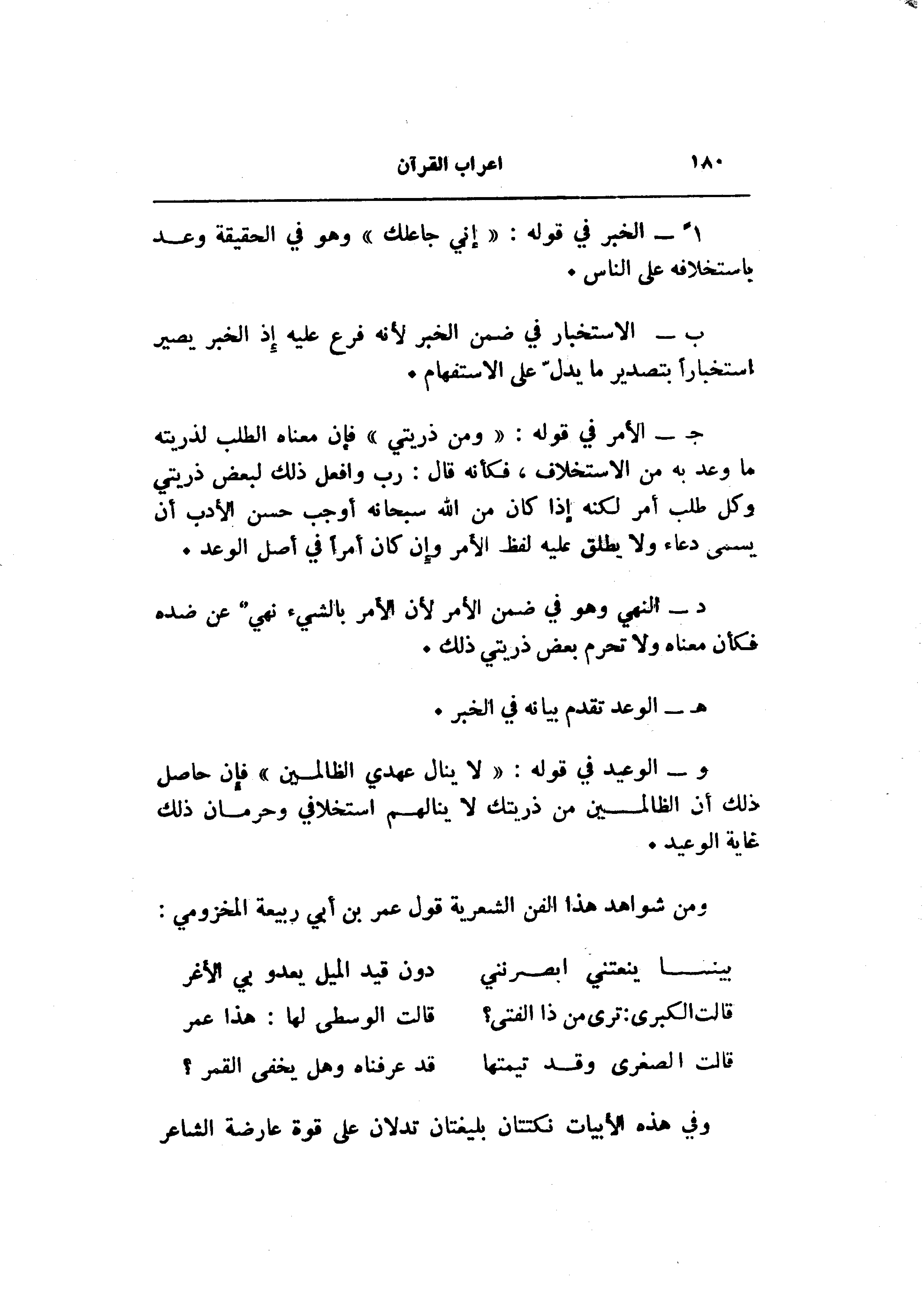 ج- الأمر في قوله: «ومن ذريتي» فإن معناه الطلب لذريته ما وعد به من الاستخلاف، فكأنه قال: رب وافعل ذلك لبعض ذريتي وكل طلب أمر لكنه إذا كان من الله سبحانه أوجب حسن الأدب أن يسمى دعاء ولا يطلق عليه لفظ الأمر وإن كان أمرا في أصل الوعد.