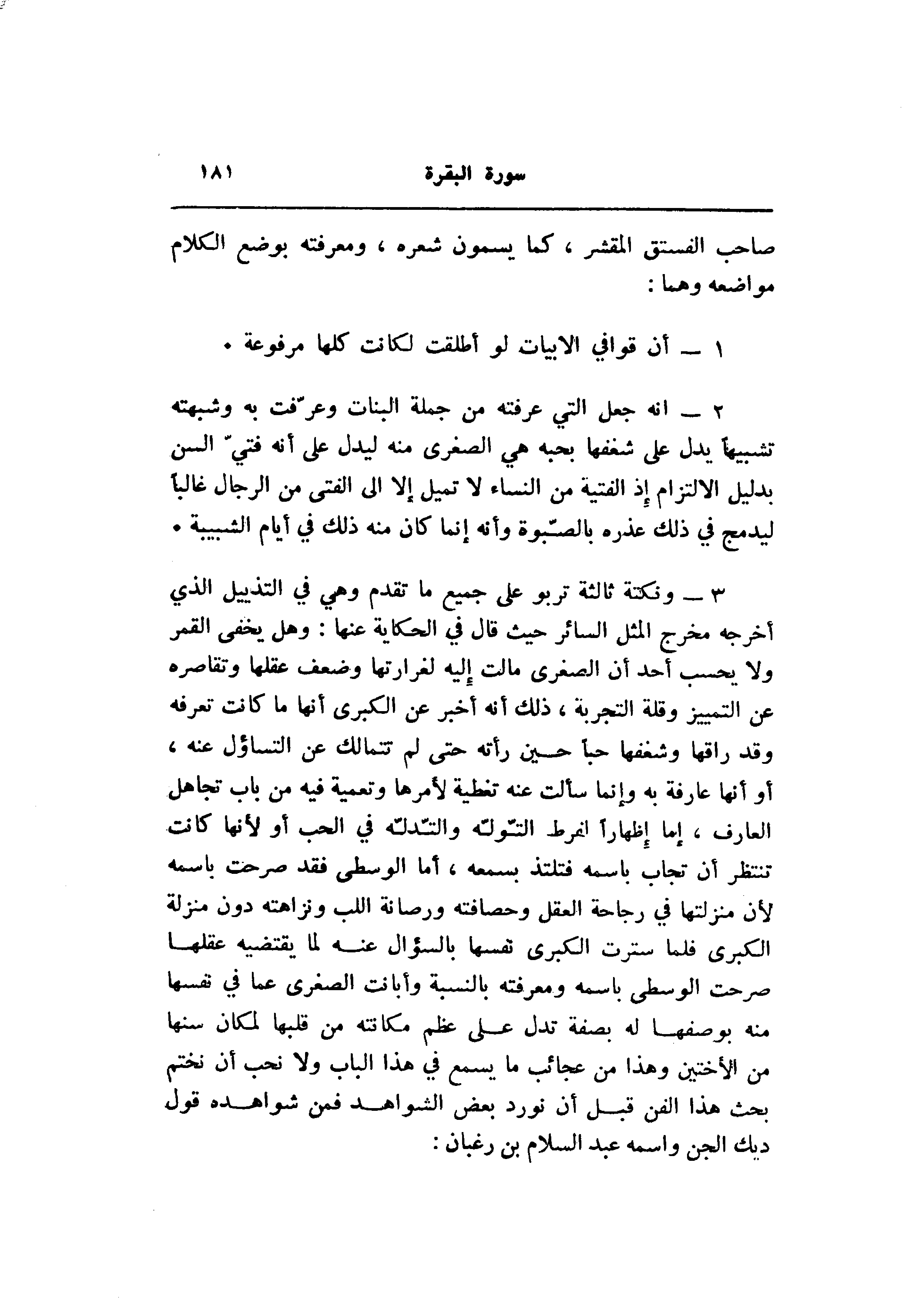 3- ونكتة ثالثة تربو على جميع ما تقدم وهي في التذييل الذي أخرجه مخرج المثل السائر حيث قال في الحكاية عنها: وهل يخفى القمر ولا يحسب أحد أن الصغرى مالت إليه لغرارتها وضعف عقلها وتقاصره عن التمييز وقلة التجربة، ذلك أنه أخبر عن الكبرى أنها ما كانت تعرفه وقد راقها وشغفها حبا حين رأته حتى لم تتمالك عن التساؤل عنه، أو أنها عارفة به وإنما سألت عنه تغطية لأمرها وتعمية فيه من باب تجاهل العارف، إما إظهارا لفرط التّولّه والتّدلّه في الحب أو لأنها كانت تنتظر أن تجاب باسمه فتلتذ بسمعه، أما الوسطى فقد صرحت باسمه لأن منزلتها في رجاحة العقل وحصافته ورصانة اللب ونزاهته دون منزلة الكبرى فلما سترت الكبرى نفسها بالسؤال عنه لما يقتضيه عقلها صرحت الوسطى باسمه ومعرفته بالنسبة وأبانت الصغرى عما في نفسها منه بوصفها له بصفة تدل على عظم مكانته من قلبها لمكان سنها من الأختين وهذا من عجائب ما يسمع في هذا الباب ولا نحب أن نختم بحث هذا الفن قبل أن نورد بعض الشواهد فمن شواهده قول ديك الجن واسمه عبد السلام بن رغبان: