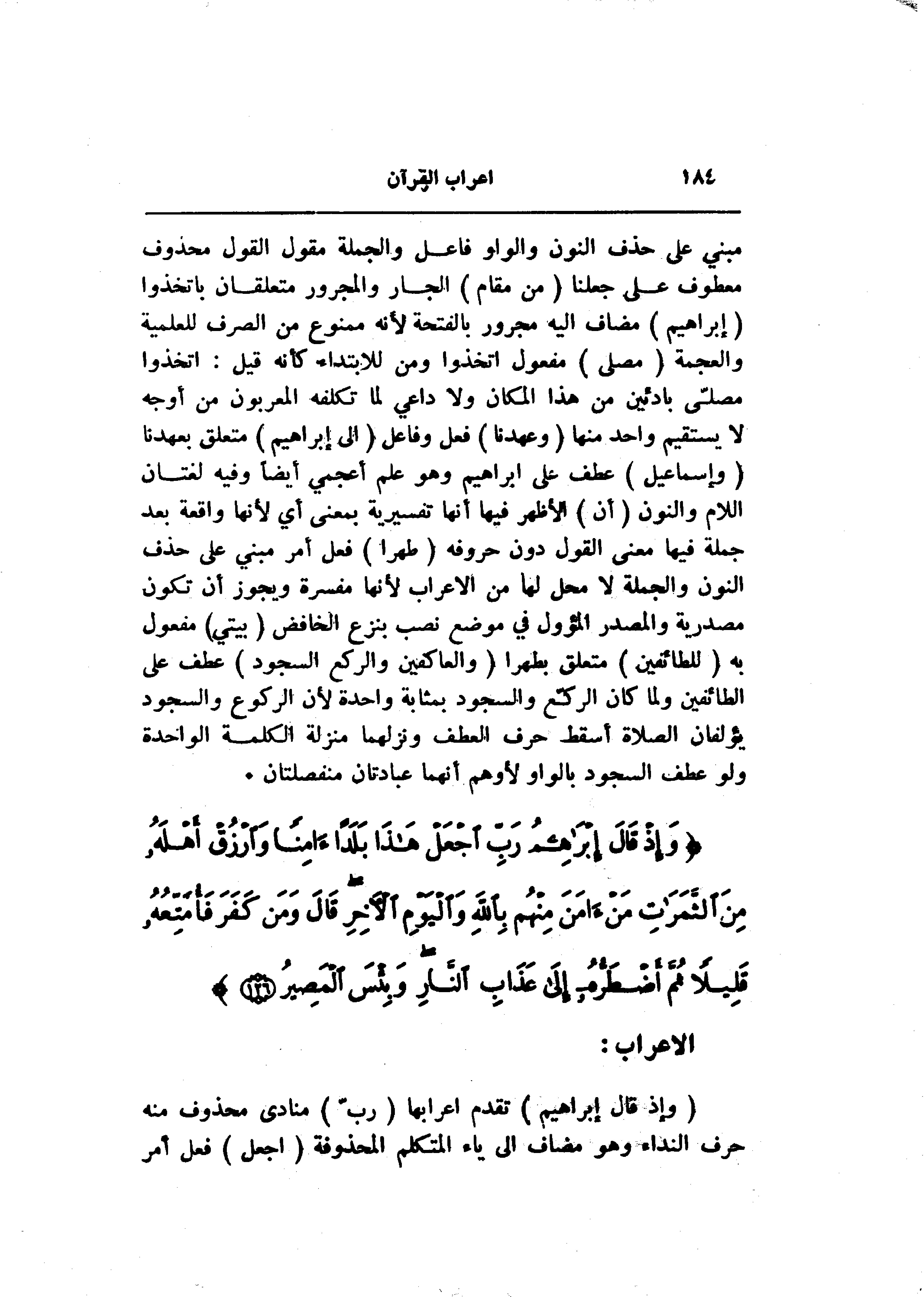 مبني على حذف النون والواو فاعل والجملة مقول القول محذوف معطوف على جعلنا (مِنْ مَقامِ) الجار والمجرور متعلقان باتخذوا (إِبْراهِيمَ) مضاف اليه مجرور بالفتحة لأنه ممنوع من الصرف للعلمية والعجمة (مُصَلًّى) مفعول اتخذوا ومن للابتداء كأنه قيل: اتخذوا مصلّى بادئين من هذا المكان ولا داعي لما تكلفه المعربون من أوجه لا يستقيم واحد منها (وَعَهِدْنا) فعل وفاعل (إِلى إِبْراهِيمَ) متعلق بعهدنا (وَإِسْماعِيلَ) عطف على ابراهيم وهو علم أعجمي أيضا وفيه لغتان اللام والنون (أَنْ) الأظهر فيها أنها تفسيرية بمعنى أي لأنها واقعة بعد جملة فيها معنى القول دون حروفه (طَهِّرا) فعل أمر مبني على حذف النون والجملة لا محل لها من الإعراب لأنها مفسرة ويجوز أن تكون مصدرية والمصدر المؤول في موضع نصب بنزع الخافض (بَيْتِيَ) مفعول به (لِلطَّائِفِينَ) متعلق بطهرا (وَالْعاكِفِينَ وَالرُّكَّعِ السُّجُودِ) عطف على الطائفين ولما كان الركّع والسجود بمثابة واحدة لأن الركوع والسجود يؤلفان الصلاة أسقط حرف العطف ونزلهما منزلة الكلمة الواحدة ولو عطف السجود بالواو لأوهم أنهما عبادتان منفصلتان.