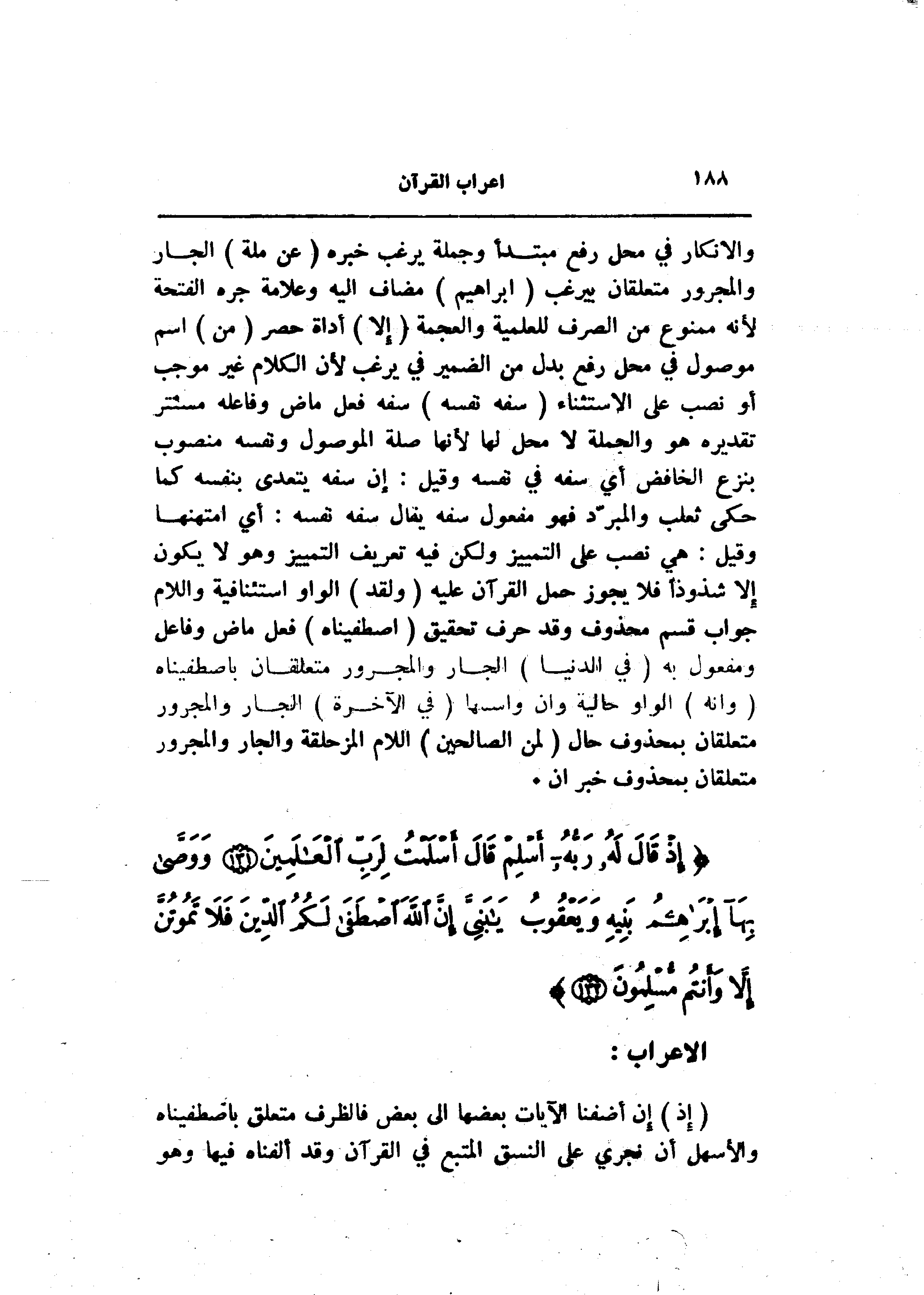 والإنكار في محل رفع مبتدأ وجملة يرغب خبره (عَنْ مِلَّةِ) الجار والمجرور متعلقان بيرغب (إِبْراهِيمَ) مضاف اليه وعلامة جره الفتحة لأنه ممنوع من الصرف للعلمية والعجمة (إِلَّا) أداة حصر (مَنْ) اسم موصول في محل رفع بدل من الضمير في يرغب لأن الكلام غير موجب أو نصب على الاستثناء (سَفِهَ نَفْسَهُ) سفه فعل ماض وفاعله مستتر تقديره هو والجملة لا محل لها لأنها صلة الموصول ونفسه منصوب بنزع الخافض أي سفه في نفسه وقيل: إن سفه يتعدى بنفسه كما حكى ثعلب والمبرّد فهو مفعول سفه يقال سفه نفسه: أي امتهنها وقيل: هي نصب على التمييز ولكن فيه تعريف التمييز وهو لا يكون إلا شذوذا فلا يجوز حمل القرآن عليه (وَلَقَدِ) الواو استئنافية واللام جواب قسم محذوف وقد حرف تحقيق (اصْطَفَيْناهُ) فعل ماض وفاعل ومفعول به (فِي الدُّنْيا) الجار والمجرور متعلقان باصطفيناه (وَإِنَّهُ) الواو حالية وان واسمها (فِي الْآخِرَةِ) الجار والمجرور متعلقان بمحذوف حال (لَمِنَ الصَّالِحِينَ) اللام المزحلقة والجار والمجرور متعلقان بمحذوف خبر ان.
