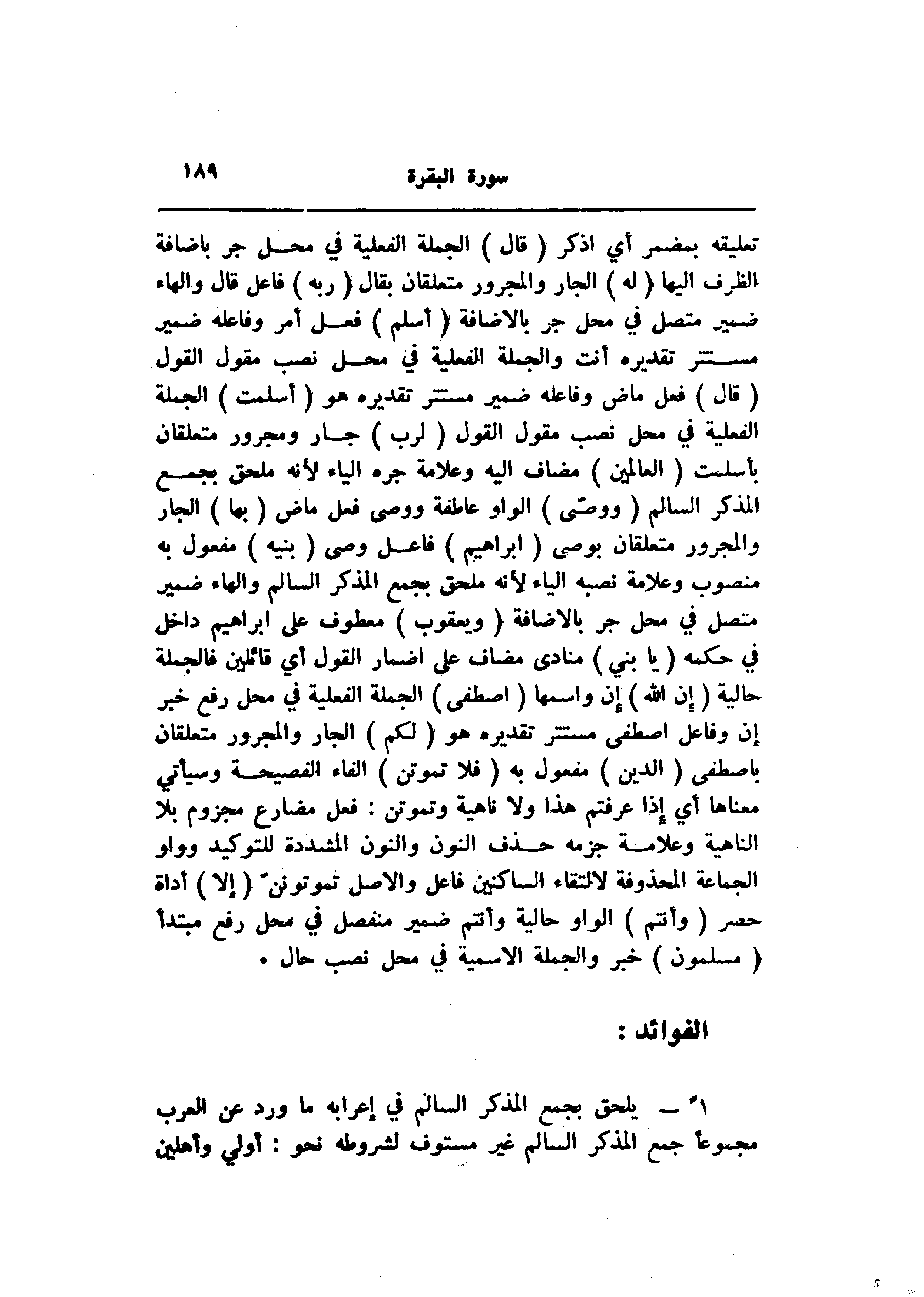 تعليقه بمضمر أي اذكر (قالَ) الجملة الفعلية في محل جر باضافة الظرف إليها (لَهُ) الجار والمجرور متعلقان بقال (رَبُّهُ) فاعل قال والهاء ضمير متصل في محل جر بالاضافة (أَسْلِمْ) فعل أمر وفاعله ضمير مستتر تقديره أنت والجملة الفعلية في محل نصب مقول القول (قالَ) فعل ماض وفاعله ضمير مستتر تقديره هو (أَسْلَمْتُ) الجملة الفعلية في محل نصب مقول القول (لِرَبِّ) جار ومجرور متعلقان بأسلمت (الْعالَمِينَ) مضاف اليه وعلامة جره الياء لأنه ملحق بجمع المذكر السالم (وَوَصَّى) الواو عاطفة ووصى فعل ماض (بِها) الجار والمجرور متعلقان بوصي (إِبْراهِيمُ) فاعل وصى (بَنِيهِ) مفعول به منصوب وعلامة نصبه الياء لأنه ملحق بجمع المذكر السالم والهاء ضمير متصل في محل جر بالاضافة (وَيَعْقُوبُ) معطوف على ابراهيم داخل في حكمه (يا بَنِيَّ) منادى مضاف على إضمار القول أي قائلين فالجملة حالية (إِنَّ اللَّهَ) إن واسمها (اصْطَفى) الجملة الفعلية في محل رفع خبر إن وفاعل اصطفى مستتر تقديره هو (لَكُمُ) الجار والمجرور متعلقان باصطفى (الدِّينَ) مفعول به (فَلا تَمُوتُنَّ) الفاء الفصيحة وسيأتي معناها أي إذا عرفتم هذا ولا ناهية وتموتن: فعل مضارع مجزوم بلا الناهية وعلامة جزمه حذف النون والنون المشددة للتوكيد وواو الجماعة المحذوفة لالتقاء الساكنين فاعل والأصل تموتوننّ (إِلَّا) أداة حصر (وَأَنْتُمْ) الواو حالية وأنتم ضمير منفصل في محل رفع مبتدأ (مُسْلِمُونَ) خبر والجملة الاسمية في محل نصب حال.