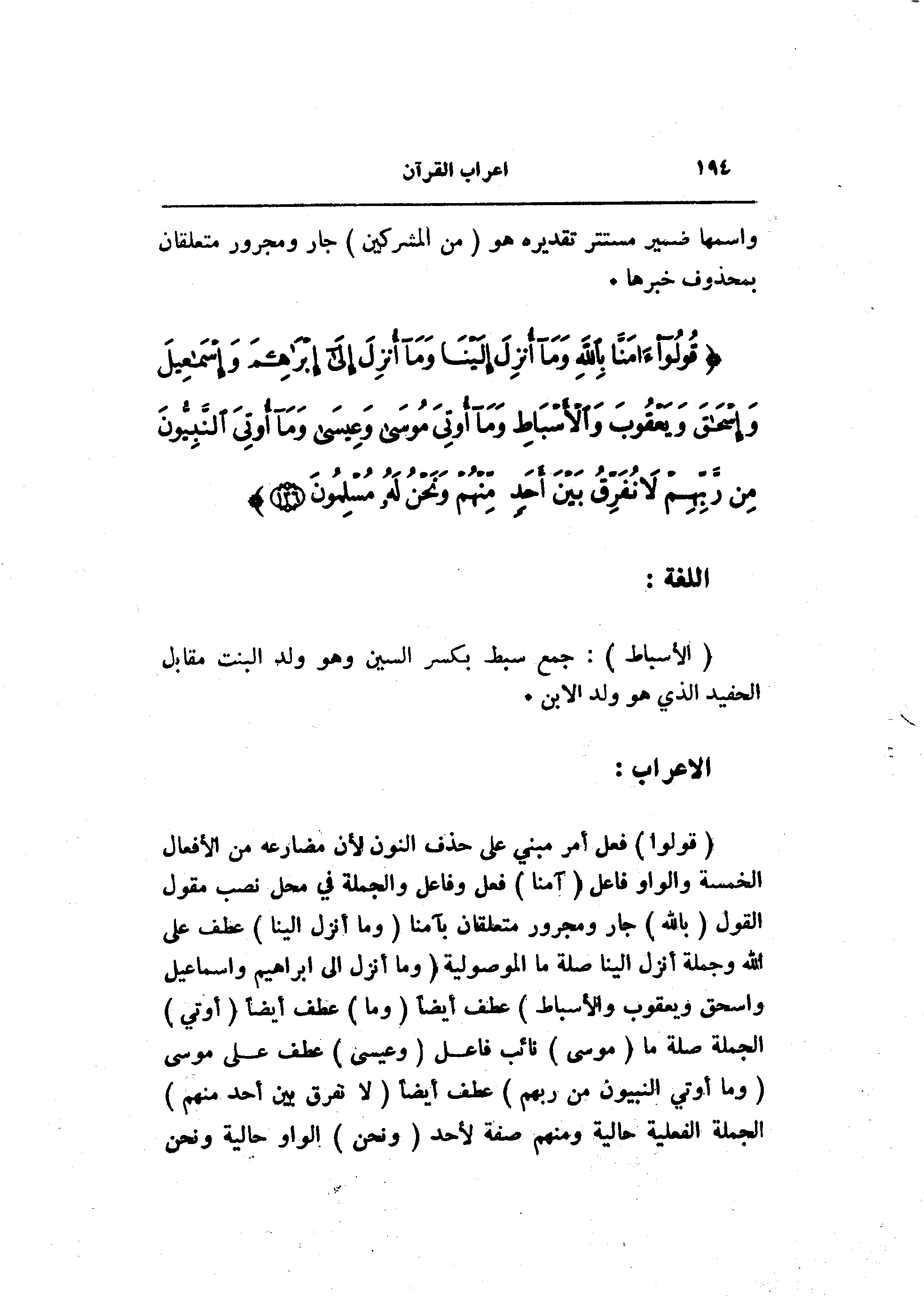 (قُولُوا) فعل أمر مبني على حذف النون لأن مضارعه من الأفعال الخمسة والواو فاعل (آمَنَّا) فعل وفاعل والجملة في محل نصب مقول القول (بِاللَّهِ) جار ومجرور متعلقان بآمنا (وَما أُنْزِلَ إِلَيْنا) عطف على الله وجملة أنزل إلينا صلة ما الموصولية (وَما أُنْزِلَ إِلى إِبْراهِيمَ وَإِسْماعِيلَ وَإِسْحاقَ وَيَعْقُوبَ وَالْأَسْباطِ) عطف أيضا (وَما) عطف أيضا (أُوتِيَ) الجملة صلة ما (مُوسى) نائب فاعل (وَعِيسى) عطف على موسى (وَما أُوتِيَ النَّبِيُّونَ مِنْ رَبِّهِمْ) عطف أيضا (لا نُفَرِّقُ بَيْنَ أَحَدٍ مِنْهُمْ) الجملة الفعلية حالية ومنهم صفة لأحد (وَنَحْنُ) الواو حالية ونحن