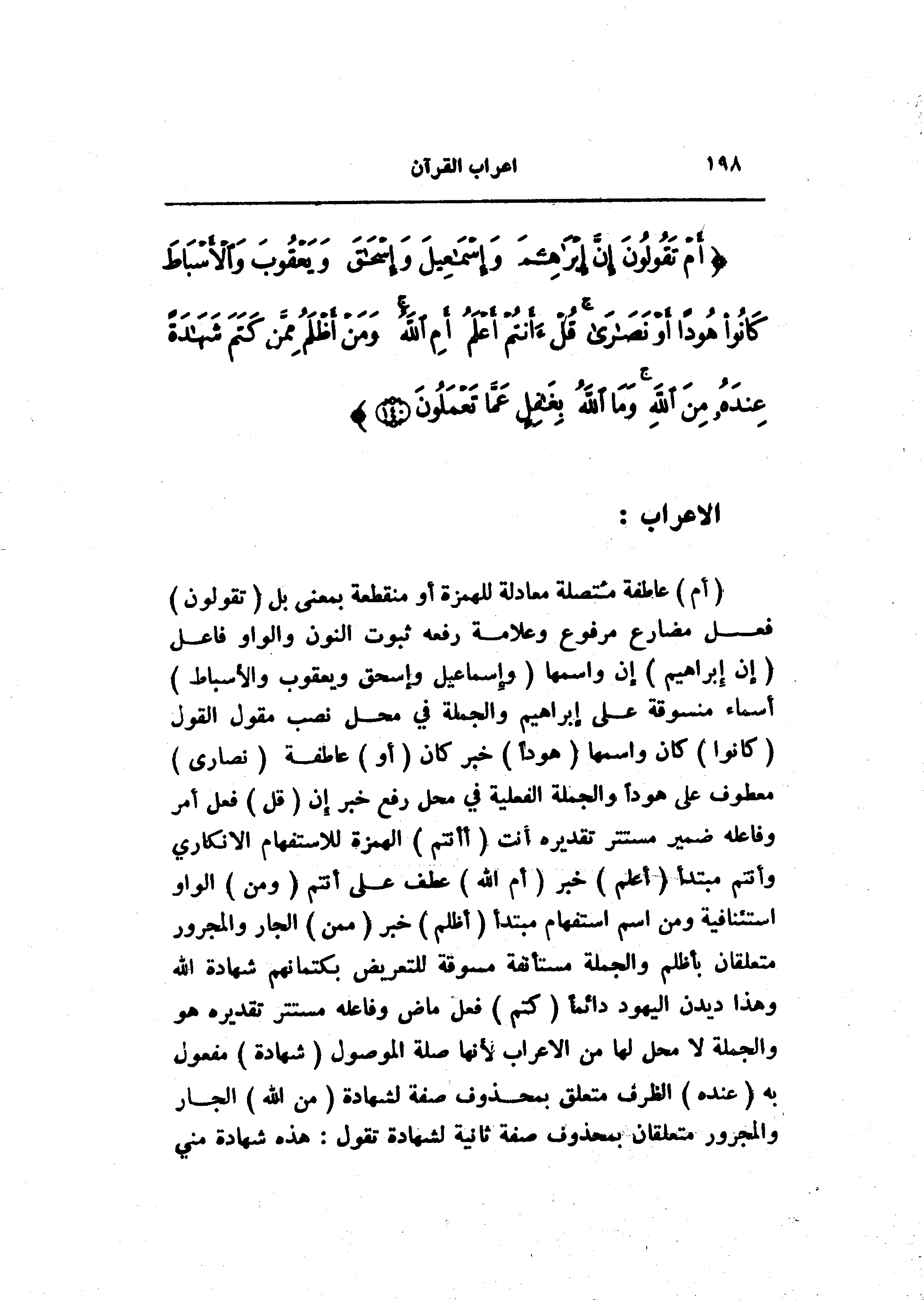 (أَمْ) عاطفة متصلة معادلة للهمزة أو منقطعة بمعنى بل (تَقُولُونَ) فعل مضارع مرفوع وعلامة رفعه ثبوت النون والواو فاعل (إِنَّ إِبْراهِيمَ) إن واسمها (وَإِسْماعِيلَ وَإِسْحاقَ وَيَعْقُوبَ وَالْأَسْباطَ) أسماء منسوقة على إبراهيم والجملة في محل نصب مقول القول (كانُوا) كان واسمها (هُوداً) خبر كان (أَوْ) عاطفة (نَصارى) معطوف على هودا والجملة الفعلية في محل رفع خبر إن (قُلْ) فعل أمر وفاعله ضمير مستتر تقديره أنت (أَأَنْتُمْ) الهمزة للاستفهام الانكاري وأنتم مبتدأ (أَعْلَمُ) خبر (أَمِ اللَّهُ) عطف على أنتم (وَمَنْ) الواو استئنافية ومن اسم استفهام مبتدأ (أَظْلَمُ) خبر (مِمَّنْ) الجار والمجرور متعلقان بأظلم والجملة مستأنفة مسوقة للتعريض بكتمانهم شهادة الله وهذا ديدن اليهود دائما (كَتَمَ) فعل ماض وفاعله مستتر تقديره هو والجملة لا محل لها من الإعراب لأنها صلة الموصول (شَهادَةً) مفعول به (عِنْدَهُ) الظرف متعلق بمحذوف صفة لشهادة (مِنَ اللَّهِ) الجار والمجرور متعلقان بمحذوف صفة ثانية لشهادة تقول: هذه شهادة مني
