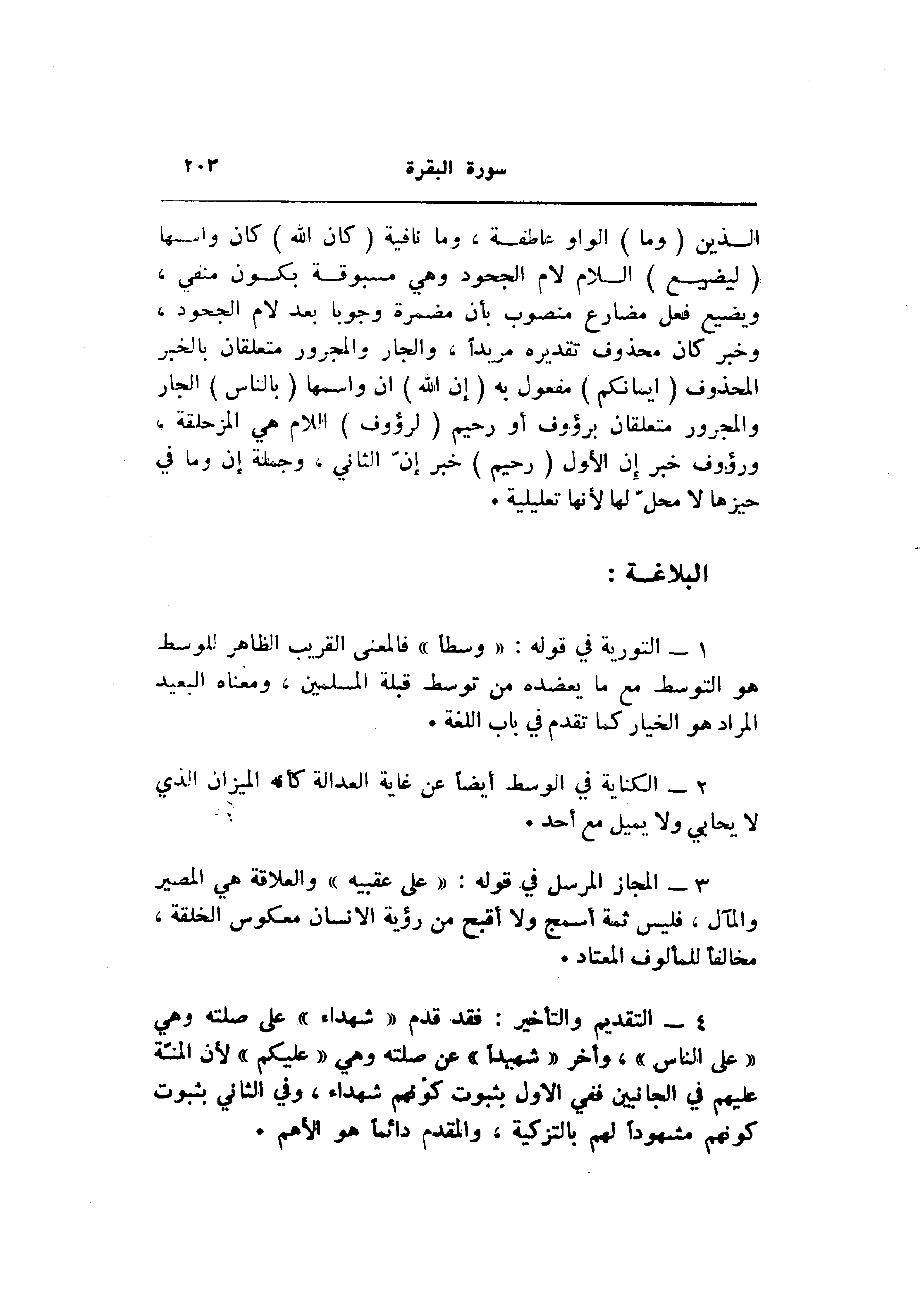 4- التقديم والتأخير: فقد قدم «شهداء» على صلته وهي «على الناس» ، وأخر «شهيدا» عن صلته وهي «عليكم» لأن المنّة عليهم في الجانبين ففي الاول بثبوت كونهم شهداء، وفي الثاني بثبوت كونهم مشهودا لهم بالتزكية، والمقدم دائما هو الأهم.