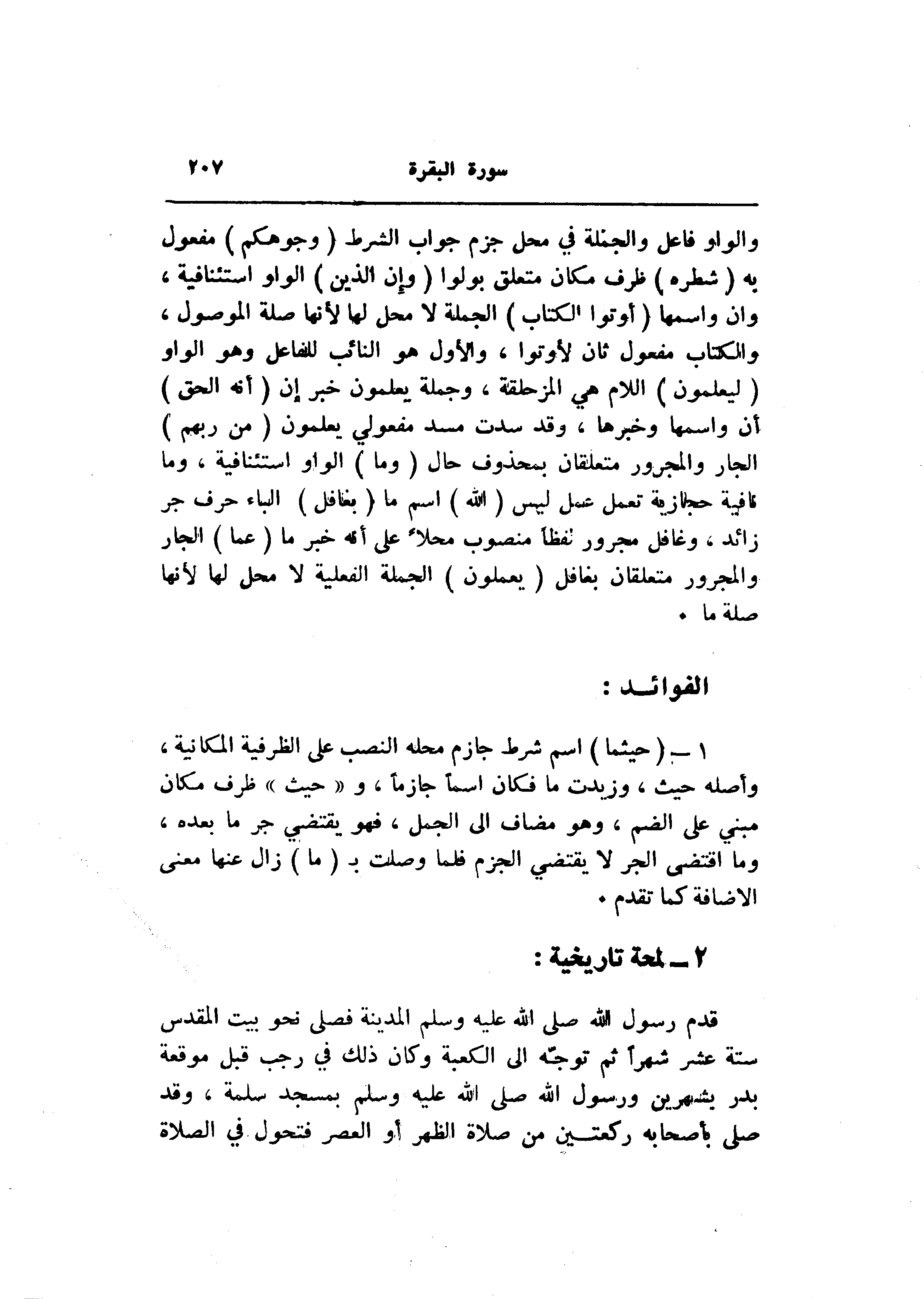 والواو فاعل والجملة في محل جزم جواب الشرط (وُجُوهَكُمْ) مفعول به (شَطْرَهُ) ظرف مكان متعلق بولوا (وَإِنَّ الَّذِينَ) الواو استئنافية، وان واسمها (أُوتُوا الْكِتابَ) الجملة لا محل لها لأنها صلة الموصول، والكتاب مفعول ثان لأوتوا، والأول هو النائب للفاعل وهو الواو (لَيَعْلَمُونَ) اللام هي المزحلقة، وجملة يعلمون خبر إن (أَنَّهُ الْحَقُّ) أن واسمها وخبرها، وقد سدت مسد مفعولي يعلمون (مِنْ رَبِّهِمْ) الجار والمجرور متعلقان بمحذوف حال (وَمَا) الواو استئنافية، وما نافية حجازية تعمل عمل ليس (اللَّهُ) اسم ما (بِغافِلٍ) الباء حرف جر زائد، وغافل مجرور لفظا منصوب محلا على أنه خبر ما (عَمَّا) الجار والمجرور متعلقان بغافل (يَعْمَلُونَ) الجملة الفعلية لا محل لها لأنها صلة ما.