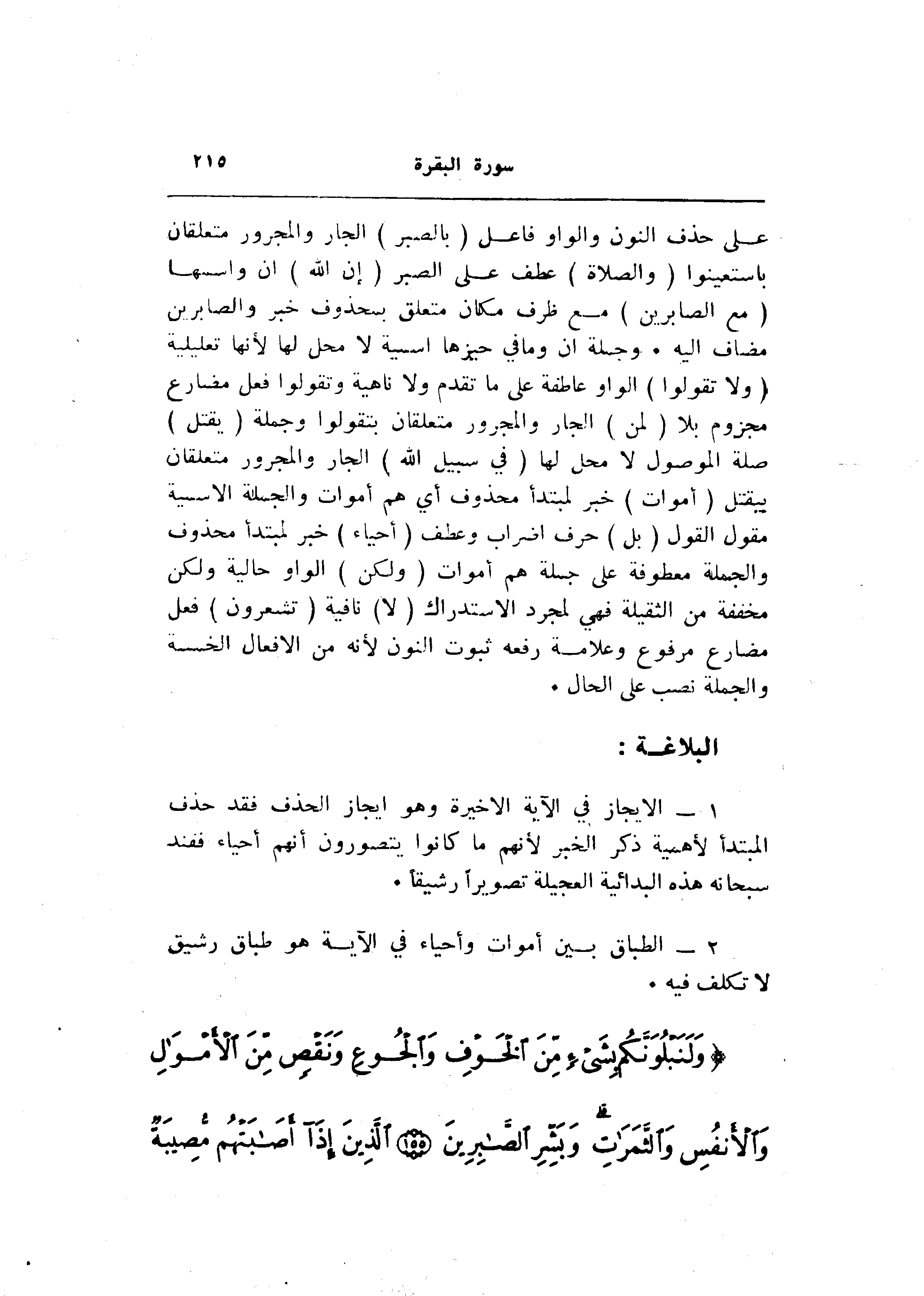 على حذف النون والواو فاعل (بِالصَّبْرِ) الجار والمجرور متعلقان باستعينوا (وَالصَّلاةِ) عطف على الصبر (إِنَّ اللَّهَ) ان واسمها (مَعَ الصَّابِرِينَ) مع ظرف مكان متعلق بمحذوف خبر والصابرين مضاف اليه. وجملة ان وما في حيزها اسمية لا محل لها لأنها تعليلية (وَلا تَقُولُوا) الواو عاطفة على ما تقدم ولا ناهية وتقولوا فعل مضارع مجزوم بلا (لِمَنْ) الجار والمجرور متعلقان بتقولوا وجملة (يُقْتَلُ) صلة الموصول لا محل لها (فِي سَبِيلِ اللَّهِ) الجار والمجرور متعلقان بيقتل (أَمْواتٌ) خبر لمبتدأ محذوف أي هم أموات والجملة الاسمية مقول القول (بَلْ) حرف إضراب وعطف (أَحْياءٌ) خبر لمبتدأ محذوف والجملة معطوفة على جملة هم أموات (وَلكِنْ) الواو حالية ولكن مخففة من الثقيلة فهي لمجرد الاستدراك (لا) نافية (تَشْعُرُونَ) فعل مضارع مرفوع وعلامة رفعه ثبوت النون لأنه من الافعال الخمسة والجملة نصب على الحال.