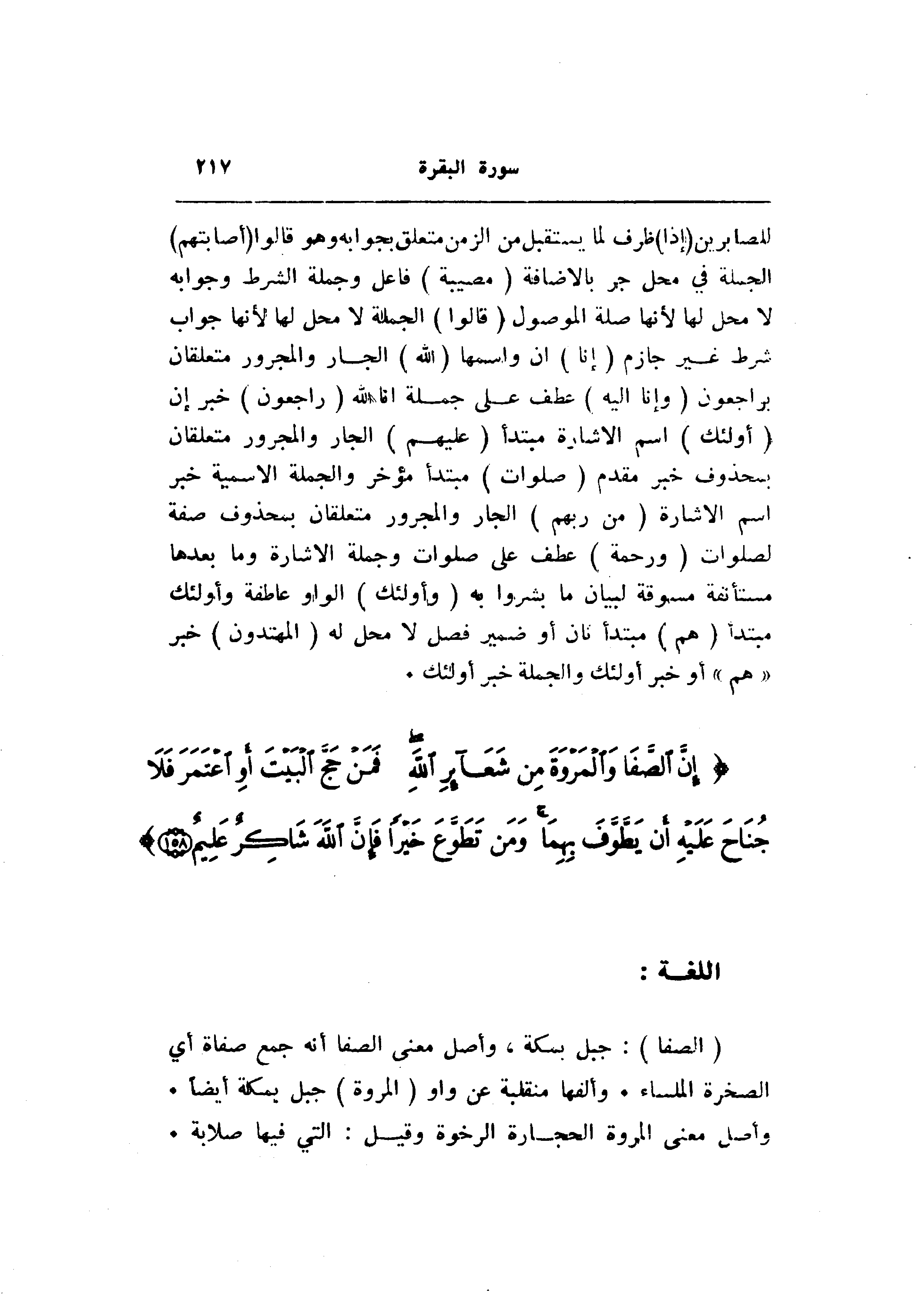 (الصَّفا) : جبل بمكة، وأصل معنى الصفا أنه جمع صفاة أي الصخرة الملساء. وألفها منقلبة عن واو (الْمَرْوَةَ) جبل بمكة أيضا.