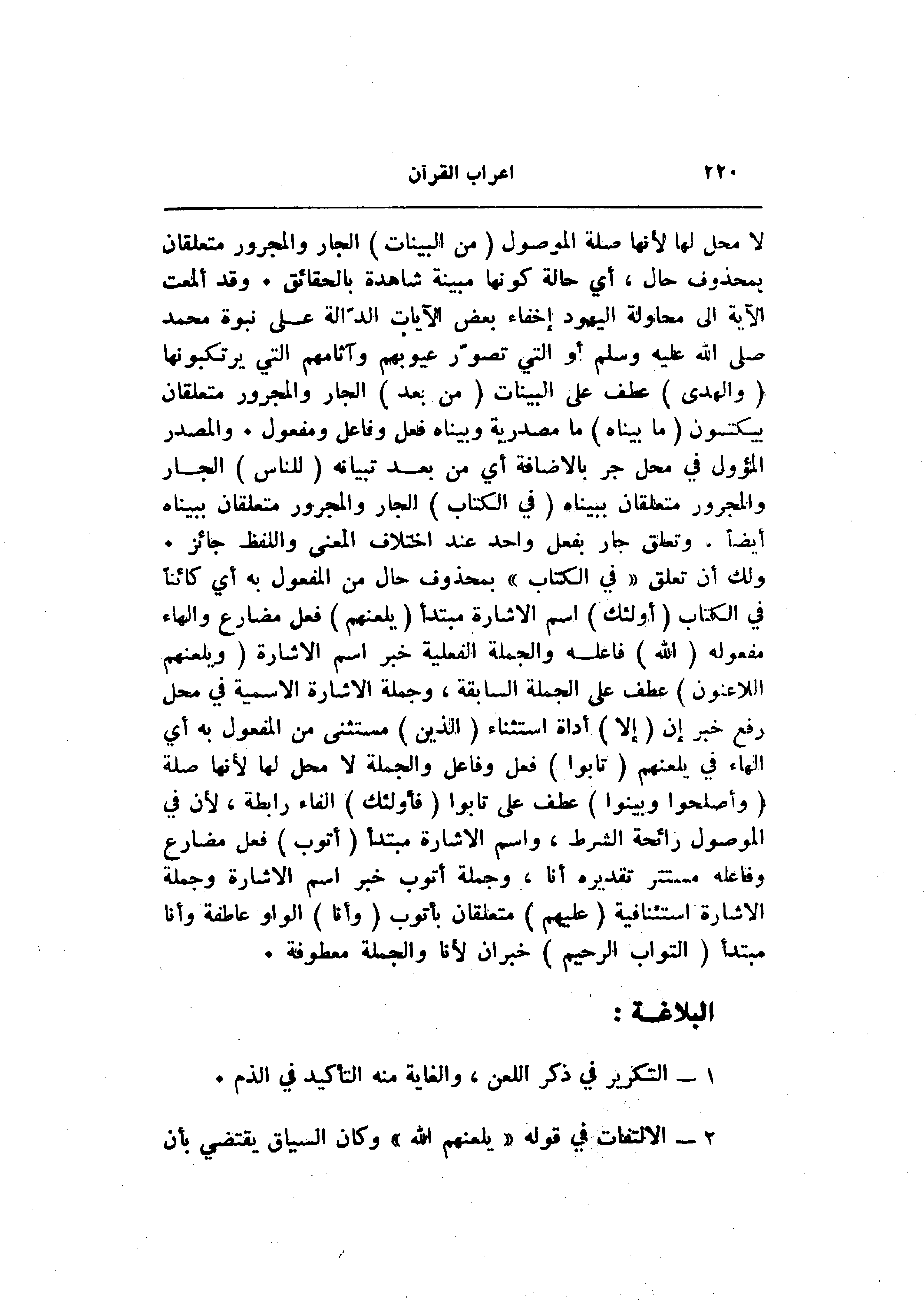 ولك أن تعلق «في الكتاب» بمحذوف حال من المفعول به أي كائنا في الكتاب (أُولئِكَ) اسم الاشارة مبتدأ (يَلْعَنُهُمُ) فعل مضارع والهاء مفعوله (اللَّهُ) فاعله والجملة الفعلية خبر اسم الاشارة (وَيَلْعَنُهُمُ اللَّاعِنُونَ) عطف على الجملة السابقة، وجملة الاشارة الاسمية في محل رفع خبر إن (إِلَّا) أداة استثناء (الَّذِينَ) مستثنى من المفعول به أي الهاء في يلعنهم (تابُوا) فعل وفاعل والجملة لا محل لها لأنها صلة (وَأَصْلَحُوا وَبَيَّنُوا) عطف على تابوا (فَأُولئِكَ) الفاء رابطة، لأن في الموصول رائحة الشرط، واسم الاشارة مبتدأ (أَتُوبُ) فعل مضارع وفاعله مستتر تقديره أنا، وجملة أتوب خبر اسم الاشارة وجملة الاشارة استئنافية (عَلَيْهِمْ) متعلقان بأتوب (وَأَنَا) الواو عاطفة وأنا مبتدأ (التَّوَّابُ الرَّحِيمُ) خبر ان لأنا والجملة معطوفة.