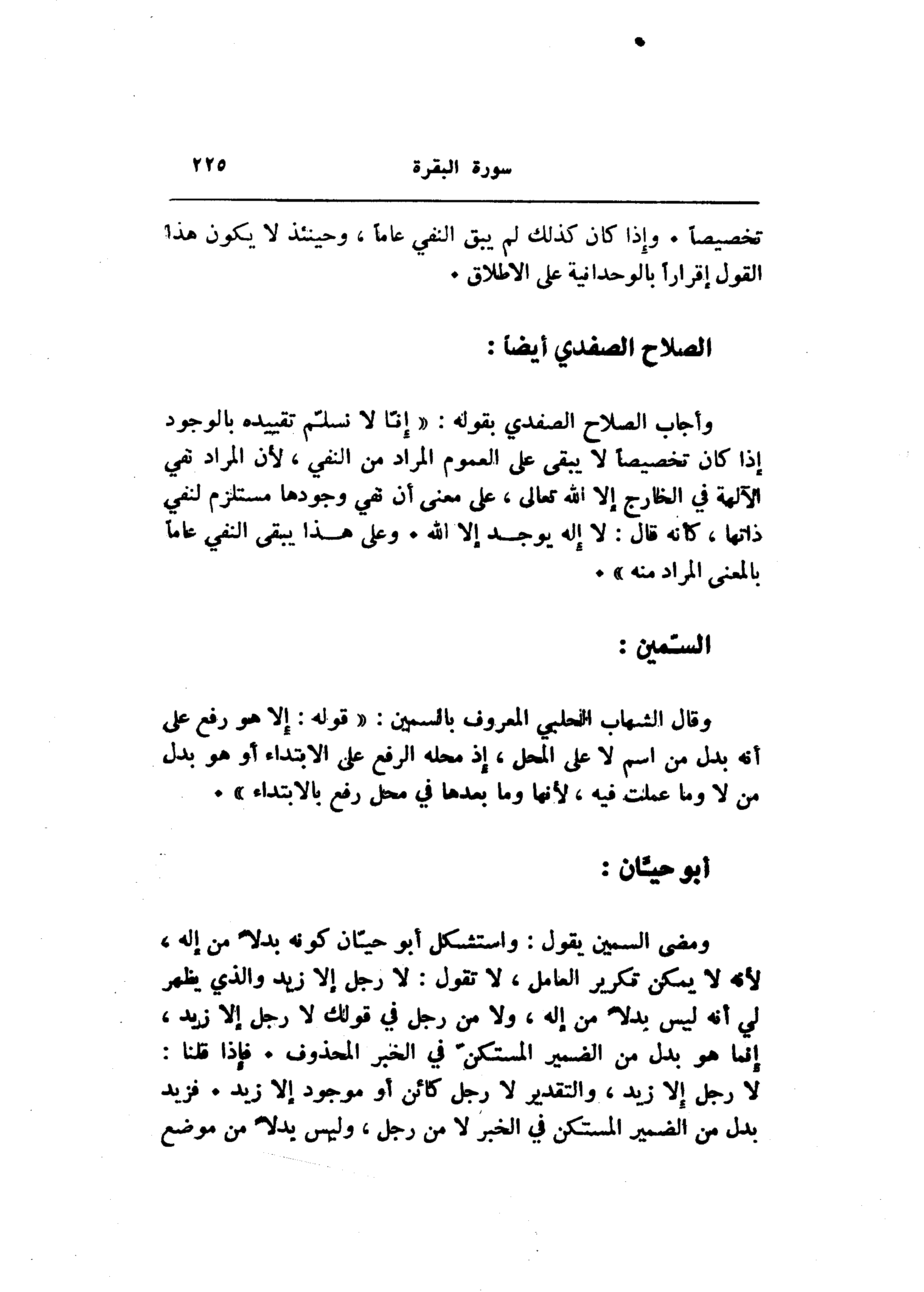 وأجاب الصلاح الصفدي بقوله: «إنّا لا نسلّم تقييده بالوجود إذا كان تخصيصا لا يبقى على العموم المراد من النفي، لأن المراد نفي الآلهة في الخارج إلا الله تعالى، على معنى أن نفي وجودها مستلزم لنفي ذاتها، كأنه قال: لا إله يوجد إلا الله. وعلى هذا يبقى النفي عاما بالمعنى المراد منه» .
