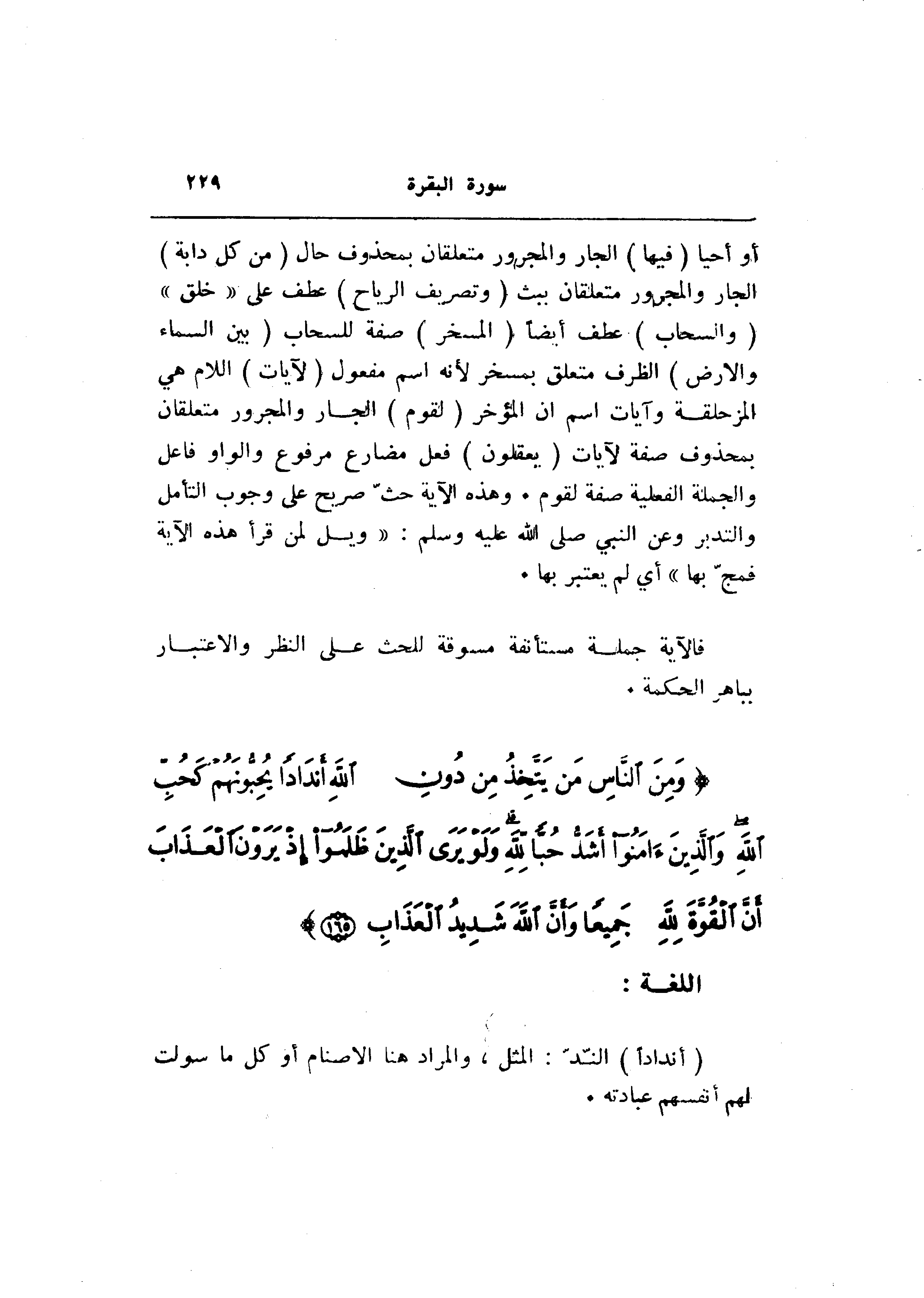 أو أحيا (فِيها) الجار والمجرور متعلقان بمحذوف حال (مِنْ كُلِّ دَابَّةٍ) الجار والمجرور متعلقان ببث (وَتَصْرِيفِ الرِّياحِ) عطف على «خلق» (وَالسَّحابِ) عطف أيضا (الْمُسَخَّرِ) صفة للسحاب (بَيْنَ السَّماءِ وَالْأَرْضِ) الظرف متعلق بمسخر لأنه اسم مفعول (لَآياتٍ) اللام هي المزحلقة وآيات اسم ان المؤخر (لِقَوْمٍ) الجار والمجرور متعلقان بمحذوف صفة لآيات (يَعْقِلُونَ) فعل مضارع مرفوع والواو فاعل والجملة الفعلية صفة لقوم. وهذه الآية حثّ صريح على وجوب التأمل والتدبر وعن النبي صلى الله عليه وسلم: «ويل لمن قرأ هذه الآية فمجّ بها» أي لم يعتبر بها.