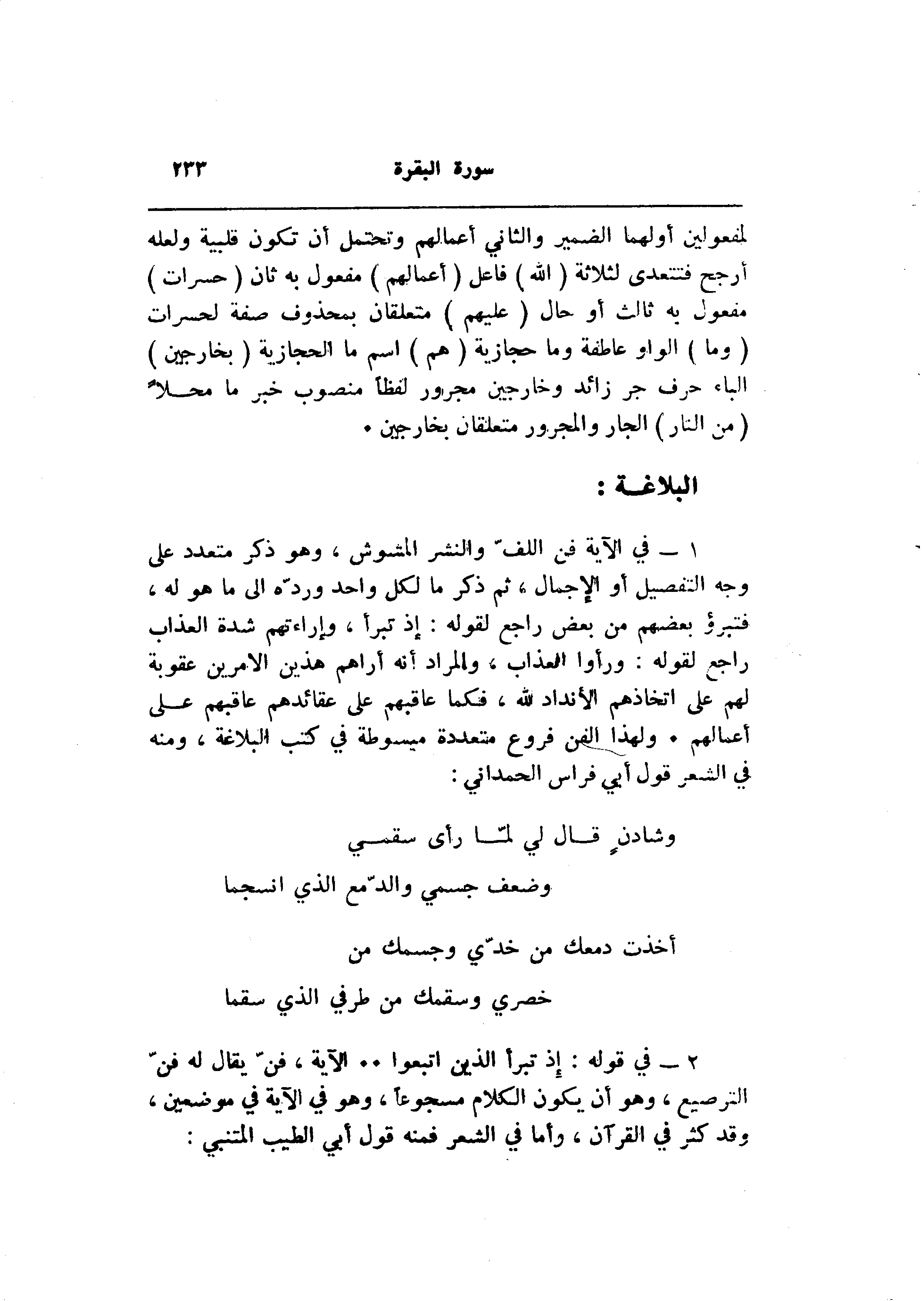 2- في قوله: إذ تبرأ الذين اتبعوا.. الآية، فنّ يقال له فنّ الترصيع، وهو أن يكون الكلام مسجوعا، وهو في الآية في موضعين، وقد كثر في القرآن، وأما في الشعر فمنه قول أبي الطيب المتنبي: