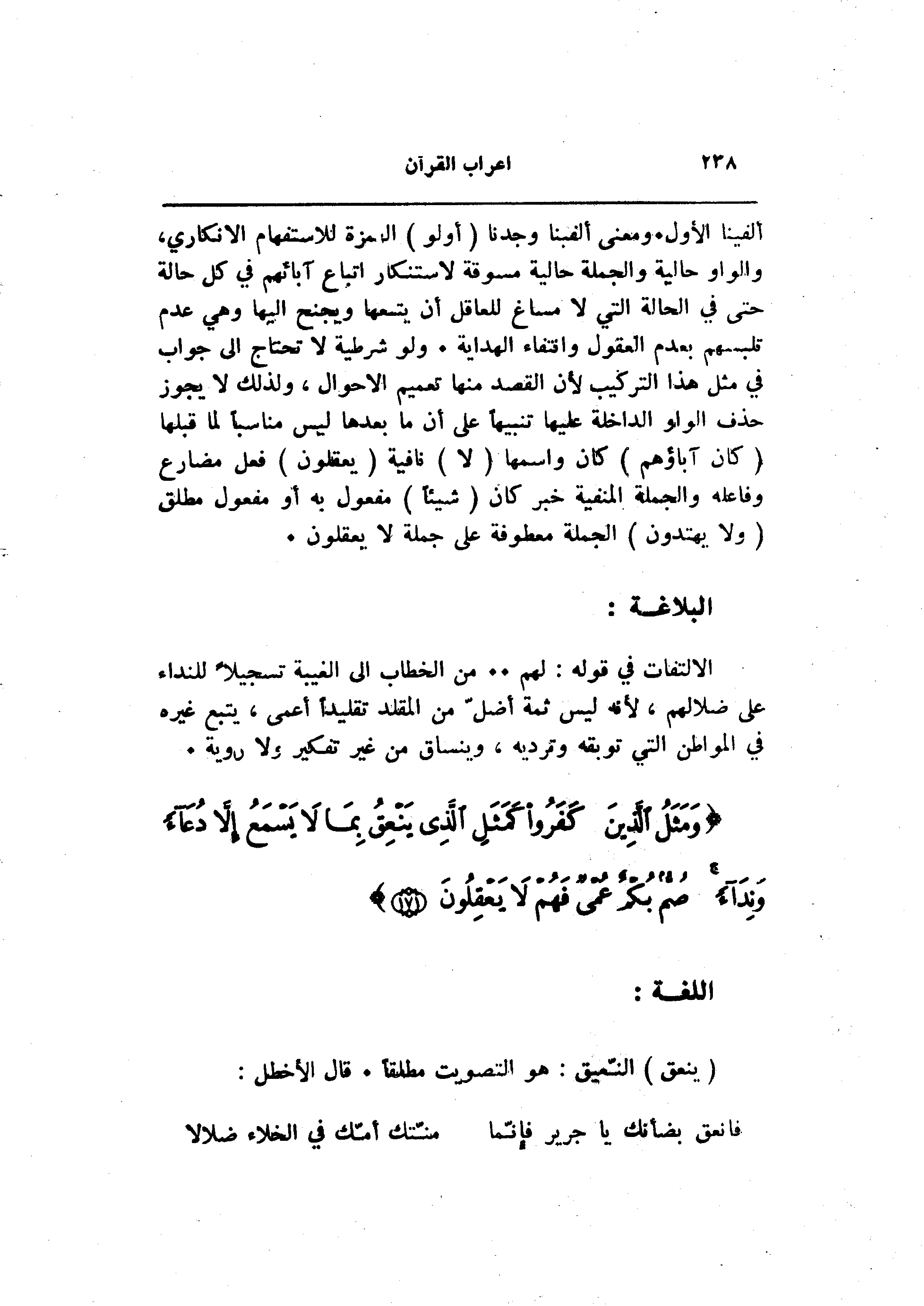 ألفينا الأول. ومعنى ألفينا وجدنا (أَوَلَوْ) الهمزة للاستفهام الانكاري، والواو حالية والجملة حالية مسوقة لاستنكار اتباع آبائهم في كل حالة حتى في الحالة التي لا مساغ للعاقل أن يتعها ويجنح إليها وهي عدم تلبسهم بعدم العقول وانتفاء الهداية. ولو شرطية لا تحتاج الى جواب في مثل هذا التركيب لأن القصد منها تعميم الأحوال، ولذلك لا يجوز حذف الواو الداخلة عليها تنبيها على أن ما بعدها ليس مناسبا لما قبلها (كانَ آباؤُهُمْ) كان واسمها (لا) نافية (يَعْقِلُونَ) فعل مضارع وفاعله والجملة المنفية خبر كان (شَيْئاً) مفعول به أو مفعول مطلق (وَلا يَهْتَدُونَ) الجملة معطوفة على جملة لا يعقلون.