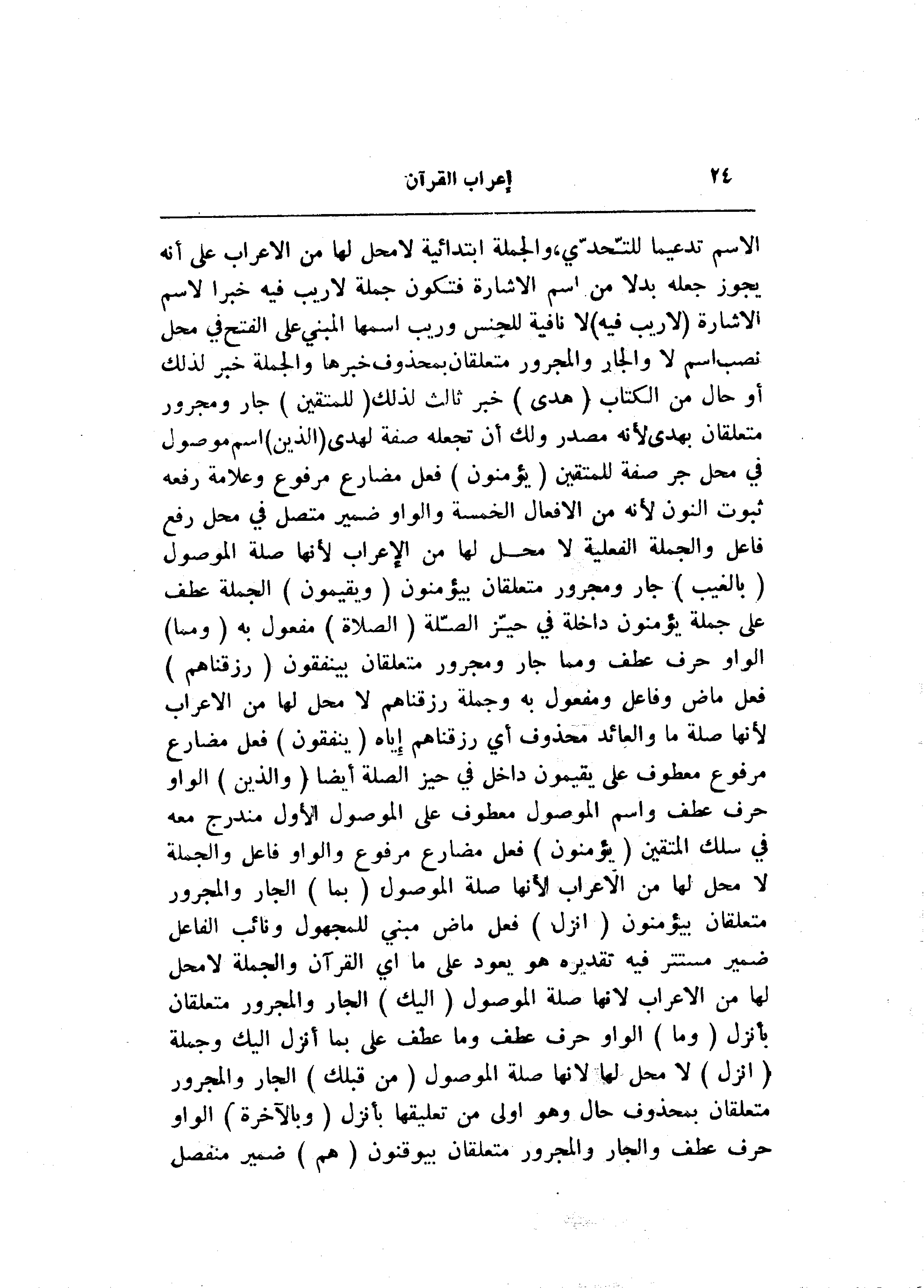 الاسم تدعيما للتّحدّي، والجملة ابتدائية لا محل لها من الإعراب على أنه يجوز جعله بدلا من اسم الاشارة فتكون جملة لا ريب فيه خبرا لاسم الاشارة (لا رَيْبَ فِيهِ) لا نافية للجنس وريب اسمها المبني على الفتح في محل نصب اسم لا والجار والمجرور متعلقان بمحذوف خبرها والجملة خبر لذلك أو حال من الكتاب (هُدىً) خبر ثالث لذلك (لِلْمُتَّقِينَ) جار ومجرور متعلقان بهدى لأنه مصدر ولك أن تجعله صفة لهدى (الَّذِينَ) اسم موصول في محل جر صفة للمتقين (يُؤْمِنُونَ) فعل مضارع مرفوع وعلامة رفعه ثبوت النون لأنه من الافعال الخمسة والواو ضمير متصل في محل رفع فاعل والجملة الفعلية لا محل لها من الإعراب لأنها صلة الموصول (بِالْغَيْبِ) جار ومجرور متعلقان بيؤمنون (وَيُقِيمُونَ) الجملة عطف على جملة يؤمنون داخلة في حيّز الصّلة (الصَّلاةَ) مفعول به (وَمِمَّا) الواو حرف عطف ومما جار ومجرور متعلقان بينفقون (رَزَقْناهُمْ) فعل ماض وفاعل ومفعول به وجملة رزقناهم لا محل لها من الإعراب لأنها صلة ما والعائد محذوف أي رزقناهم إياه (يُنْفِقُونَ) فعل مضارع مرفوع معطوف على يقيمون داخل في حيز الصلة أيضا (وَالَّذِينَ) الواو حرف عطف واسم الموصول معطوف على الموصول الأول مندرج معه في سلك المتقين (يُؤْمِنُونَ) فعل مضارع مرفوع والواو فاعل والجملة لا محل لها من الإعراب لأنها صلة الموصول (بِما) الجار والمجرور متعلقان بيؤمنون (أُنْزِلَ) فعل ماض مبني للمجهول ونائب الفاعل ضمير مستتر فيه تقديره هو يعود على ما اي القرآن والجملة لا محل لها من الإعراب لانها صلة الموصول (إِلَيْكَ) الجار والمجرور متعلقان بأنزل (وَما) الواو حرف عطف وما عطف على بما أنزل إليك وجملة (أُنْزِلَ) لا محل لها لانها صلة الموصول (مِنْ قَبْلِكَ) الجار والمجرور متعلقان بمحذوف حال وهو اولى من تعليقها بأنزل (وَبِالْآخِرَةِ) الواو حرف عطف والجار والمجرور متعلقان بيوقنون (هُمْ) ضمير منفصل