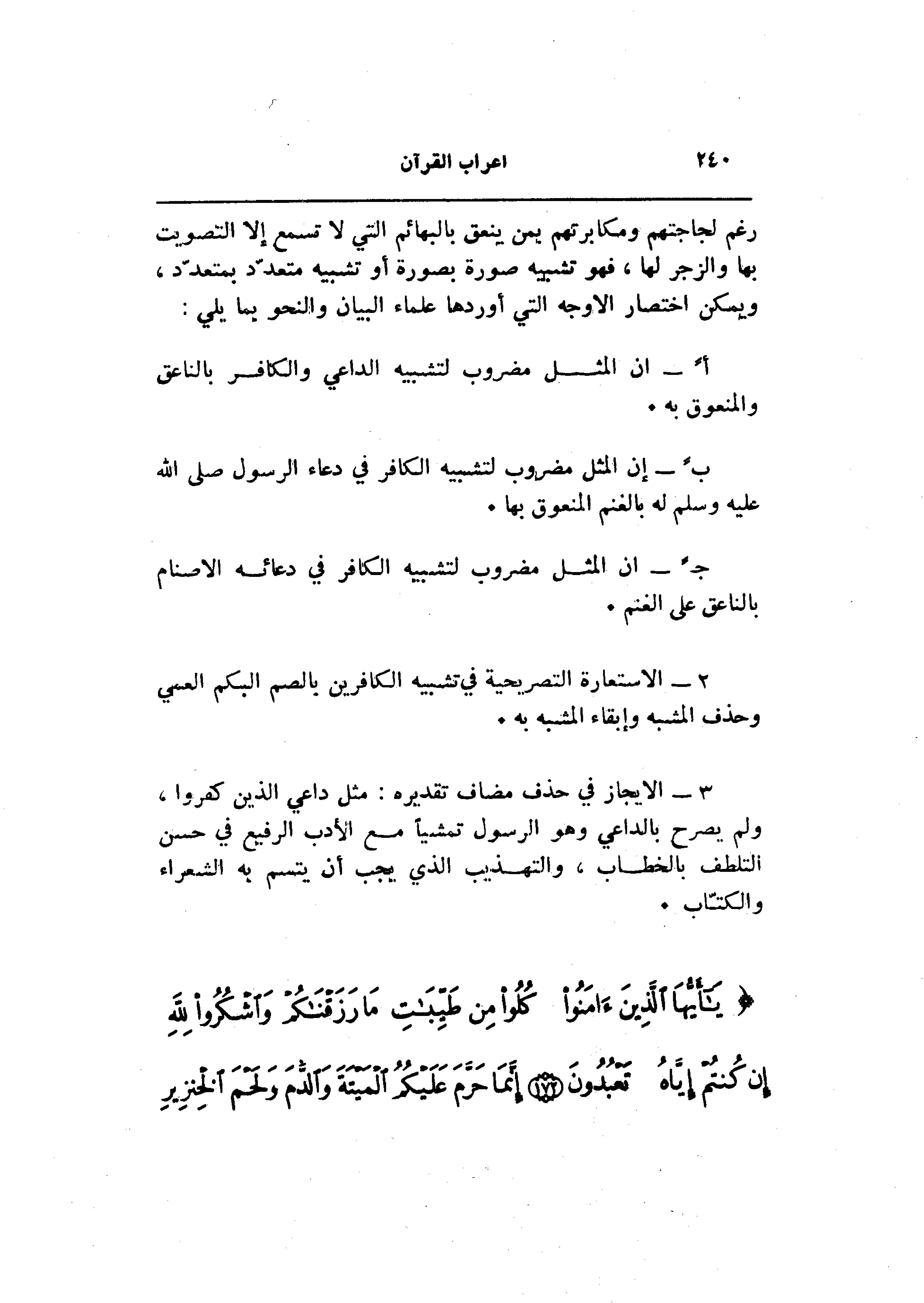 3- الإيجاز في حذف مضاف تقديره: مثل داعي الذين كفروا، ولم يصرح بالداعي وهو الرسول تمشيا مع الأدب الرفيع في حسن التلطف بالخطاب، والتهذيب الذي يجب أن يتسم به الشعراء والكتّاب.