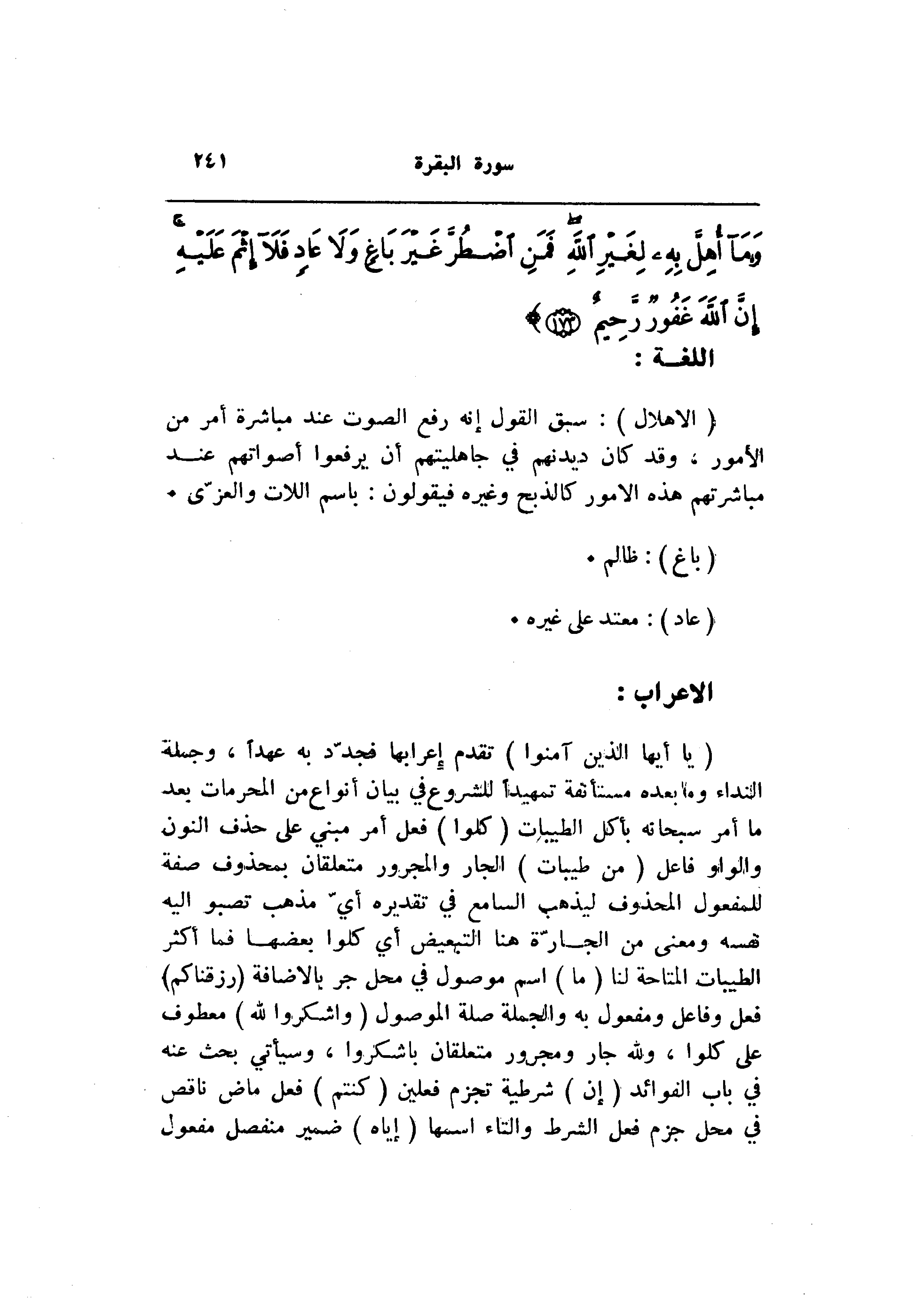 (يا أَيُّهَا الَّذِينَ آمَنُوا) تقدم إعرابها فجدّد به عهدا، وجملة النداء وما بعده مستأنفة تمهيدا للشروع في بيان أنواع من المحرمات بعد ما أمر سبحانه بأكل الطيبات (كُلُوا) فعل أمر مبني على حذف النون والواو فاعل (مِنْ طَيِّباتِ) الجار والمجرور متعلقان بمحذوف صفة للمفعول المحذوف ليذهب السامع في تقديره أيّ مذهب تصبو اليه نفسه ومعنى من الجارّة هنا التبعيض أي كلوا بعضها فما أكثر الطيبات المتاحة لنا (ما) اسم موصول في محل جر بالاضافة (رَزَقْناكُمْ) فعل وفاعل ومفعول به والجملة صلة الموصول (وَاشْكُرُوا لِلَّهِ) معطوف على كلوا، ولله جار ومجرور متعلقان باشكروا، وسيأتي بحث عنه في باب الفوائد (إِنْ) شرطية تجزم فعلين (كُنْتُمْ) فعل ماض ناقص في محل جزم فعل الشرط والتاء اسمها (إِيَّاهُ) ضمير منفصل مفعول
