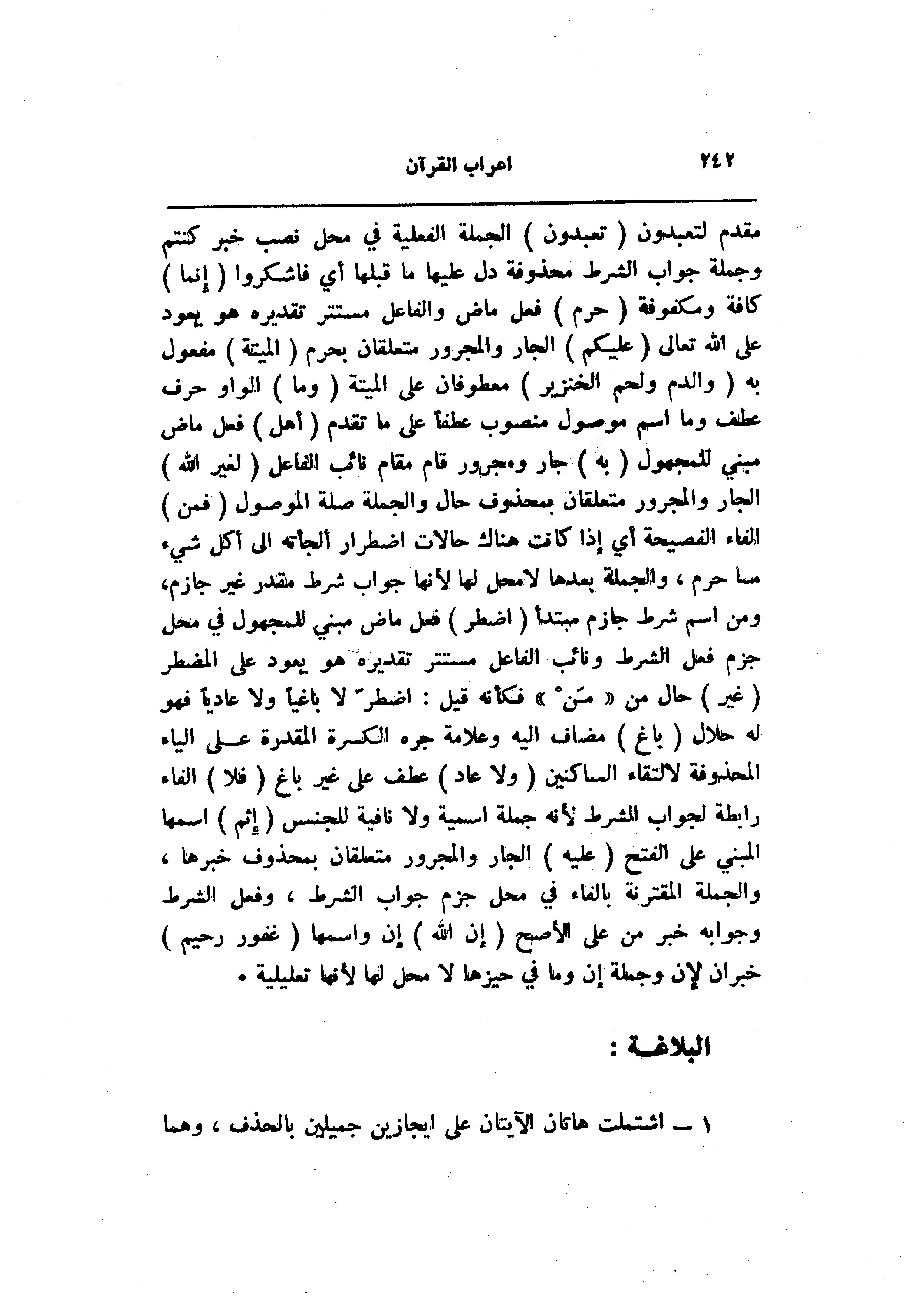مقدم لتعبدون (تَعْبُدُونَ) الجملة الفعلية في محل نصب خبر كنتم وجملة جواب الشرط محذوفة دل عليها ما قبلها أي فاشكروا (إِنَّما) كافة ومكفوفة (حَرَّمَ) فعل ماض والفاعل مستتر تقديره هو يعود على الله تعالى (عَلَيْكُمُ) الجار والمجرور متعلقان بحرم (الْمَيْتَةَ) مفعول به (وَالدَّمَ وَلَحْمَ الْخِنْزِيرِ) معطوفان على الميتة (وَما) الواو حرف عطف وما اسم موصول منصوب عطفا على ما تقدم (أُهِلَّ) فعل ماض مبني للمجهول (بِهِ) جار ومجرور قام مقام نائب الفاعل (لِغَيْرِ اللَّهِ) الجار والمجرور متعلقان بمحذوف حال والجملة صلة الموصول (فَمَنِ) الفاء الفصيحة أي إذا كانت هناك حالات اضطرار ألجأته الى أكل شيء مما حرم، والجملة بعدها لا محل لها لأنها جواب شرط مقدر غير جازم، ومن اسم شرط جازم مبتدأ (اضْطُرَّ) فعل ماض مبني للمجهول في محل جزم فعل الشرط ونائب الفاعل مستتر تقديره هو يعود على المضطر (غَيْرَ) حال من «من» فكأنه قيل: اضطرّ لا باغيا ولا عاديا فهو له حلال (باغٍ) مضاف اليه وعلامة جره الكسرة المقدرة على الياء المحذوفة لالتقاء الساكنين (وَلا عادٍ) عطف على غير باغ (فَلا) الفاء رابطة لجواب الشرط لأنه جملة اسمية ولا نافية للجنس (إِثْمَ) اسمها المبني على الفتح (عَلَيْهِ) الجار والمجرور متعلقان بمحذوف خبرها، والجملة المقترنة بالفاء في محل جزم جواب الشرط، وفعل الشرط وجوابه خبر من على الأصح (إِنَّ اللَّهَ) إن واسمها (غَفُورٌ رَحِيمٌ) خبران لإن وجملة إن وما في حيزها لا محل لها لأنها تعليلية.