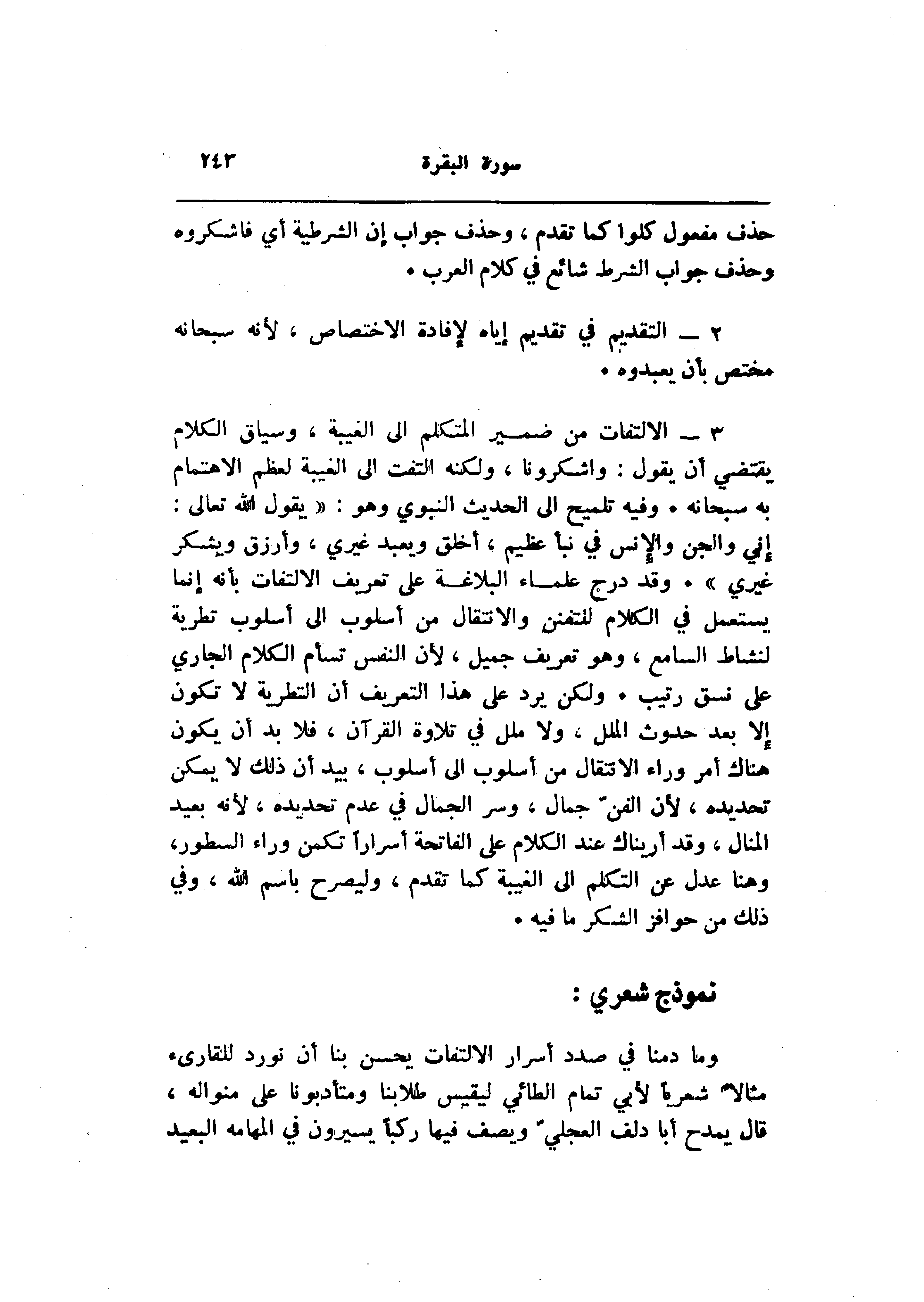 إني والجن والإنس في نبأ عظيم، أخلق ويعبد غيري، وأرزق ويشكر غيري» . وقد درج علماء البلاغة على تعريف الالتفات بأنه إنما يستعمل في الكلام للتفنن والانتقال من أسلوب الى أسلوب تطرية لنشاط السامع، وهو تعريف جميل، لأن النفس تسأم الكلام الجاري على نسق رتيب. ولكن يرد على هذا التعريف أن التطرية لا تكون إلا بعد حدوث الملل، ولا ملل في تلاوة القرآن، فلا بد أن يكون هناك أمر وراء الانتقال من أسلوب الى أسلوب، بيد أن ذلك لا يمكن تحديده، لأن الفنّ جمال، وسر الجمال في عدم تحديده، لأنه بعيد المنال، وقد أريناك عند الكلام على الفاتحة أسرارا تكمن وراء السطور، وهنا عدل عن التكلم الى الغيبة كما تقدم، وليصرح باسم الله، وفي ذلك من حوافز الشكر ما فيه.