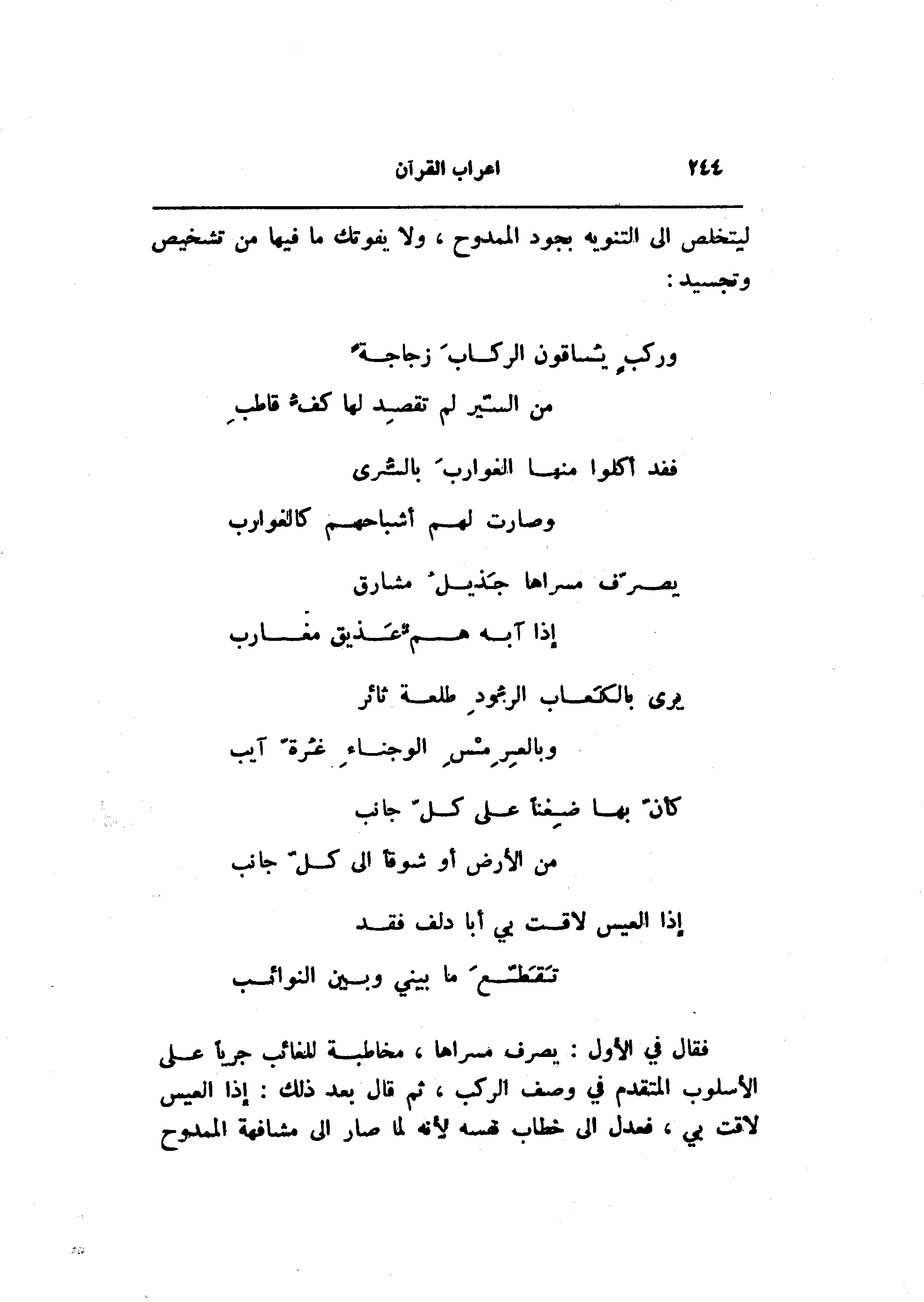 فقال في الأول: يصرف مسراها، مخاطبة للغائب جريا على الأسلوب المتقدم في وصف الركب، ثم قال بعد ذلك: إذا العيس لاقت بي، فعدل الى خطاب نفسه لأنه لما صار الى مشافهة الممدوح