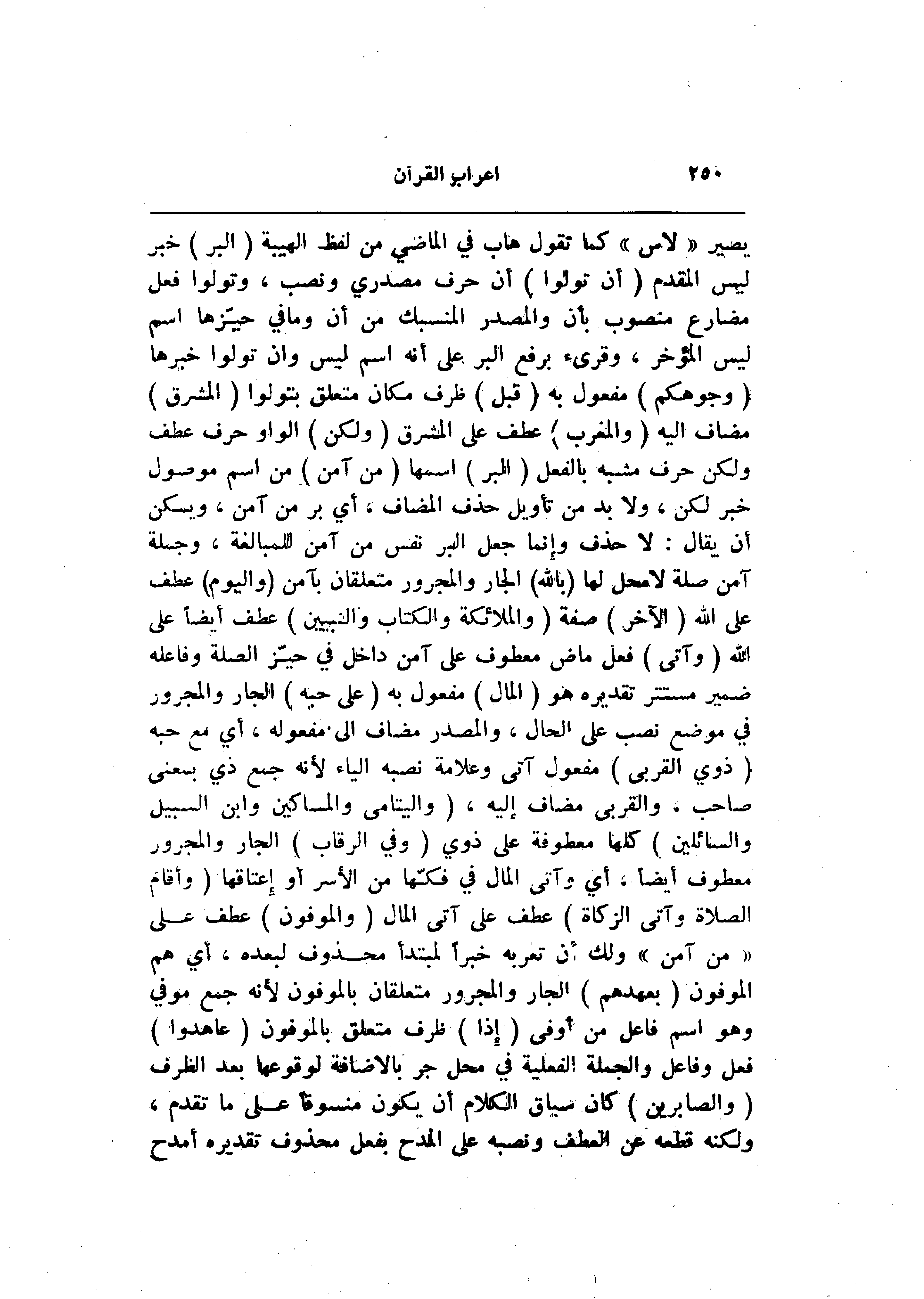 يصير «لاس» كما تقول هاب في الماضي من لفظ الهيبة (الْبِرَّ) خبر ليس المقدم (أَنْ تُوَلُّوا) أن حرف مصدري ونصب، وتولوا فعل مضارع منصوب بأن والمصدر المنسبك من أن وما في حيّزها اسم ليس المؤخر، وقرىء برفع البر على أنه اسم ليس وان تولوا خبرها (وُجُوهَكُمْ) مفعول به (قِبَلَ) ظرف مكان متعلق بتولوا (الْمَشْرِقِ) مضاف اليه (وَالْمَغْرِبِ) عطف على المشرق (وَلكِنَّ) الواو حرف عطف ولكن حرف مشبه بالفعل (الْبِرَّ) اسمها (مَنْ آمَنَ) من اسم موصول خبر لكن، ولا بد من تأويل حذف المضاف، أي بر من آمن، ويسكن أن يقال: لا حذف وإنما جعل البر نفس من آمن للمبالغة، وجملة آمن صلة لا محل لها (بِاللَّهِ) الجار والمجرور متعلقان بآمن (وَالْيَوْمِ) عطف على الله (الْآخِرِ) صفة (وَالْمَلائِكَةِ وَالْكِتابِ وَالنَّبِيِّينَ) عطف أيضا على الله (وَآتَى) فعل ماض معطوف على آمن داخل في حيّز الصلة وفاعله ضمير مستتر تقديره هو (الْمالَ) مفعول به (عَلى حُبِّهِ) الجار والمجرور في موضع نصب على الحال، والمصدر مضاف الى مفعوله، أي مع حبه (ذَوِي الْقُرْبى) مفعول آتى وعلامة نصبه الياء لأنه جمع ذي بمعنى صاحب. والقربى مضاف إليه، (وَالْيَتامى وَالْمَساكِينَ وَابْنَ السَّبِيلِ وَالسَّائِلِينَ) كلها معطوفة على ذوي (وَفِي الرِّقابِ) الجار والمجرور معطوف أيضا، أي وآتى المال في فكّها من الأسر أو إعتاقها (وَأَقامَ الصَّلاةَ وَآتَى الزَّكاةَ) عطف على آتى المال (وَالْمُوفُونَ) عطف على «من آمن» ولك أن تعربه خبرا لمبتدأ محذوف لبعده، أي هم الموفون (بِعَهْدِهِمْ) الجار والمجرور متعلقان بالموفون لأنه جمع مو في وهو اسم فاعل من أوفى (إِذا) ظرف متعلق بالموفون (عاهَدُوا) فعل وفاعل والجملة الفعلية في محل جر بالاضافة لوقوعها بعد الظرف (وَالصَّابِرِينَ) كان سياق الكلام أن يكون منسوفا على ما تقدم، ولكنه قطعه عن العطف ونصبه على المدح بفعل محذوف تقديره أمدح