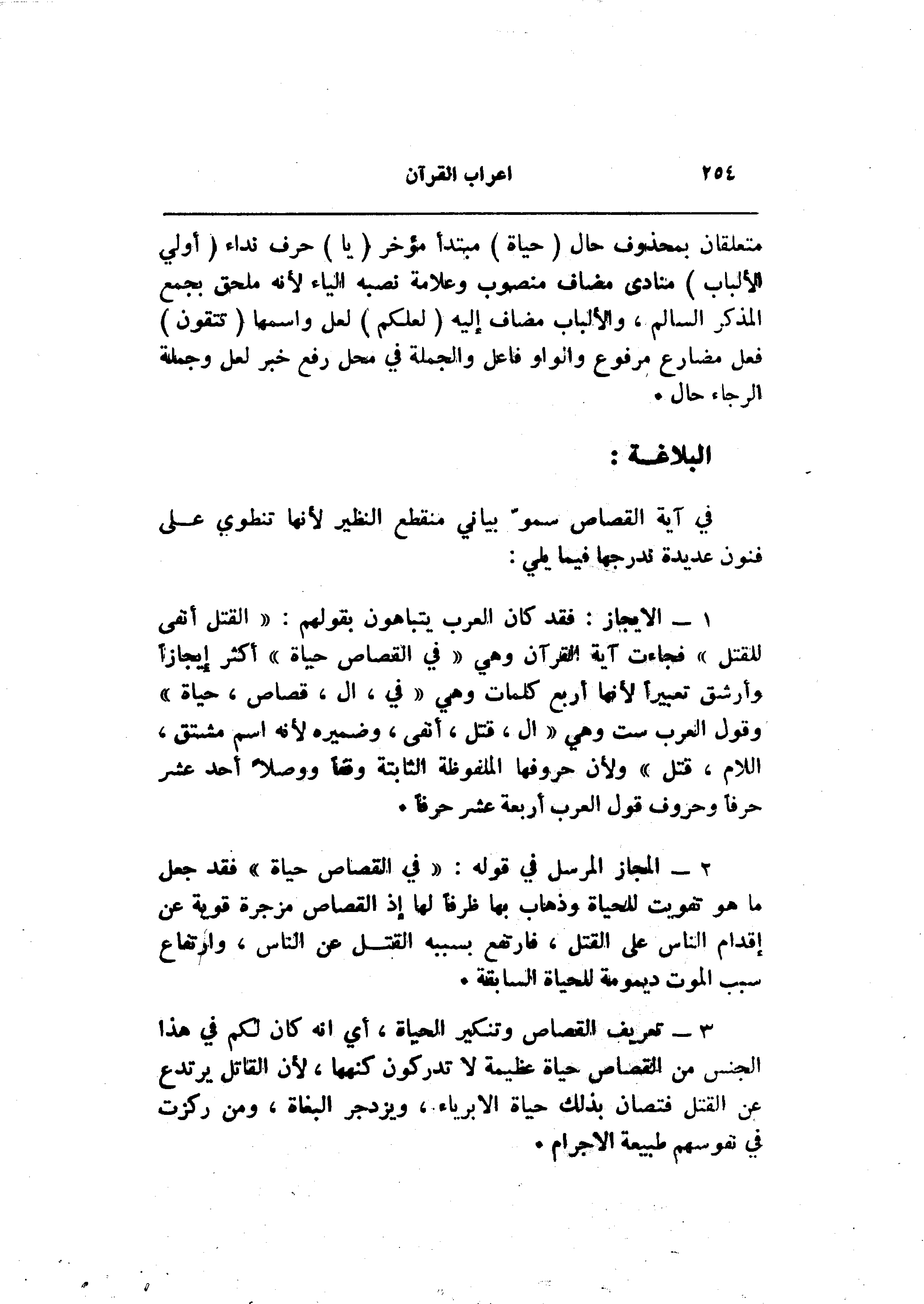 3- تعريف القصاص وتنكير الحياة، أي انه كان لكم في هذا الجنس من القصاص حياة عظيمة لا تدركون كنهها، لأن القاتل يرتدع عن القتل فتصان بذلك حياة الابرياء، ويزدجر البغاة، ومن ركزت في نفوسهم طبيعة الاجرام.
