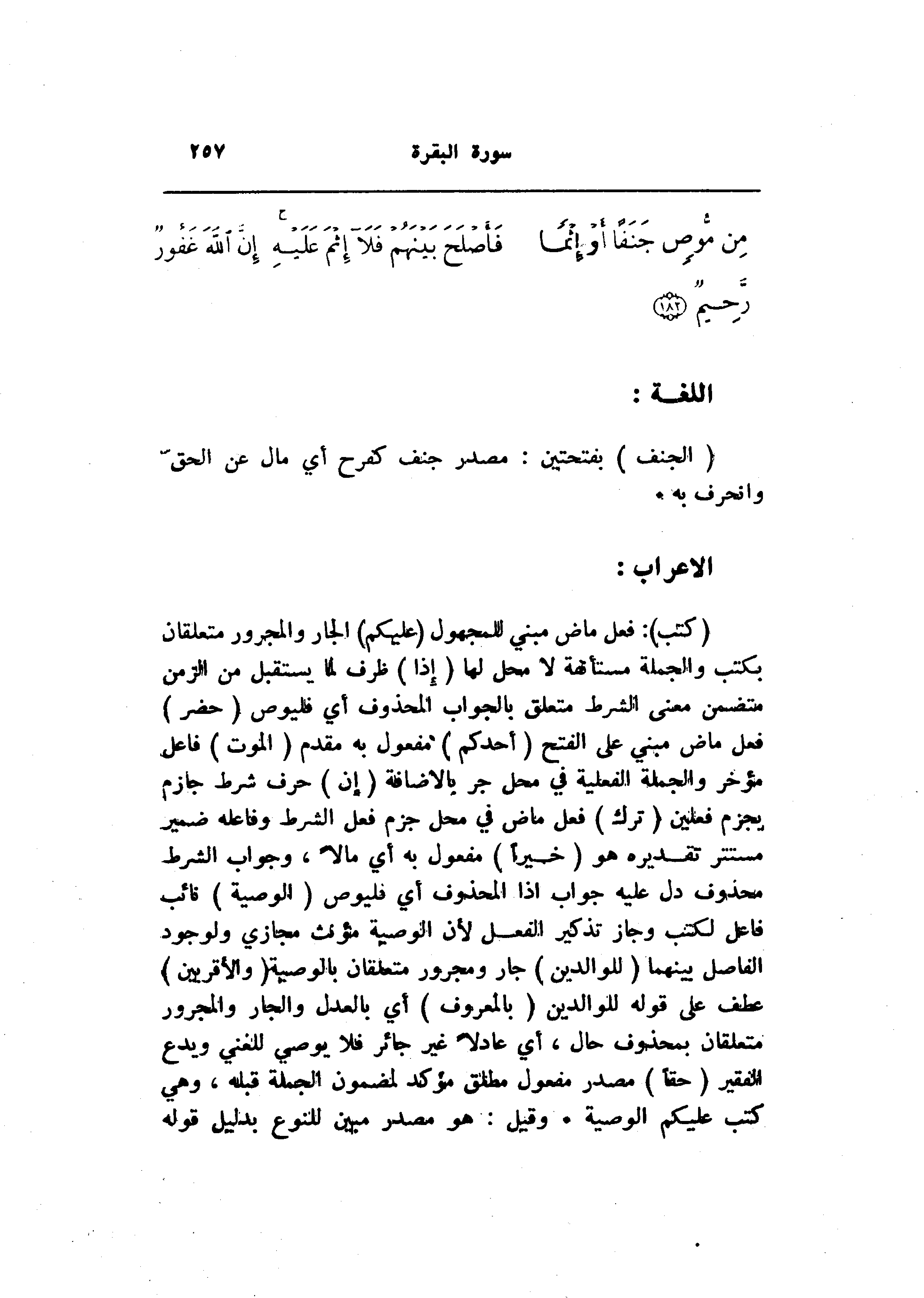 (كُتِبَ) : فعل ماض مبني للمجهول (عَلَيْكُمْ) الجار والمجرور متعلقان بكتب والجملة مستأنفة لا محل لها (إِذا) ظرف لما يستقبل من الزمن متضمن معنى الشرط متعلق بالجواب المحذوف أي فليوص (حَضَرَ) فعل ماض مبني على الفتح (أَحَدَكُمُ) مفعول به مقدم (الْمَوْتُ) فاعل مؤخر والجملة الفعلية في محل جر بالاضافة (إِنْ) حرف شرط جازم يجزم فعلين (تَرَكَ) فعل ماض في محل جزم فعل الشرط وفاعله ضمير مستتر تقديره هو (خَيْراً) مفعول به أي مالا، وجواب الشرط محذوف دل عليه جواب إذا المحذوف أي فليوص (الْوَصِيَّةُ) نائب فاعل لكتب وجاز تذكير الفعل لأن الوصية مؤنث مجازي ولوجود الفاصل بينهما (لِلْوالِدَيْنِ) جار ومجرور متعلقان بالوصية (وَالْأَقْرَبِينَ) عطف على قوله للوالدين (بِالْمَعْرُوفِ) أي بالعدل والجار والمجرور متعلقان بمحذوف حال، أي عادلا غير جائر فلا يوصي للغني ويدع الفقير (حَقًّا) مصدر مفعول مطلق مؤكد لمضمون الجملة قبله، وهي كتب عليكم الوصية. وقيل: هو مصدر مبين للنوع بدليل قوله
