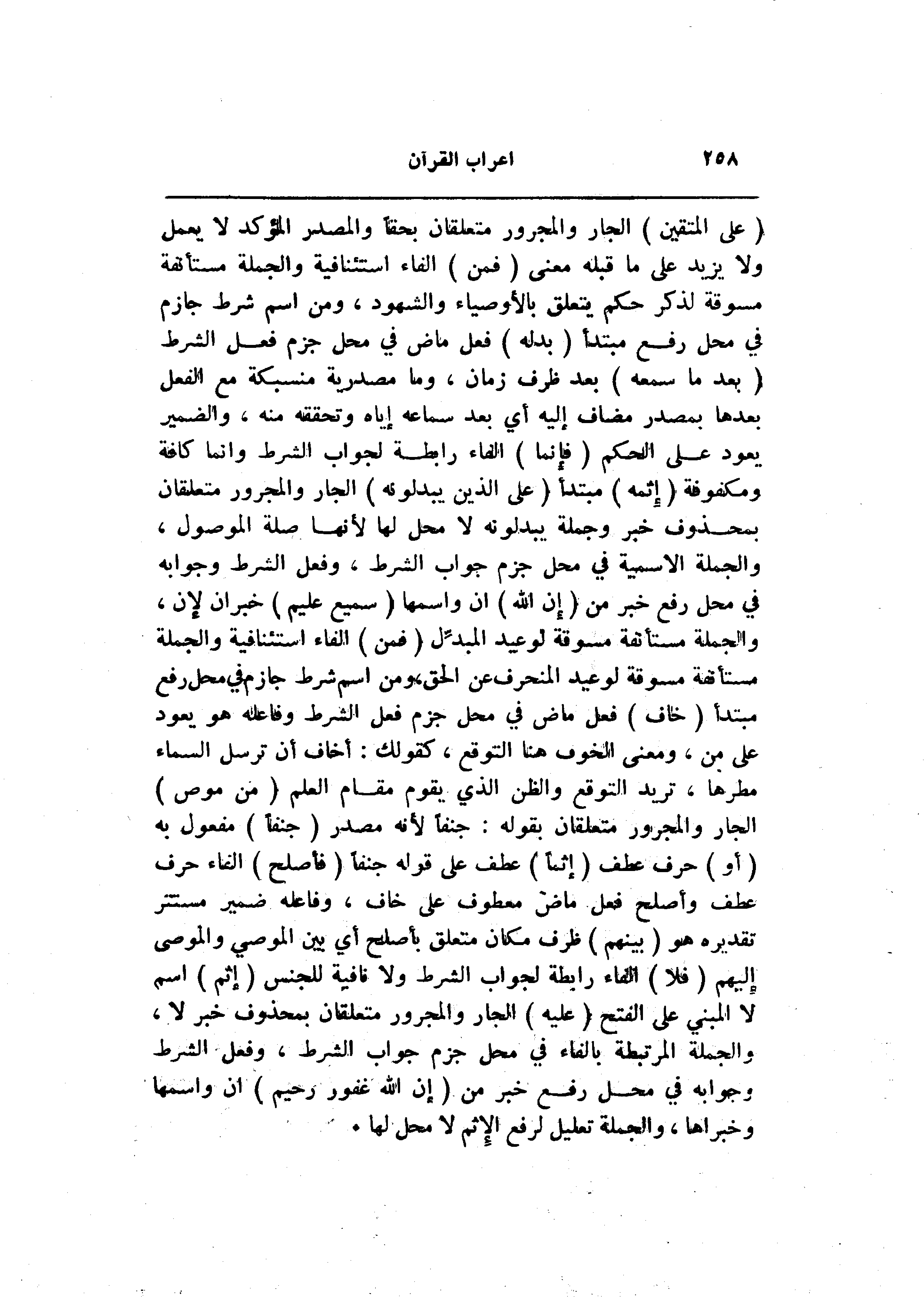 (عَلَى الْمُتَّقِينَ) الجار والمجرور متعلقان بحقا والمصدر المؤكد لا يعمل ولا يزيد على ما قبله معنى (فَمَنْ) الفاء استئنافية والجملة مستأنفة مسوقة لذكر حكم يتعلق بالأوصياء والشهود، ومن اسم شرط جازم في محل رفع مبتدأ (بَدَّلَهُ) فعل ماض في محل جزم فعل الشرط (بَعْدَ ما سَمِعَهُ) بعد ظرف زمان، وما مصدرية منسبكة مع الفعل بعدها بمصدر مضاف إليه أي بعد سماعه إياه وتحققه منه، والضمير يعود على الحكم (فَإِنَّما) الفاء رابطة لجواب الشرط وانما كافة ومكفوفة (إِثْمُهُ) مبتدأ (عَلَى الَّذِينَ يُبَدِّلُونَهُ) الجار والمجرور متعلقان بمحذوف خبر وجملة يبدلونه لا محل لها لأنها صلة الموصول، والجملة الاسمية في محل جزم جواب الشرط، وفعل الشرط وجوابه في محل رفع خبر من (إِنَّ اللَّهَ) ان واسمها (سَمِيعٌ عَلِيمٌ) خبران لإن، والجملة مستأنفة مسوقة لوعيد المبدّل (فَمَنْ) الفاء استئنافية والجملة مستأنفة مسوقة لوعيد المنحرف عن الحق، ومن اسم شرط جازم في محل رفع مبتدأ (خافَ) فعل ماض في محل جزم فعل الشرط وفاعله هو يعود على من، ومعنى الخوف هنا التوقع، كقولك: أخاف أن ترسل السماء مطرها، تريد التوقع والظن الذي يقوم مقام العلم (مِنْ مُوصٍ) الجار والمجرور متعلقان بقوله: جنفا لأنه مصدر (جَنَفاً) مفعول به (أَوْ) حرف عطف (إِثْماً) عطف على قوله جنفا (فَأَصْلَحَ) الفاء حرف عطف وأصلح فعل ماض معطوف على خاف، وفاعله ضمير مستتر تقديره هو (بَيْنَهُمْ) ظرف مكان متعلق بأصلح أي بين الموصي والموصى إليهم (فَلا) الفاء رابطة لجواب الشرط ولا نافية للجنس (إِثْمَ) اسم لا المبني على الفتح (عَلَيْهِ) الجار والمجرور متعلقا بمحذوف خبر لا، والجملة المرتبطة بالفاء في محل جزم جواب الشرط، وفعل الشرط وجوابه في محل رفع خبر من (إِنَّ اللَّهَ غَفُورٌ رَحِيمٌ) ان واسمها وخبراها، والجملة تعليل لرفع الإثم لا محل لها.