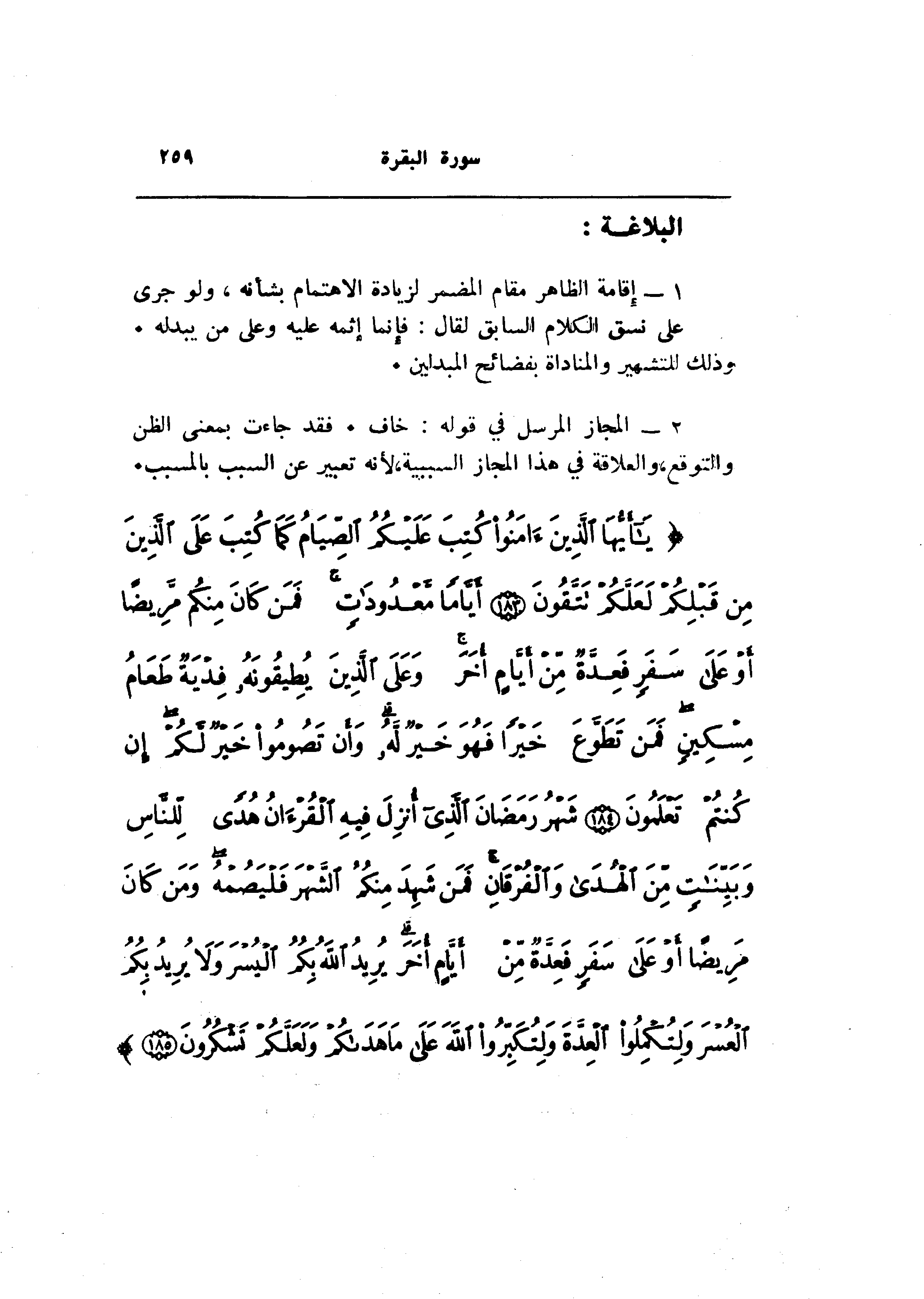 يا أَيُّهَا الَّذِينَ آمَنُوا كُتِبَ عَلَيْكُمُ الصِّيامُ كَما كُتِبَ عَلَى الَّذِينَ مِنْ قَبْلِكُمْ لَعَلَّكُمْ تَتَّقُونَ (183) أَيَّاماً مَعْدُوداتٍ فَمَنْ كانَ مِنْكُمْ مَرِيضاً أَوْ عَلى سَفَرٍ فَعِدَّةٌ مِنْ أَيَّامٍ أُخَرَ وَعَلَى الَّذِينَ يُطِيقُونَهُ فِدْيَةٌ طَعامُ مِسْكِينٍ فَمَنْ تَطَوَّعَ خَيْراً فَهُوَ خَيْرٌ لَهُ وَأَنْ تَصُومُوا خَيْرٌ لَكُمْ إِنْ كُنْتُمْ تَعْلَمُونَ (184) شَهْرُ رَمَضانَ الَّذِي أُنْزِلَ فِيهِ الْقُرْآنُ هُدىً لِلنَّاسِ وَبَيِّناتٍ مِنَ الْهُدى وَالْفُرْقانِ فَمَنْ شَهِدَ مِنْكُمُ الشَّهْرَ فَلْيَصُمْهُ وَمَنْ كانَ مَرِيضاً أَوْ عَلى سَفَرٍ فَعِدَّةٌ مِنْ أَيَّامٍ أُخَرَ يُرِيدُ اللَّهُ بِكُمُ الْيُسْرَ وَلا يُرِيدُ بِكُمُ الْعُسْرَ وَلِتُكْمِلُوا الْعِدَّةَ وَلِتُكَبِّرُوا اللَّهَ عَلى ما هَداكُمْ وَلَعَلَّكُمْ تَشْكُرُونَ (185)