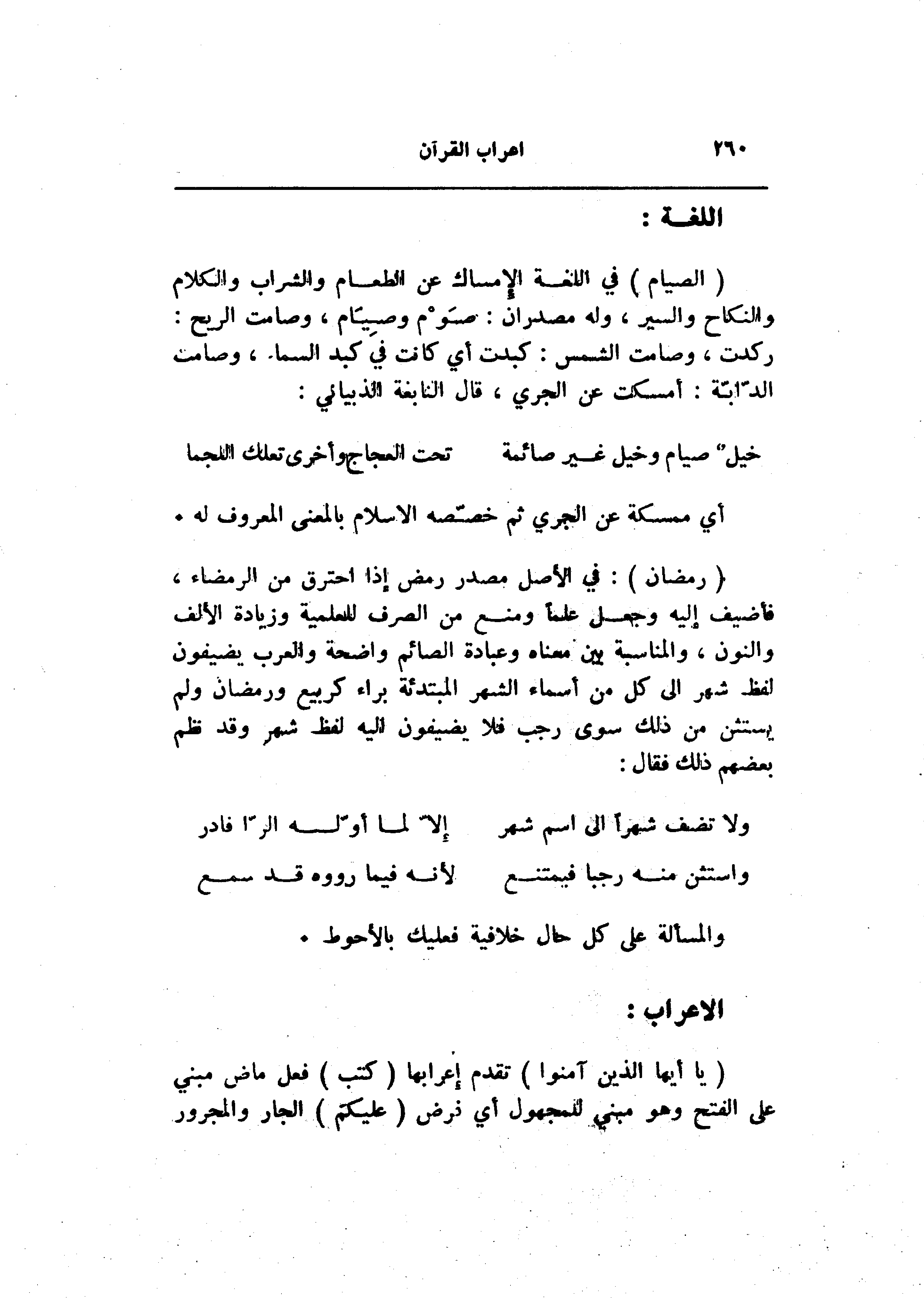 (الصِّيامُ) في اللغة الإمساك عن الطعام والشراب والكلام والنكاح والسير، وله مصدران: صوم وصيام، وصامت الريح: