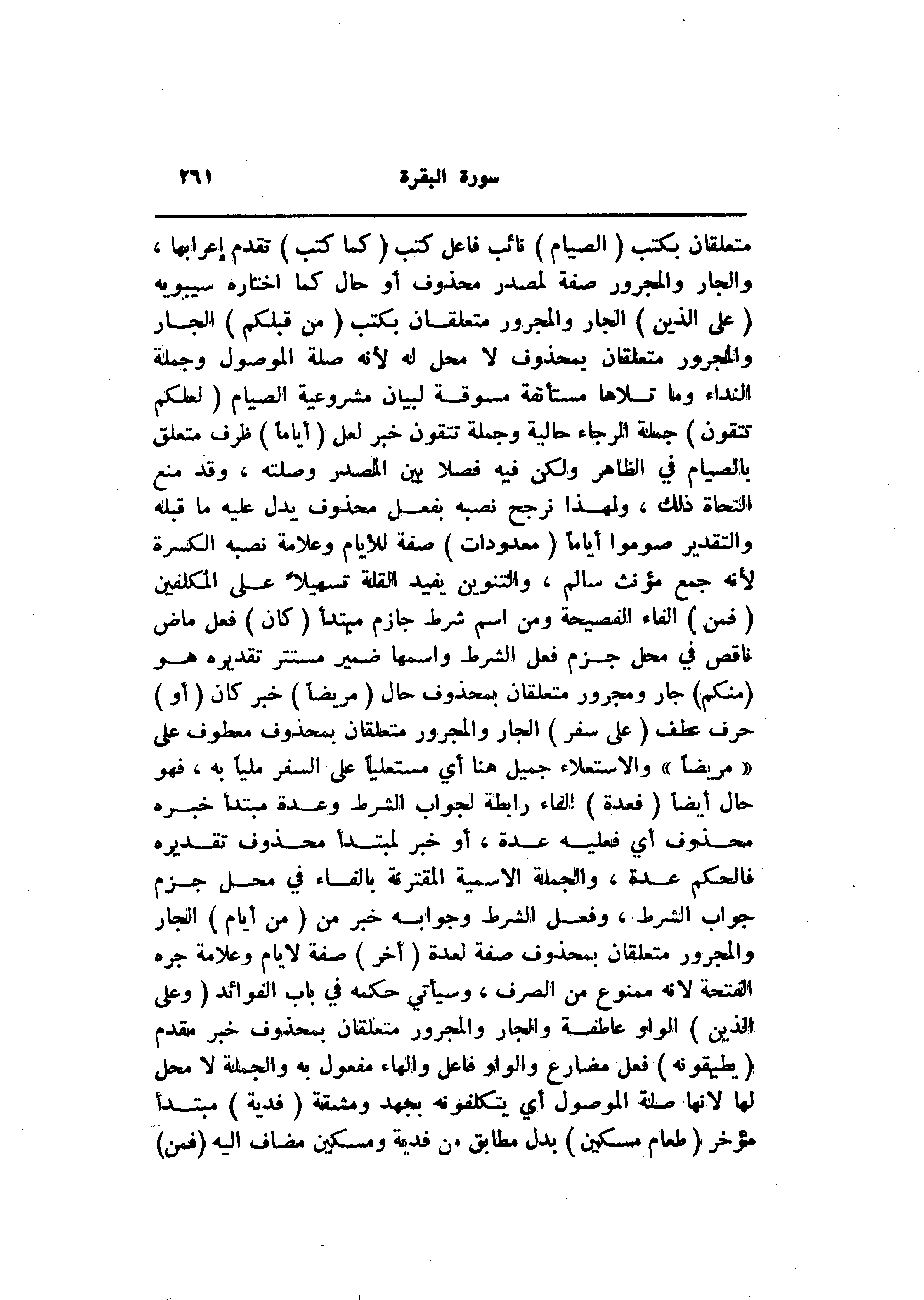 متعلقان بكتب (الصِّيامُ) نائب فاعل كتب (كَما كُتِبَ) تقدم إعرابها، والجار والمجرور صفة لمصدر محذوف أو حال كما اختاره سيبويه (عَلَى الَّذِينَ) الجار والمجرور متعلقان بكتب (مِنْ قَبْلِكُمْ) الجار والمجرور متعلقان بمحذوف لا محل له لأنه صلة الموصول وجملة النداء وما تلاها مستأنفة مسوقة لبيان مشروعية الصيام (لَعَلَّكُمْ تَتَّقُونَ) جملة الرجاء حالية وجملة تتقون خبر لعل (أَيَّاماً) ظرف متعلق بالصيام في الظاهر ولكن فيه فصلا بين المصدر وصلته، وقد منع النحاة ذلك، ولهذا نرجح نصبه بفعل محذوف يدل عليه ما قبله والتقدير صوموا أياما (مَعْدُوداتٍ) صفة للأيام وعلامة نصبه الكسرة لأنه جمع مؤنث سالم، والتنوين يفيد القلة تسهيلا على المكلفين (فَمَنْ) الفاء الفصيحة ومن اسم شرط جازم مبتدأ (كانَ) فعل ماض ناقص في محل جزم فعل الشرط واسمها ضمير مستتر تقديره هو (مِنْكُمْ) جار ومجرور متعلقان بمحذوف حال (مَرِيضاً) خبر كان (أَوْ) حرف عطف (عَلى سَفَرٍ) الجار والمجرور متعلقان بمحذوف معطوف على «مريضا» والاستعلاء جميل هنا أي مستعليا على السفر مليا به، فهو حال أيضا (فَعِدَّةٌ) الفاء رابطة لجواب الشرط وعدة مبتدأ خبره محذوف أي فعليه عدة، أو خبر لمبتدأ محذوف تقديره فالحكم عدة، والجملة الاسمية المقترنة بالفاء في محل جزم جواب الشرط، وفعل الشرط وجوابه خبر من (مِنْ أَيَّامٍ) الجار والمجرور متعلقان بمحذوف صفة لعدة (أُخَرَ) صفة لايام وعلامة جره الفتحة لانه ممنوع من الصرف، وسيأتي حكمه في باب الفوائد (وَعَلَى الَّذِينَ) الواو عاطفة والجار والمجرور متعلقان بمحذوف خبر مقدم (يُطِيقُونَهُ) فعل مضارع والواو فاعل والهاء مفعول به والجملة لا محل لها لانها صلة الموصول أي يتكلفونه بجهد ومشقة (فِدْيَةٌ) مبتدأ مؤخر (طَعامُ مِسْكِينٍ) بدل مطابق من فدية ومسكين مضاف اليه (فَمَنْ)
