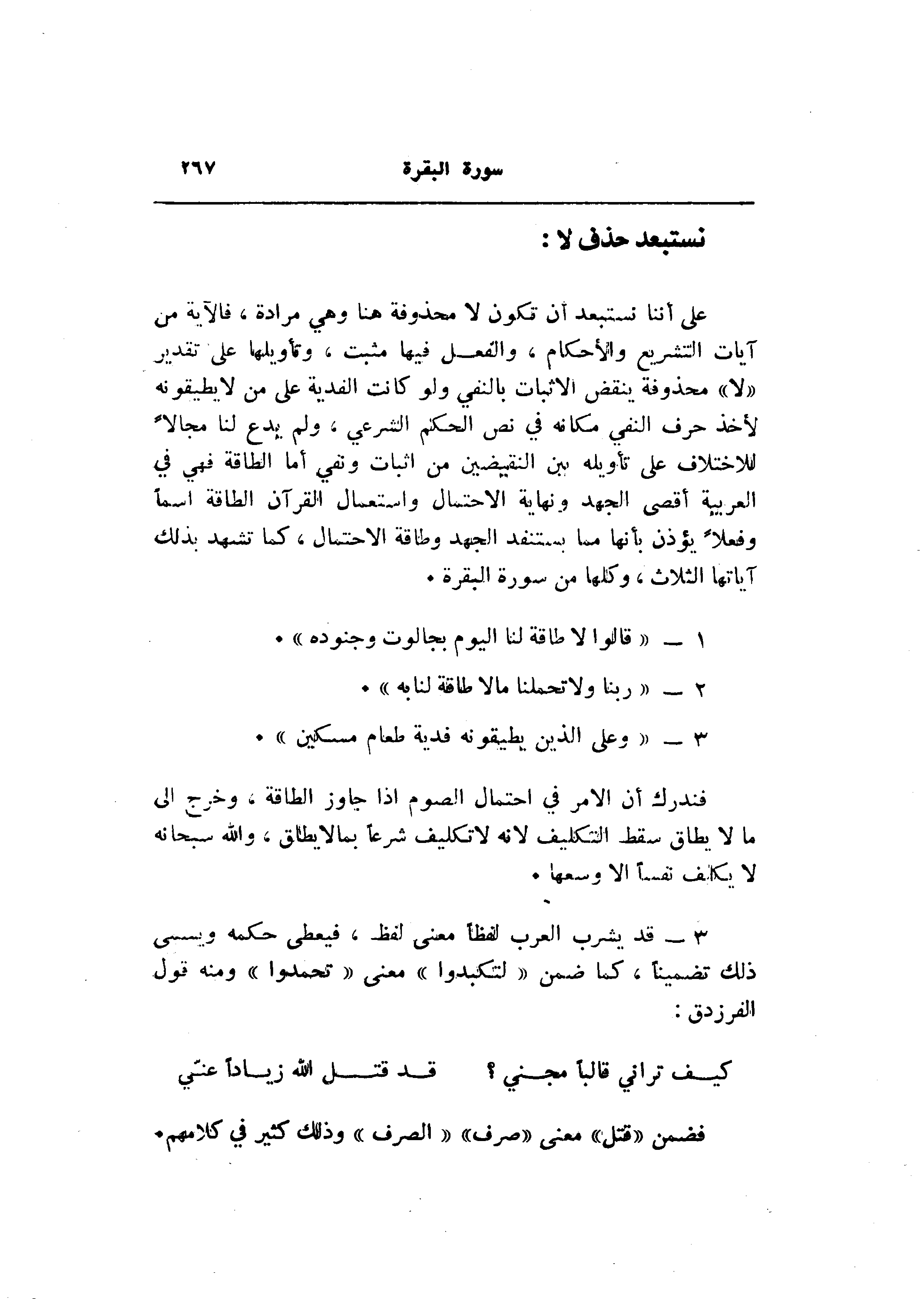 على أننا نستبعد أن تكون لا محذوفة هنا وهي مرادة، فالآية من آيات التشريع والأحكام، والفعل فيها مثبت، وتأويلها على تقدير «لا» محذوفة ينقض الإثبات بالنفي ولو كانت الفدية على من لا يطيقونه لأخذ حرف النفي مكانه في نص الحكم الشرعي، ولم يدع لنا مجالا للاختلاف على تأويله بين النقيضين من اثبات ونفي أما الطاقة فهي في العربية أقصى الجهد ونهاية الاحتمال واستعمال القرآن الطاقة اسما وفعلا يؤذن بأنها مما يستنفد الجهد وطاقة الاحتمال، كما تشهد بذلك آياتها الثلاث، وكلها من سورة البقرة.