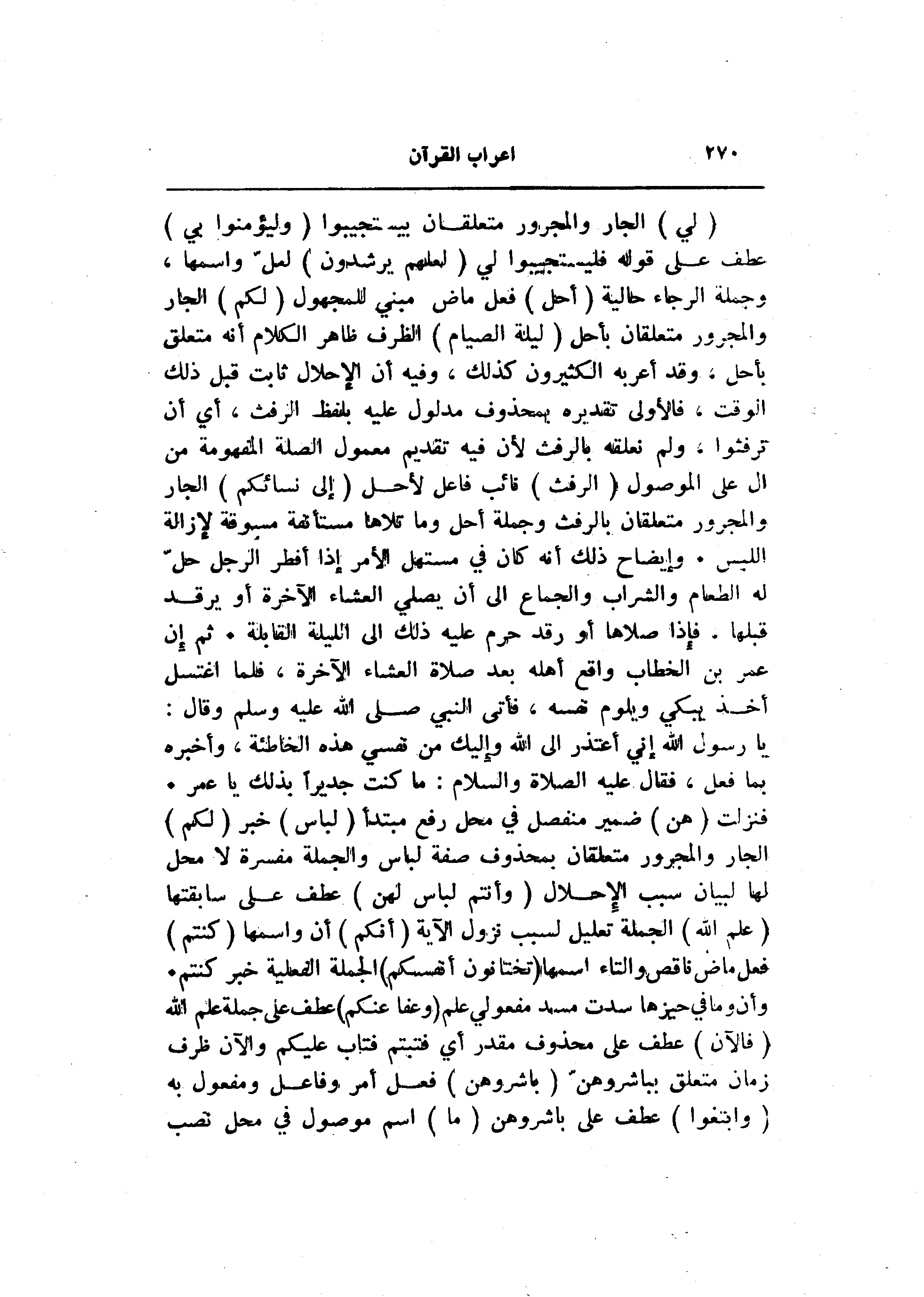 (لِي) الجار والمجرور متعلقان بيستجيبوا (وَلْيُؤْمِنُوا بِي) عطف على قوله فليستجيبوا لي (لَعَلَّهُمْ يَرْشُدُونَ) لعلّ واسمها، وجملة الرجاء حالية (أُحِلَّ) فعل ماض مبني للمجهول (لَكُمْ) الجار والمجرور متعلقان بأحل (لَيْلَةَ الصِّيامِ) الظرف ظاهر الكلام أنه متعلق بأحل، وقد أعربه الكثيرون كذلك، وفيه أن الإحلال ثابت قبل ذلك الوقت، فالأولى تقديره بمحذوف مدلول عليه بلفظ الرفث، أي أن ترفثوا، ولم نعلقه بالرفث لأن فيه تقديم معمول الصلة المفهومة من ال على الموصول (الرَّفَثُ) نائب فاعل لأحل (إِلى نِسائِكُمْ) الجار والمجرور متعلقان بالرفث وجملة أحل وما تلاها مستأنفة مسوقة لإزالة اللبس. وإيضاح ذلك أنه كان في مستهل الأمر إذا أفطر الرجل حلّ له الطعام والشراب والجماع الى أن يصلي العشاء الآخرة أو يرقد قلبها. فإذا صلاها أو رقد حرم عليه ذلك الى الليلة القابلة. ثم إن عمر بن الخطاب واقع أهله بعد صلاة العشاء الآخرة، فلما اغتسل أخذ يبكي ويلوم نفسه، فأتى النبي صلى الله عليه وسلم وقال: