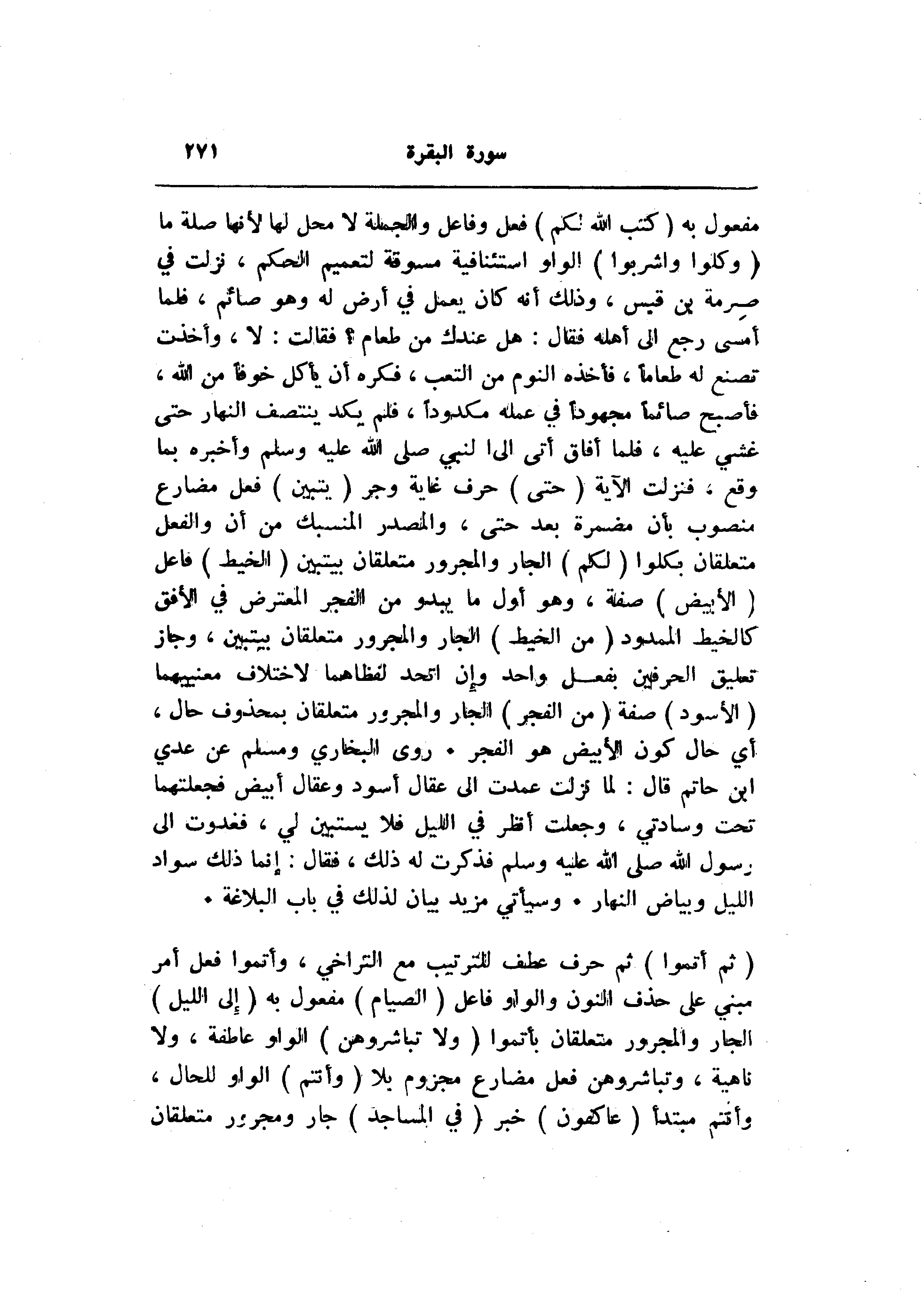 مفعول به (كَتَبَ اللَّهُ لَكُمْ) فعل وفاعل والجملة لا محل لها لأنها صلة ما (وَكُلُوا وَاشْرَبُوا) الواو استئنافية مسوقة لتعميم الحكم، نزلت في صرمة بن قبس، وذلك أنه كان يعمل في أرض له وهو صائم، فلما أمسى رجع الى أهله فقال: هل عندك من طعام؟ فقالت: لا، وأخذت تصنع له طعاما، فأخذه النوم من التعب، فكره أن يأكل خوفا من الله، فأصبح صائما مجهودا في عمله مكدودا، فلم يكد ينتصف النهار حتى غشي عليه، فلما أفاق أتى الى النبي صلى الله عليه وسلم وأخبره بما وقع، فنزلت الآية (حَتَّى) حرف غاية وجر (يَتَبَيَّنَ) فعل مضارع منصوب بأن مضمرة بعد حتى، والمصدر المنسبك من أن والفعل متعلقان بكلوا (لَكُمْ) الجار والمجرور متعلقان بيتبين (الْخَيْطُ) فاعل (الْأَبْيَضُ) صفة، وهو أول ما يبدو من الفجر المعترض في الأفق كالخيط الممدود (مِنَ الْخَيْطِ) الجار والمجرور متعلقان بيتبين، وجاز تعليق الحرفين بفعل واحد وإن اتحد لفظاهما لاختلاف معنييهما (الْأَسْوَدِ) صفة (مِنَ الْفَجْرِ) الجار والمجرور متعلقان بمحذوف حال، أي حال كون الأبيض هو الفجر. روى البخاري ومسلم عن عدي ابن حاتم قال: لما نزلت عمدت الى عقال أسود وعقال أبيض فجعلتهما تحت وسادتي، وجعلت أنظر في الليل فلا يستبين لي، فغدوت الى رسول الله صلى الله عليه وسلم فذكرت له ذلك، فقال: إنما ذلك سواد الليل وبياض النهار. وسيأتي مزيد بيان لذلك في باب البلاغة.