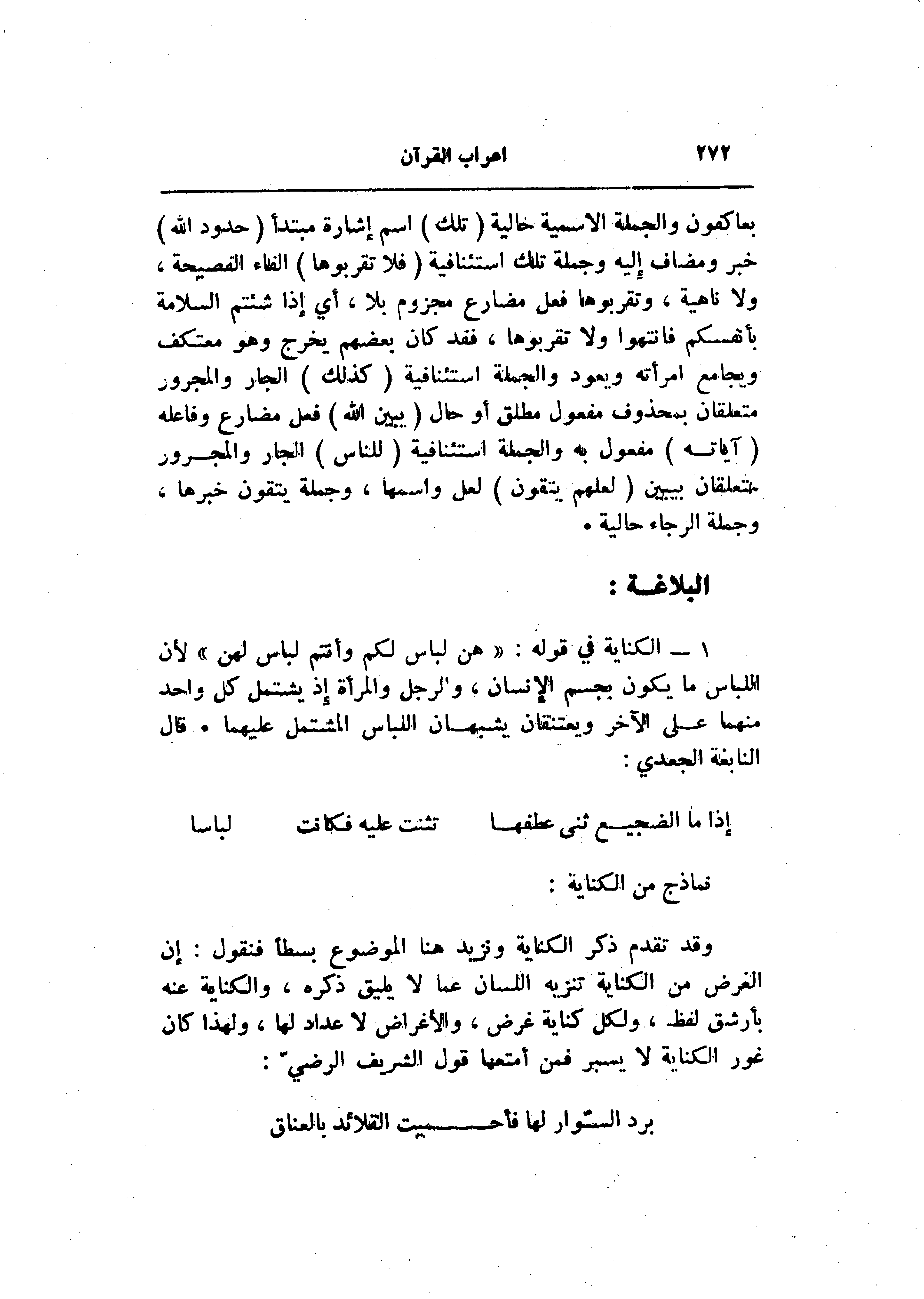 1- الكناية في قوله: «هن لباس لكم وأنتم لباس لهن» لأن اللباس ما يكون بجسم الإنسان، والرجل والمرأة إذ يشتمل كل واحد منهما على الآخر ويعتنقان يشبهان اللباس المشتمل عليهما. قال النابغة الجعدي: