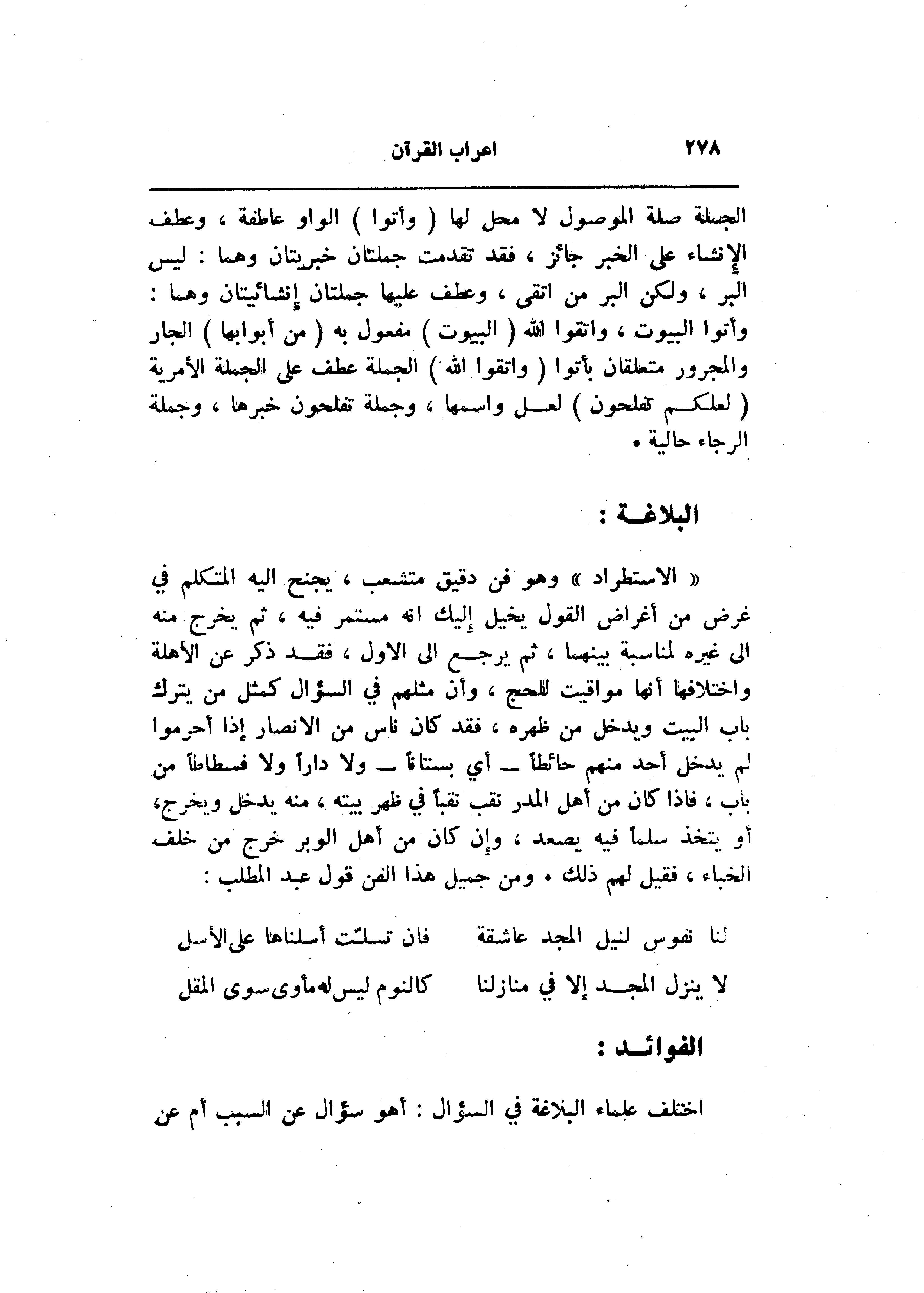 «الاستطراد» وهو فن دقيق متشعب، يجنح اليه المتكلم في غرض من أغراض القول يخيل إليك انه مستمر فيه، ثم يخرج منه الى غيره لمناسبة بينهما، ثم يرجع الى الاول، فقد ذكر عن الأهلة واختلافها أنها مواقيت للحج، وأن مثلهم في السؤال كمثل من يترك باب البيت ويدخل من ظهره، فقد كان ناس من الأنصار إذا أحرموا لم يدخل أحد منهم حائطا- أي بستانا- ولا دارا ولا فسطاطا من باب، فاذا كان من أهل المدر نقب نقبا في ظهر بيته، منه يدخل ويخرج، أو يتخذ سلما فيه يصعد، وإن كان من أهل الوبر خرج من خلف الخباء، فقيل لهم ذلك. ومن جميل هذا الفن قول عبد المطلب: