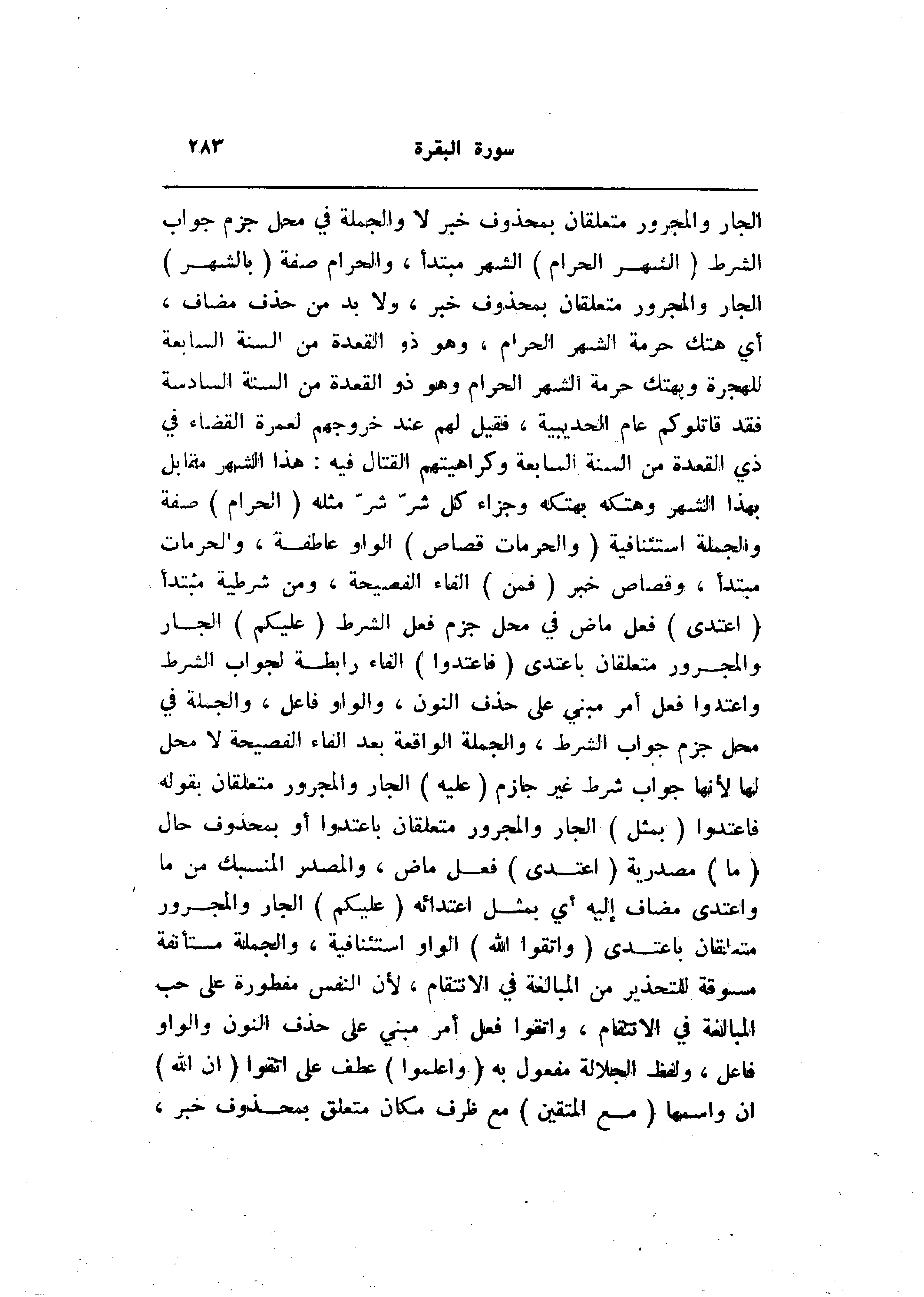 الجار والمجرور متعلقان بمحذوف خبر لا والجملة في محل جزم جواب الشرط (الشَّهْرُ الْحَرامُ) الشهر مبتدأ، والحرام صفة (بِالشَّهْرِ) الجار والمجرور متعلقان بمحذوف خبر، ولا بد من حذف مضاف، أي هتك حرمة الشهر الحرام، وهو ذو القعدة من السنة السابعة للهجرة وبهتك حرمة الشهر الحرام وهو ذو القعدة من السنة السادسة فقد قاتلوكم عام الحديبية، فقيل لهم عند خروجهم لعمرة القضاء في ذي القعدة من السنة السابعة وكراهيتهم القتال فيه: هذا الشهر مقابل بهذا الشهر وهتكه بهتكه وجزاء كل شرّ شرّ مثله (الْحَرامُ) صفة والجملة استئنافية (وَالْحُرُماتُ قِصاصٌ) الواو عاطفة، والحرمات مبتدأ، وقصاص خبر (فَمَنِ) الفاء الفصيحة، ومن شرطية مبتدأ (اعْتَدى) فعل ماض في محل جزم فعل الشرط (عَلَيْكُمْ) الجار والمجرور متعلقان باعتدى (فَاعْتَدُوا) الفاء رابطة لجواب الشرط واعتدوا فعل أمر مبني على حذف النون، والواو فاعل، والجملة في محل جزم جواب الشرط، والجملة الواقعة بعد الفاء الفصيحة لا محل لها لأنها جواب شرط غير جازم (عَلَيْهِ) الجار والمجرور متعلقان بقوله فاعتدوا (بِمِثْلِ) الجار والمجرور متعلقان باعتدوا أو بمحذوف حال (مَا) مصدرية (اعْتَدى) فعل ماض، والمصدر المنسبك من ما واعتدى مضاف إليه أي بمثل اعتدائه (عَلَيْكُمْ) الجار والمجرور متعلقان باعتدى (وَاتَّقُوا اللَّهَ) الواو استئنافية، والجملة مستأنفة مسوقة للتحذير من المبالغة في الانتقام، لأن النفس مفطورة على حب المبالغة في الانتقام، واتقوا فعل أمر مبني على حذف النون والواو فاعل، ولفظ الجلالة مفعول به (وَاعْلَمُوا) عطف على اتقوا (أَنَّ اللَّهَ) ان واسمها (مَعَ الْمُتَّقِينَ) مع ظرف مكان متعلق بمحذوف خبر،