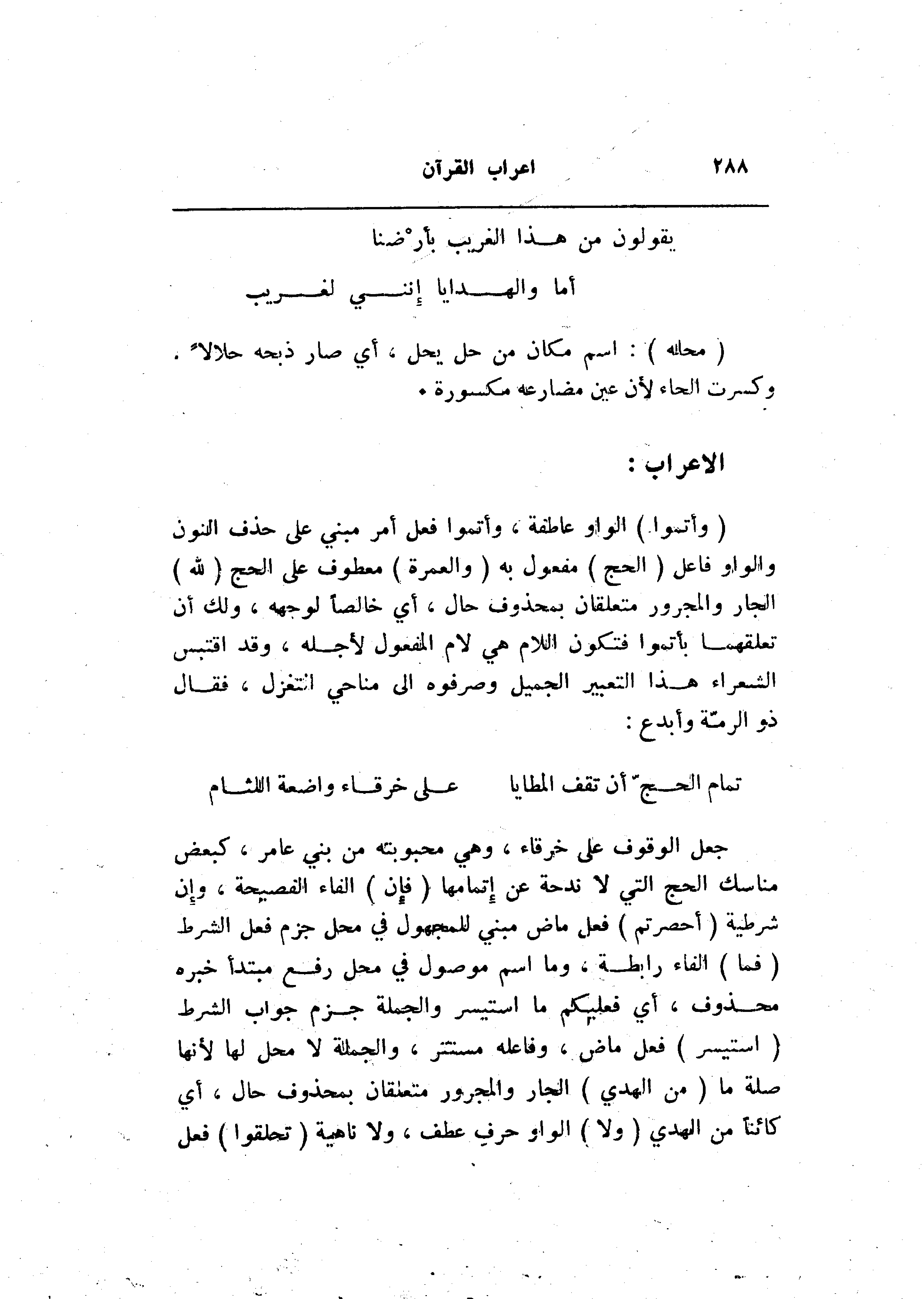 جعل الوقوف على خرقاء، وهي محبوبته من بني عامر، كبعض مناسك الحج التي لا ندحة عن إتمامها (فَإِنْ) الفاء الفصيحة، وإن شرطية (أُحْصِرْتُمْ) فعل ماض مبني للمجهول في محل جزم فعل الشرط (فَمَا) الفاء رابطة، وما اسم موصول في محل رفع مبتدأ خبره محذوف، أي فعليكم ما استيسر والجملة جزم جواب الشرط (اسْتَيْسَرَ) فعل ماض، وفاعله مستتر، والجملة لا محل لها لأنها صلة ما (مِنَ الْهَدْيِ) الجار والمجرور متعلقان بمحذوف حال، أي كائنا من الهدي (وَلا) الواو حرف عطف، ولا ناهية (تَحْلِقُوا) فعل