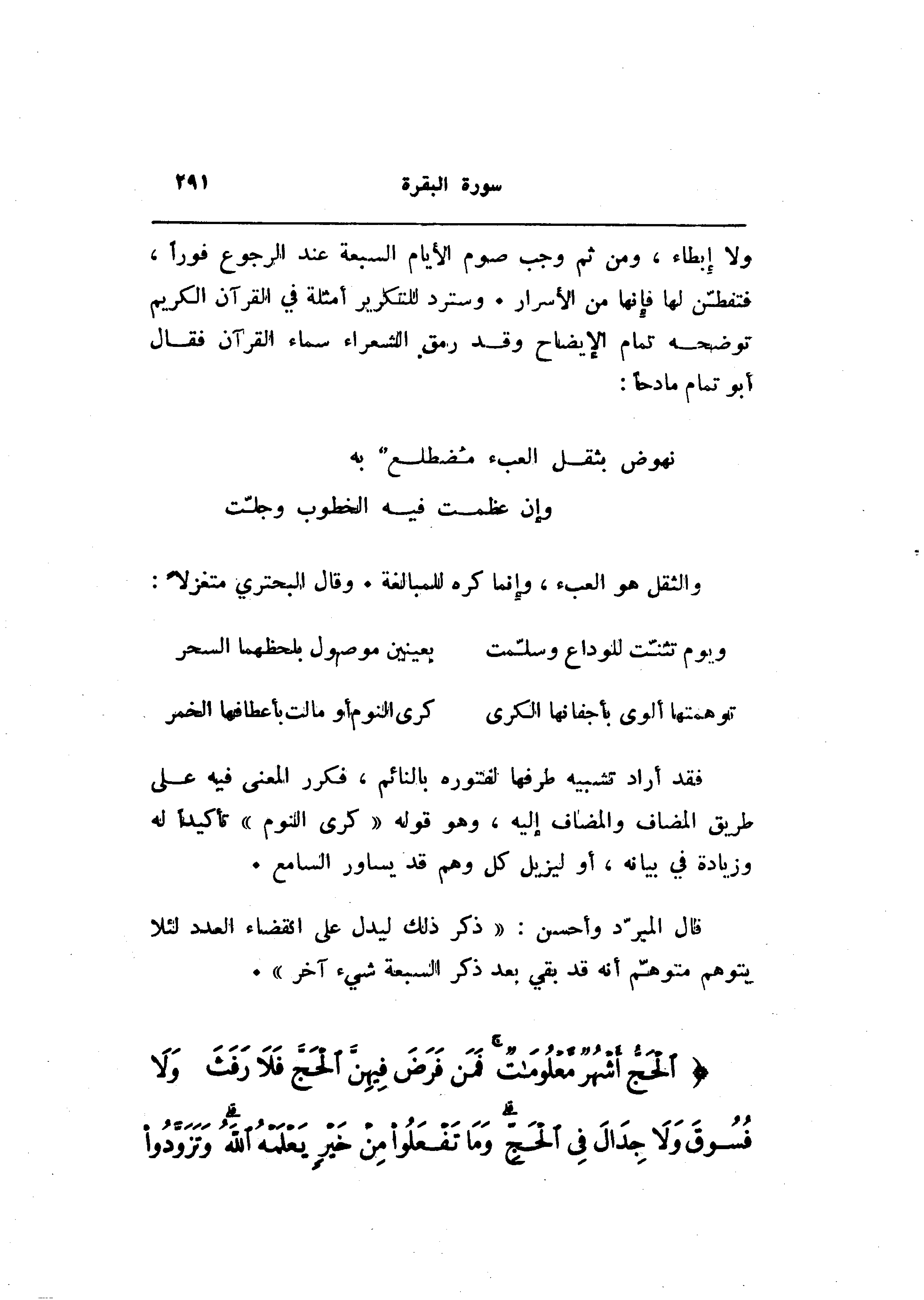 ولا إبطاء، ومن ثم وجب صوم الأيام السبعة عند الرجوع فورا، فتفطّن لها فإنها من الأسرار. وسترد للتكرير أمثلة في القرآن الكريم توضحه تمام الإيضاح وقد رمق الشعراء سماء القرآن فقال أبو تمام مادحا: