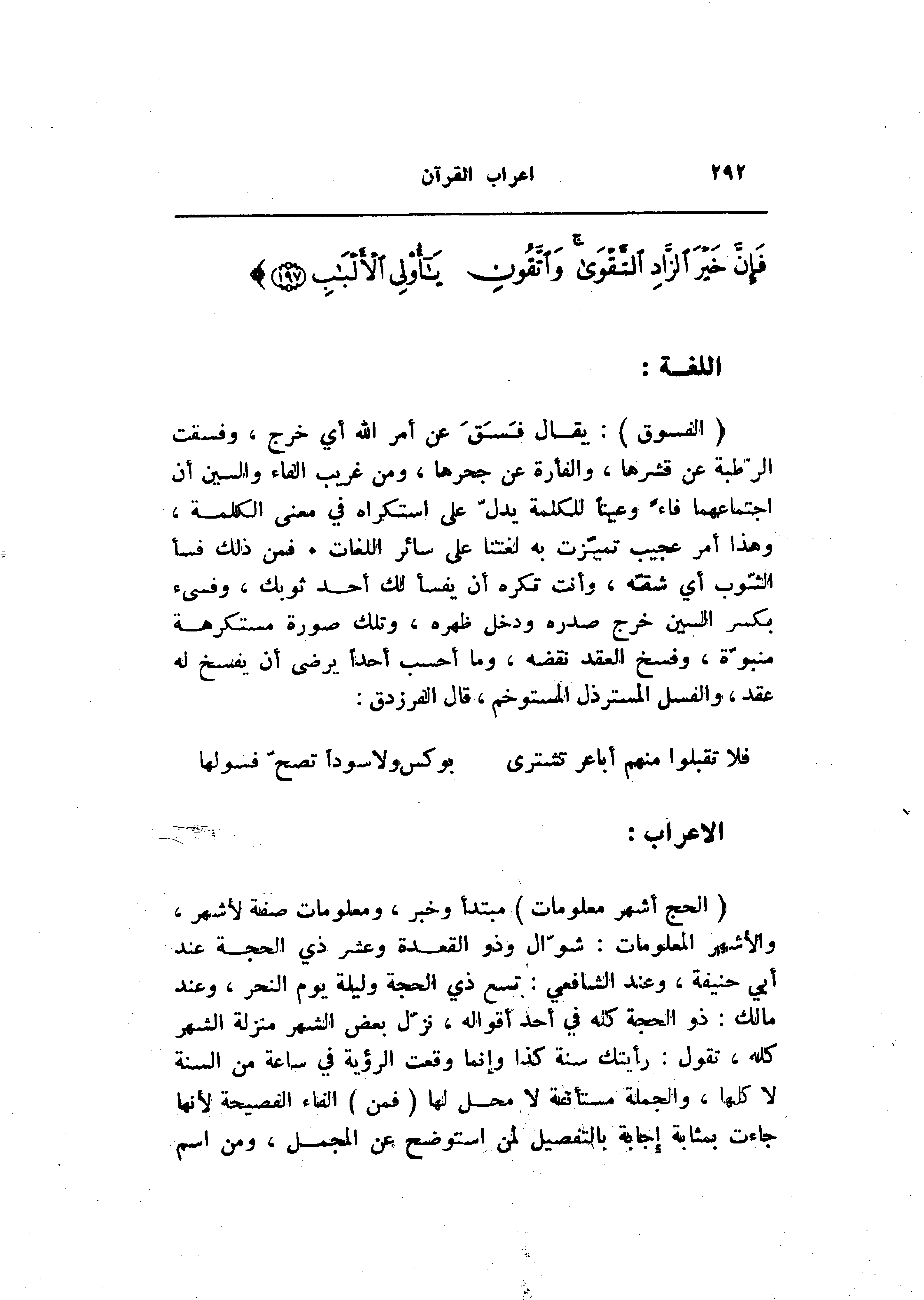 (الْحَجُّ أَشْهُرٌ مَعْلُوماتٌ) مبتدأ وخبر، ومعلومات صفة لأشهر، والأشهر المعلومات: شوّال وذو القعدة وعشر ذي الحجة عند أبي حنيفة، وعند الشافعي: تسع ذي الحجة وليلة يوم النحر، وعند مالك: ذو الحجة كله في أحد أقواله، نزّل بعض الشهر منزلة الشهر كله، تقول: رأيتك سنة كذا وإنما وقعت الرؤية في ساعة من السنة لا كلها، والجملة مستأنفة لا محل لها (فَمَنْ) الفاء الفصيحة لأنها جاءت بمثابة إجابة بالتفصيل لمن استوضح عن المجمل، ومن اسم