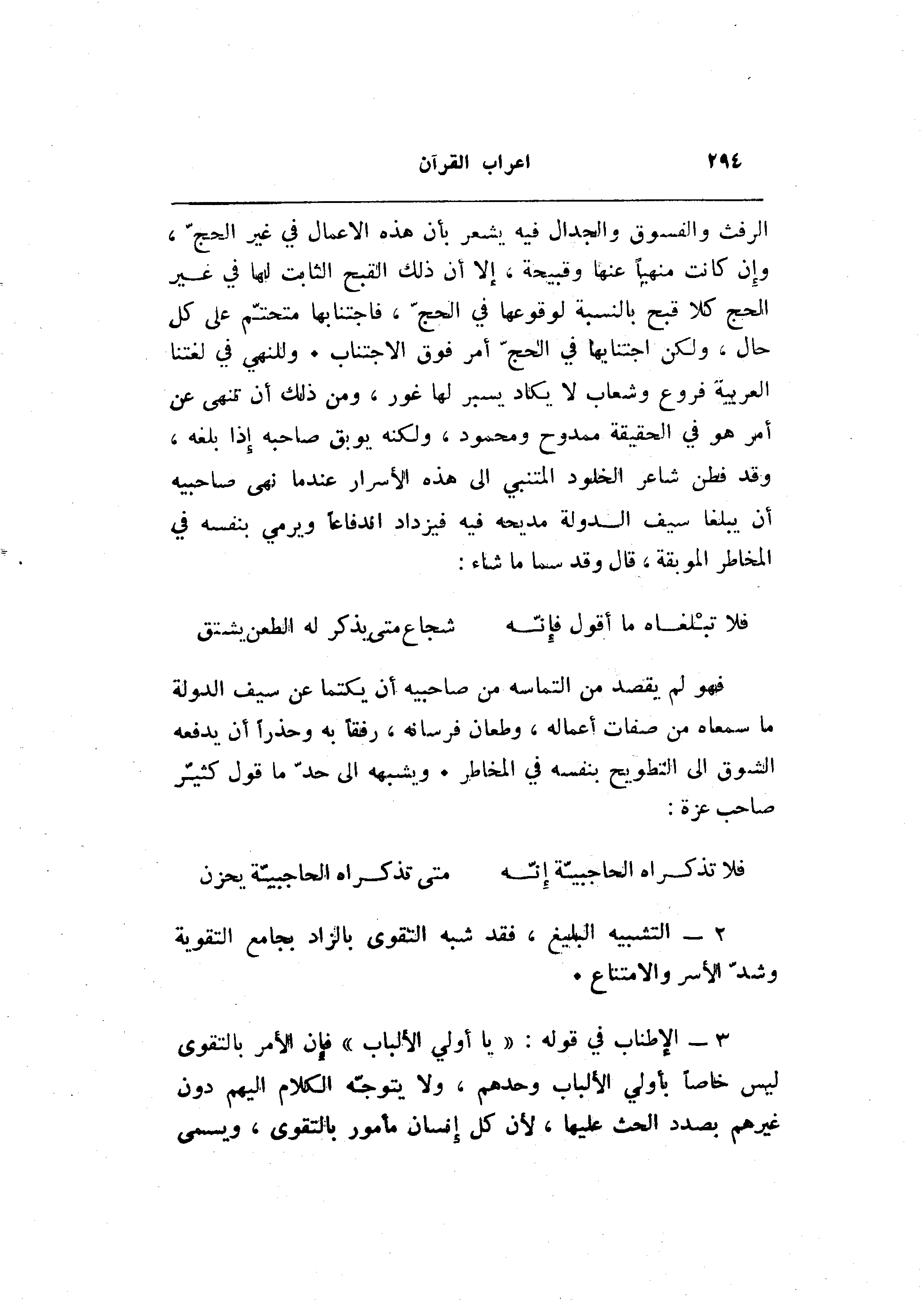3- الإطناب في قوله: «يا أولي الألباب» فإن الأمر بالتقوى ليس خاصا بأولي الألباب وحدهم، ولا يتوجّه الكلام إليهم دون غيرهم بصدد الحث عليها، لأن كل إنسان مأمور بالتقوى، ويسمى