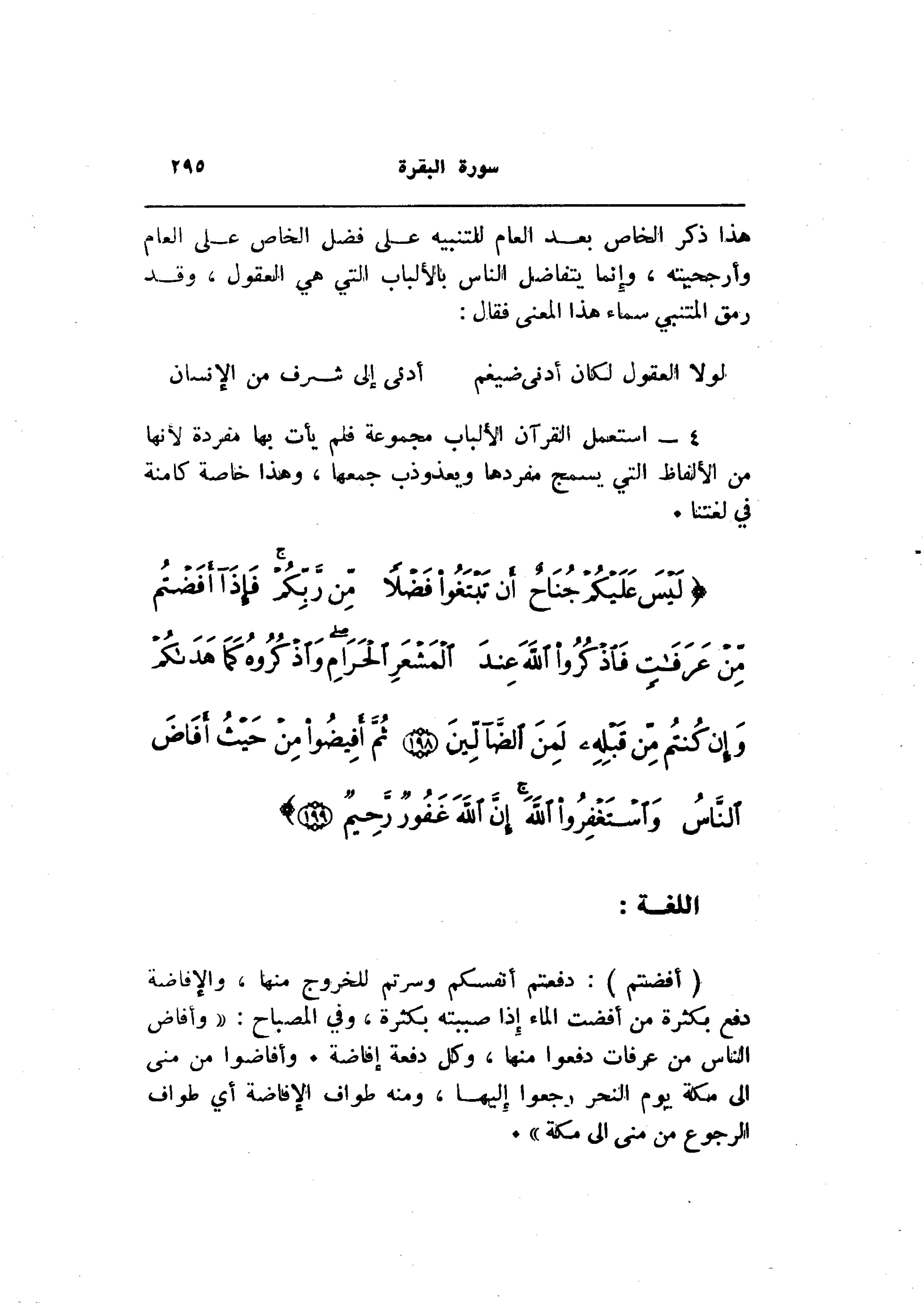 (أَفَضْتُمْ) : دفعتم أنفسكم وسرتم للخروج منها، والإفاضة دفع بكثرة من أفضت الماء إذا صببته بكثرة، وفي المصباح: «وأفاض الناس من عرفات دفعوا منها، وكل دفعة إفاضة. وأفاضوا من منى الى مكة يوم النحر رجعوا إليها، ومنه طواف الإفاضة أي طواف الرجوع من منى الى مكة» .