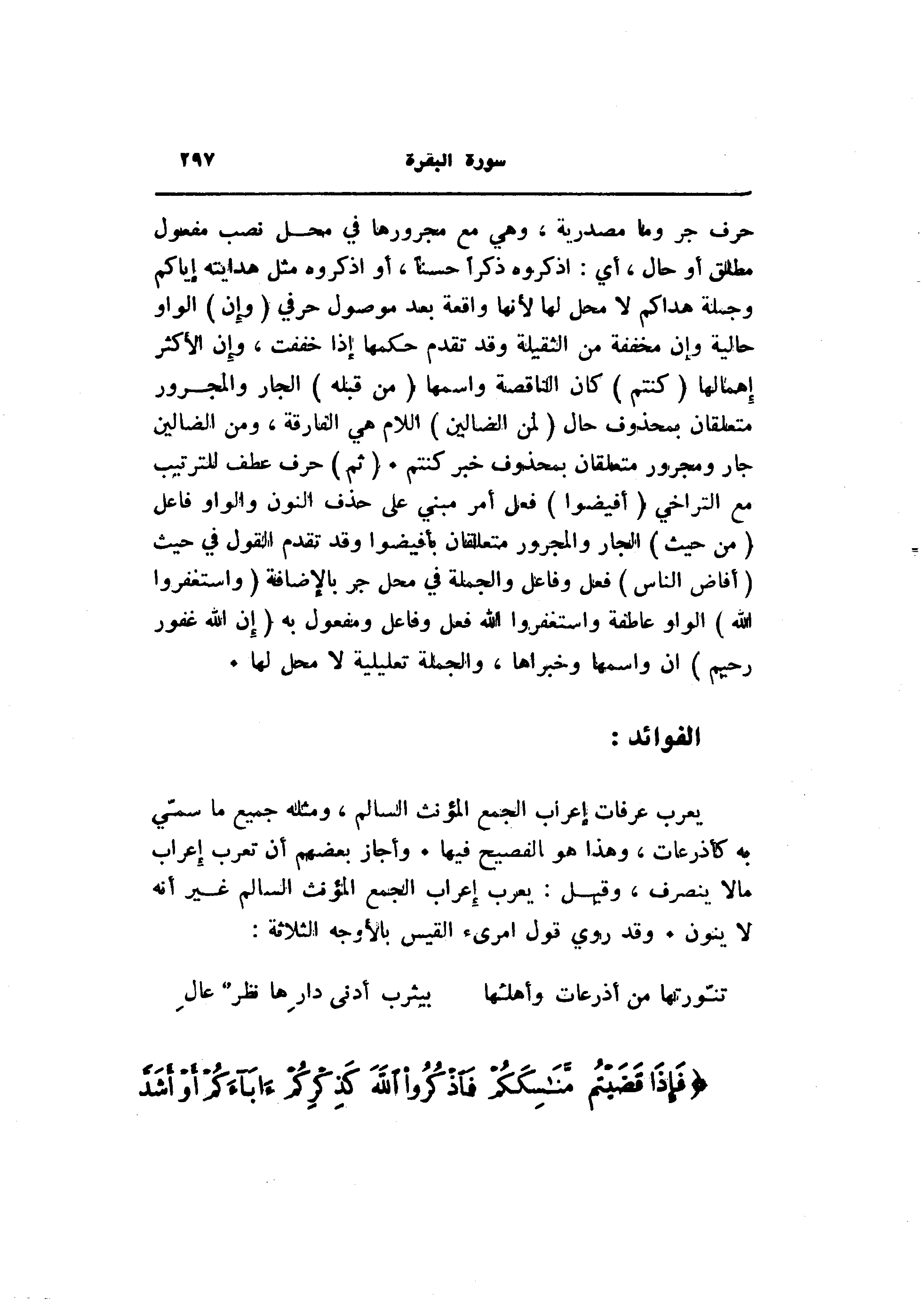 حرف جر وما مصدرية، وهي مع مجرورها في محل نصب مفعول مطلق أو حال، أي: اذكروه ذكرا حسنا، أو اذكروه مثل هدايته إياكم وجملة هداكم لا محل لها لأنها واقعة بعد موصول حرفي (وَإِنْ) الواو حالية وإن مخففة من الثقيلة وقد تقدم حكمها إذا خففت، وإن الأكثر إهمالها (كُنْتُمْ) كان الناقصة واسمها (مِنْ قَبْلِهِ) الجار والمجرور متعلقان بمحذوف حال (لَمِنَ الضَّالِّينَ) اللام هي الفارقة، ومن الضالين جار ومجرور متعلقان بمحذوف خبر كنتم. (ثُمَّ) حرف عطف للترتيب مع التراخي (أَفِيضُوا) فعل أمر مبني على حذف النون والواو فاعل (مِنْ حَيْثُ) الجار والمجرور متعلقان بأفيضوا وقد تقدم القول في حيث (أَفاضَ النَّاسُ) فعل وفاعل والجملة في محل جر بالإضافة (وَاسْتَغْفِرُوا اللَّهَ) الواو عاطفة واستغفروا الله فعل وفاعل ومفعول به (إِنَّ اللَّهَ غَفُورٌ رَحِيمٌ) ان واسمها وخبراها، والجملة تعليلية لا محل لها.
