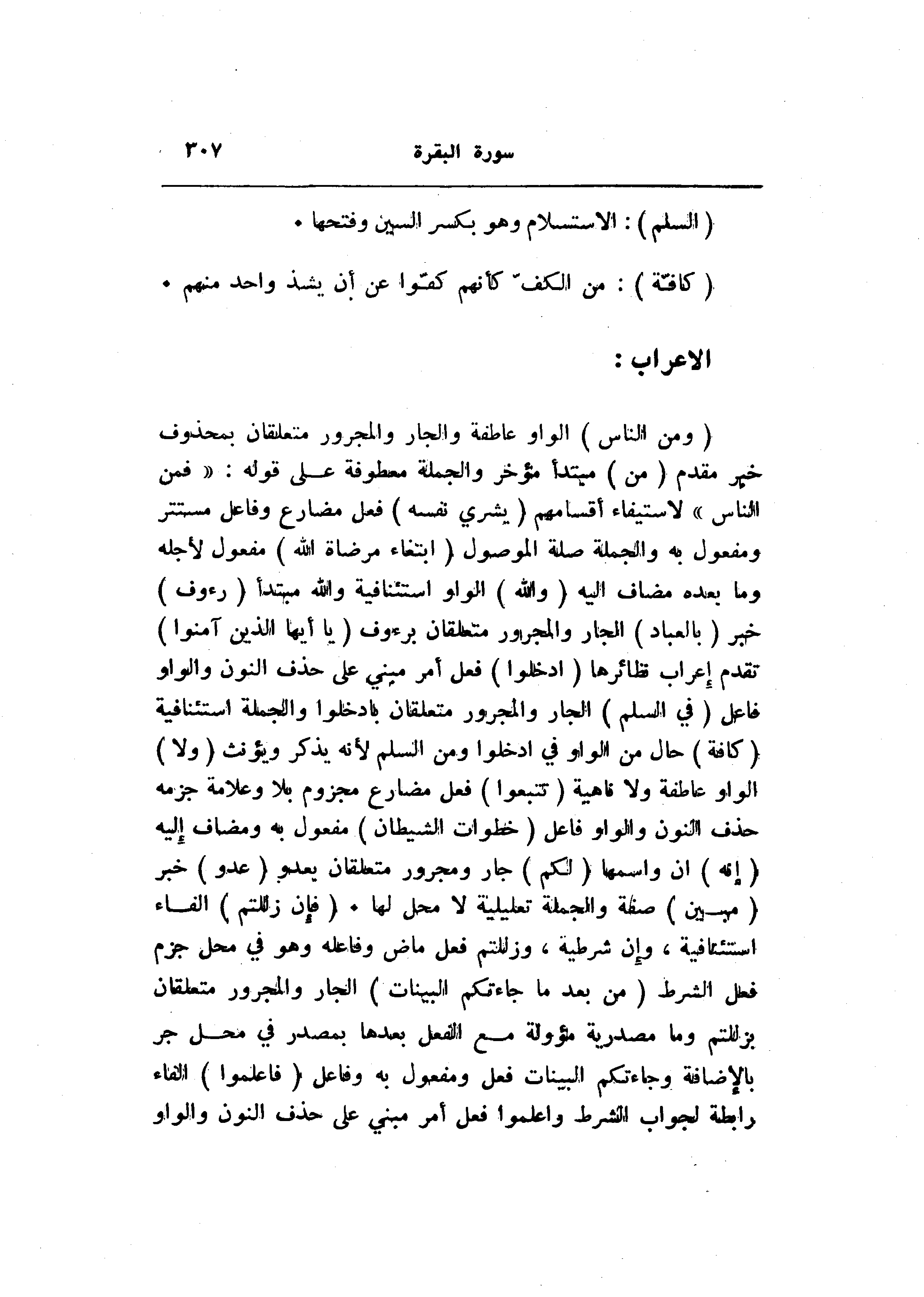 (وَمِنَ النَّاسِ) الواو عاطفة والجار والمجرور متعلقان بمحذوف خبر مقدم (مِنَ) مبتدأ مؤخر والجملة معطوفة على قوله: «فمن الناس» لاستيفاء أقسامهم (يَشْرِي نَفْسَهُ) فعل مضارع وفاعل مستتر ومفعول به والجملة صلة الموصول (ابْتِغاءَ مَرْضاتِ اللَّهِ) مفعول لأجله وما بعده مضاف اليه (وَاللَّهُ) الواو استئنافية والله مبتدأ (رَؤُفٌ) خبر (بِالْعِبادِ) الجار والمجرور متعلقان برءوف (يا أَيُّهَا الَّذِينَ آمَنُوا) تقدم إعراب نظائرها (ادْخُلُوا) فعل أمر مبني على حذف النون والواو فاعل (فِي السِّلْمِ) الجار والمجرور متعلقان بادخلوا والجملة استئنافية (كَافَّةً) حال من الواو في ادخلوا ومن السلم لأنه يذكر ويؤنث (وَلا) الواو عاطفة ولا ناهية (تَتَّبِعُوا) فعل مضارع مجزوم بلا وعلامة جزمه حذف النون والواو فاعل (خُطُواتِ الشَّيْطانِ) مفعول به ومضاف إليه (إِنَّهُ) ان واسمها (لَكُمْ) جار ومجرور متعلقان بعدو (عَدُوٌّ) خبر (مُبِينٌ) صفة والجملة تعليلية لا محل لها. (فَإِنْ زَلَلْتُمْ) الفاء استئنافية، وإن شرطية، وزللتم فعل ماض وفاعله وهو في محل جزم فعل الشرط (مِنْ بَعْدِ ما جاءَتْكُمُ الْبَيِّناتُ) الجار والمجرور متعلقان بزللتم وما مصدرية مؤولة مع الفعل بعدها بمصدر في محل جر بالإضافة وجاءتكم البينات فعل ومفعول به وفاعل (فَاعْلَمُوا) الفاء رابطة لجواب الشرط واعلموا فعل أمر مبني على حذف النون والواو