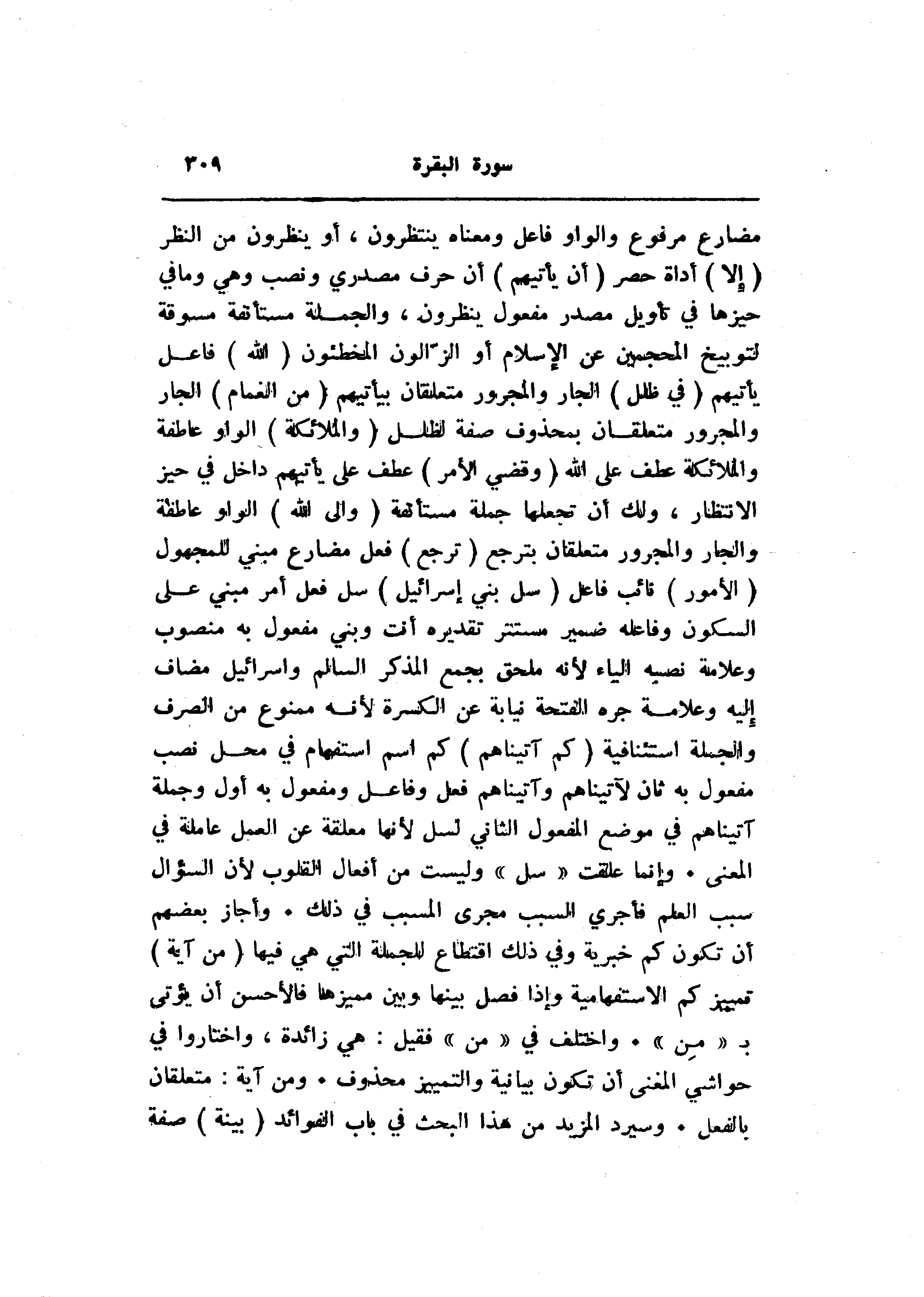 مضارع مرفوع والواو فاعل ومعناه ينتظرون، أو ينظرون من النظر (إِلَّا) أداة حصر (أَنْ يَأْتِيَهُمُ) أن حرف مصدري ونصب وهي وما في حيزها في تأويل مصدر مفعول ينظرون، والجملة مستأنفة مسوقة لتوبيخ المحجمين عن الإسلام أو الزّالون المخطئون (اللَّهُ) فاعل يأتيهم (فِي ظُلَلٍ) الجار والمجرور متعلقان بيأتيهم (مِنَ الْغَمامِ) الجار والمجرور متعلقان بمحذوف صفة لظلل (وَالْمَلائِكَةُ) الواو عاطفة والملائكة عطف على الله (وَقُضِيَ الْأَمْرُ) عطف على يأتيهم داخل في حيز الانتظار، ولك أن تجعلها جملة مستأنفة (وَإِلَى اللَّهِ) الواو عاطفة والجار والمجرور متعلقان بترجع (تُرْجَعُ) فعل مضارع مبني للمجهول (الْأُمُورُ) نائب فاعل (سَلْ بَنِي إِسْرائِيلَ) سل فعل أمر مبني على السكون وفاعله ضمير مستتر تقديره أنت وبني مفعول به منصوب وعلامة نصبه الياء لأنه ملحق بجمع المذكر السالم وإسرائيل مضاف إليه وعلامة جره الفتحة نيابة عن الكسرة لأنه ممنوع من الصرف والجملة استئنافية (كَمْ آتَيْناهُمْ) كم اسم استفهام في محل نصب مفعول به ثان لآتيناهم وآتيناهم فعل وفاعل ومفعول به أول وجملة آتيناهم في موضع المفعول الثاني لسل لأنها معلقة عن العمل عاملة في المعنى. وإنما علقت «سل» وليست من أفعال القلوب لأن السؤال سبب العلم فأجري السبب مجرى المسبب في ذلك. وأجاز بعضهم أن تكون كم خبرية وفي ذلك اقتطاع للجملة التي هي فيها (مِنْ آيَةٍ) تمييز كم الاستفهامية وإذا فصل بينها وبين مميزها فالأحسن أن يؤتى ب «من» . واختلف في «من» فقيل: هي زائدة، واختاروا في حواشي المغني أن تكون بيانية والتمييز محذوف. ومن آية: متعلقان بالفعل. وسيرد المزيد من هذا البحث في باب الفوائد (بَيِّنَةٍ) صفة