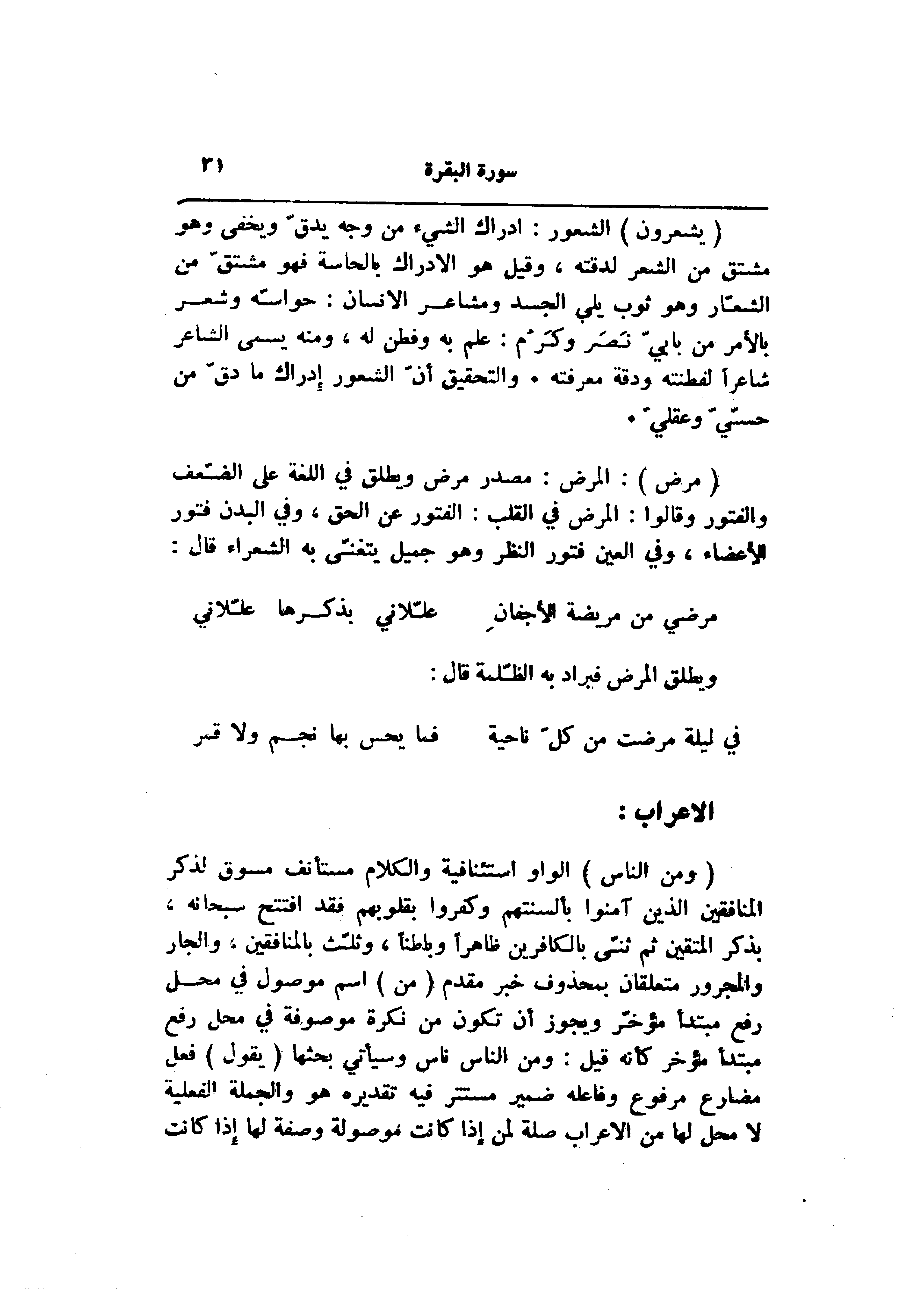 (مَرَضٌ) : المرض: مصدر مرض ويطلق في اللغة على الضّعف والفتور وقالوا: المرض في القلب: الفتور عن الحق، وفي البدن فتور الأعضاء، وفي العين فتور النظر وهو جميل يتغنّى به الشعراء قال:
