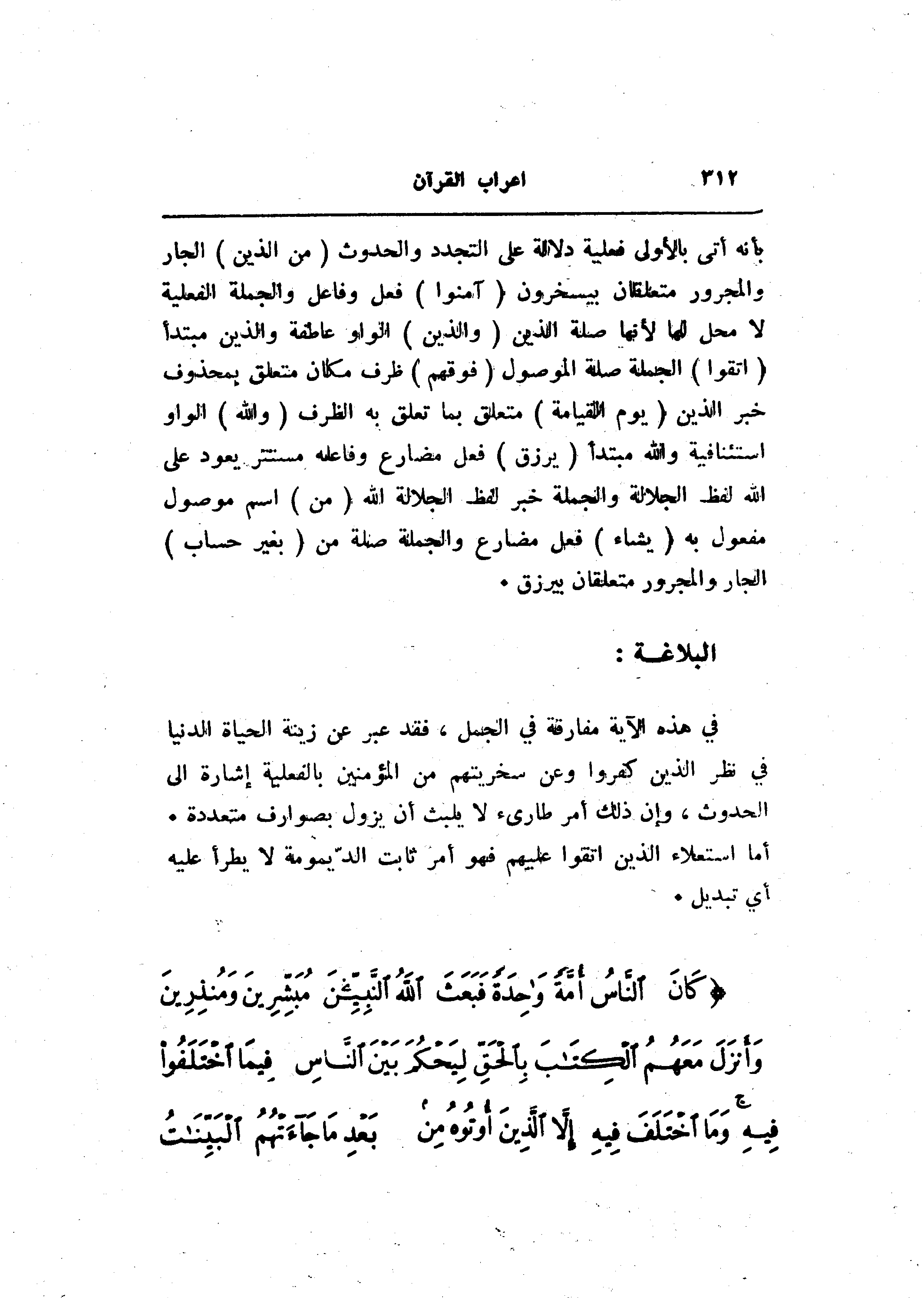بأنه أتى بالأولى فعلية دلالة على التجدد والحدوث (مِنَ الَّذِينَ) الجار والمجرور متعلقان بيسخرون (آمَنُوا) فعل وفاعل والجملة الفعلية لا محل لها لأنها صلة الذين (وَالَّذِينَ) الواو عاطفة والذين مبتدأ (اتَّقَوْا) الجملة صلة الموصول (فَوْقَهُمْ) ظرف مكان متعلق بمحذوف خبر الذين (يَوْمَ الْقِيامَةِ) متعلق بما تعلق به الظرف (وَاللَّهُ) الواو استئنافية والله مبتدأ (يَرْزُقُ) فعل مضارع وفاعله مستتر يعود على الله لفظ الجلالة والجملة خبر لفظ الجلالة الله (مِنَ) اسم موصول مفعول به (يَشاءُ) فعل مضارع والجملة صلة من (بِغَيْرِ حِسابٍ) الجار والمجرور متعلقان بيرزق.