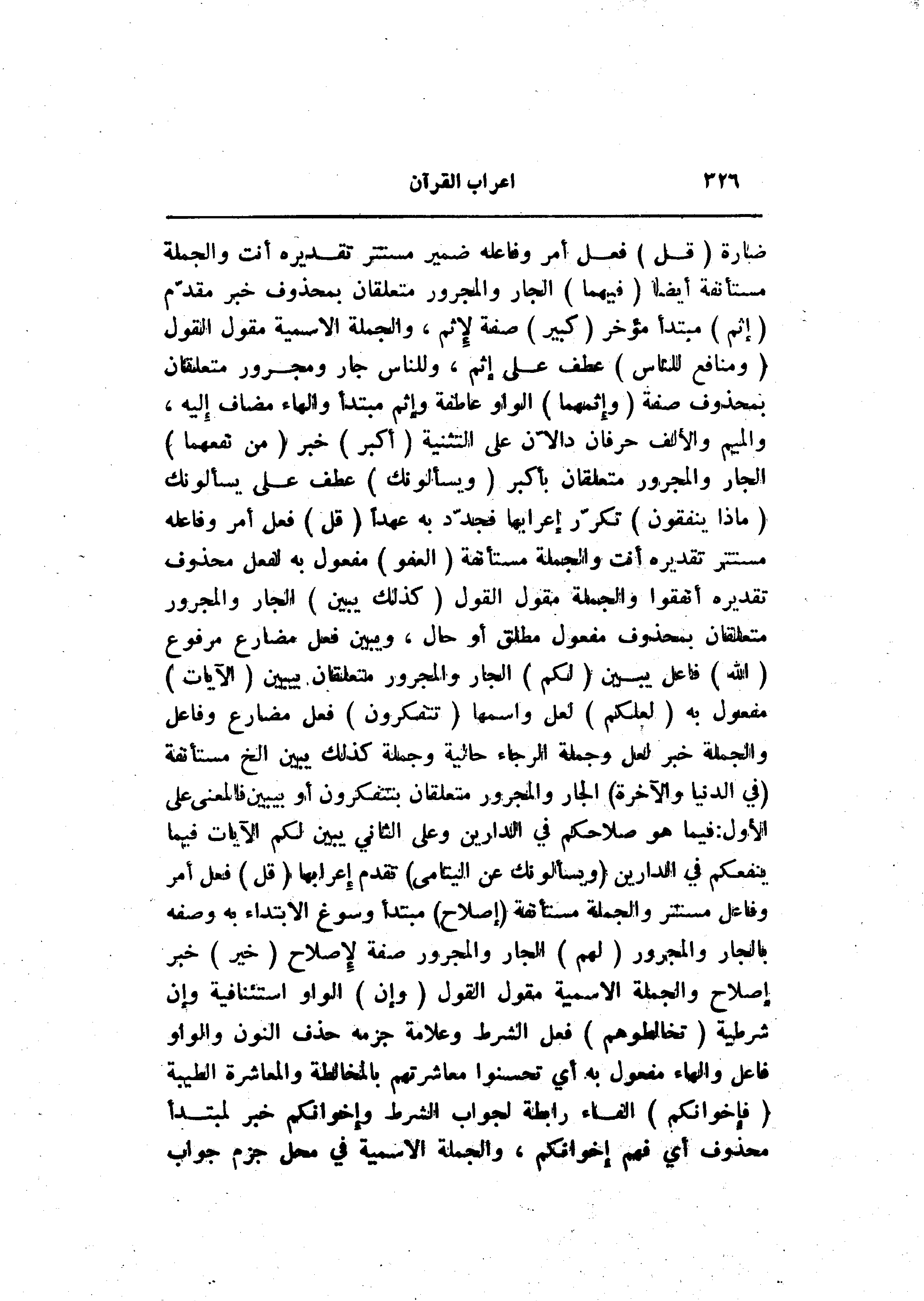 ضارة (قُلْ) فعل أمر وفاعله ضمير مستتر تقديره أنت والجملة مستأنفة أيضا (فِيهِما) الجار والمجرور متعلقان بمحذوف خبر مقدّم (إِثْمٌ) مبتدأ مؤخر (كَبِيرٌ) صفة لإثم، والجملة الاسمية مقول القول (وَمَنافِعُ لِلنَّاسِ) عطف على إثم، وللناس جار ومجرور متعلقان بمحذوف صفة (وَإِثْمُهُما) الواو عاطفة وإثم مبتدأ والهاء مضاف إليه، والميم والألف حرفان دالّان على التثنية (أَكْبَرُ) خبر (مِنْ نَفْعِهِما) الجار والمجرور متعلقان بأكبر (وَيَسْئَلُونَكَ) عطف على يسألونك (ماذا يُنْفِقُونَ) تكرّر إعرابها فجدّد به عهدا (قُلْ) فعل أمر وفاعله مستتر تقديره أنت والجملة مستأنفة (الْعَفْوَ) مفعول به لفعل محذوف تقديره أنفقوا والجملة مقول القول (كَذلِكَ يُبَيِّنُ) الجار والمجرور متعلقان بمحذوف مفعول مطلق أو حال، ويبين فعل مضارع مرفوع (اللَّهُ) فاعل يبين (لَكُمُ) الجار والمجرور متعلقان بيبين (الْآياتِ) مفعول به (لَعَلَّكُمْ) لعل واسمها (تَتَفَكَّرُونَ) فعل مضارع وفاعل والجملة خبر لعل وجملة الرجاء حالية وجملة كذلك يبين إلخ مستأنفة (فِي الدُّنْيا وَالْآخِرَةِ) الجار والمجرور متعلقان بتتفكرون أو بيبين فالمعنى على الأول: فيما هو صلاحكم في الدارين وعلى الثاني يبين لكم الآيات فيما ينفعكم في الدارين (وَيَسْئَلُونَكَ عَنِ الْيَتامى) تقدم إعرابها (قُلْ) فعل أمر وفاعل مستتر والجملة مستأنفة (إِصْلاحٌ) مبتدأ وسوغ الابتداء به وصفه بالجار والمجرور (لَهُمْ) الجار والمجرور صفة لإصلاح (خَيْرٌ) خبر إصلاح والجملة الاسمية مقول القول (وَإِنْ) الواو استئنافية وإن شرطية (تُخالِطُوهُمْ) فعل الشرط وعلامة جزمه حذف النون والواو فاعل والهاء مفعول به أي تحسنوا معاشرتهم بالمخالطة والمعاشرة الطيبة (فَإِخْوانُكُمْ) الفاء رابطة لجواب الشرط وإخوانكم خبر لمبتدأ محذوف أي فهم إخوانكم، والجملة الاسمية في محل جزم جواب