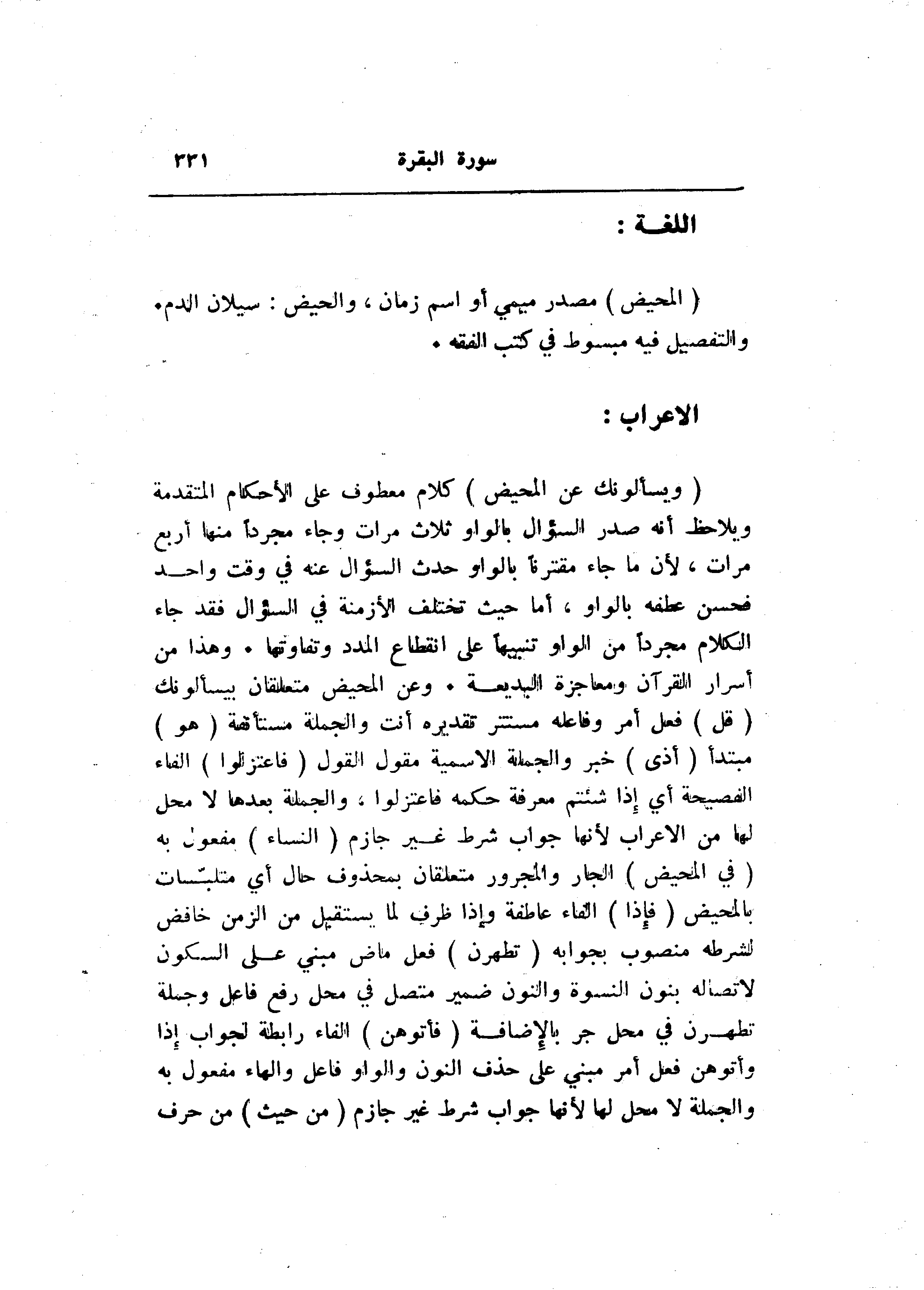 (وَيَسْئَلُونَكَ عَنِ الْمَحِيضِ) كلام معطوف على الأحكام المتقدمة ويلاحظ أنه صدر السؤال بالواو ثلاث مرات وجاء مجردا منها أربع مرات، لأن ما جاء مقترنا بالواو حدث السؤال عنه في وقت واحد فحسن عطفه بالواو، أما حيث تختلف الأزمنة في السؤال فقد جاء الكلام مجردا من الواو تنبيها على انقطاع المدد وتفاوتها. وهذا من أسرار القرآن ومعاجزة البديعة. وعن المحيض متعلقان بيسألونك (قُلْ) فعل أمر وفاعله مستتر تقديره أنت والجملة مستأنفة (هُوَ) مبتدأ (أَذىً) خبر والجملة الاسمية مقول القول (فَاعْتَزِلُوا) الفاء الفصيحة أي إذا شئتم معرفة حكمه فاعتزلوا، والجملة بعدها لا محل لها من الإعراب لأنها جواب شرط غير جازم (النِّساءَ) مفعول به (فِي الْمَحِيضِ) الجار والمجرور متعلقان بمحذوف حال أي متلبّسات بالمحيض (فَإِذا) الفاء عاطفة وإذا ظرف لما يستقبل من الزمن خافض لشرطه منصوب بجوابه (تَطَهَّرْنَ) فعل ماض مبني على السكون لاتصاله بنون النسوة والنون ضمير متصل في محل رفع فاعل وجملة تطهرن في محل جر بالإضافة (فَأْتُوهُنَّ) الفاء رابطة لجواب إذا وأتوهن فعل أمر مبني على حذف النون والواو فاعل والهاء مفعول به والجملة لا محل لها لأنها جواب شرط غير جازم (مِنْ حَيْثُ) من حرف
